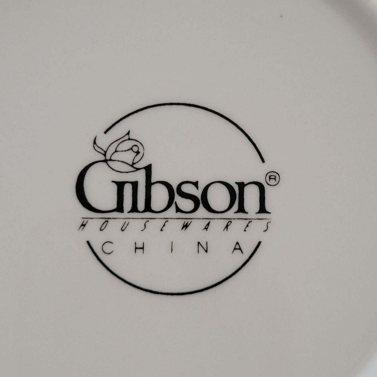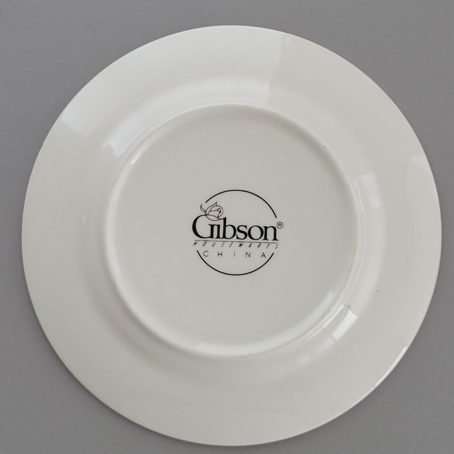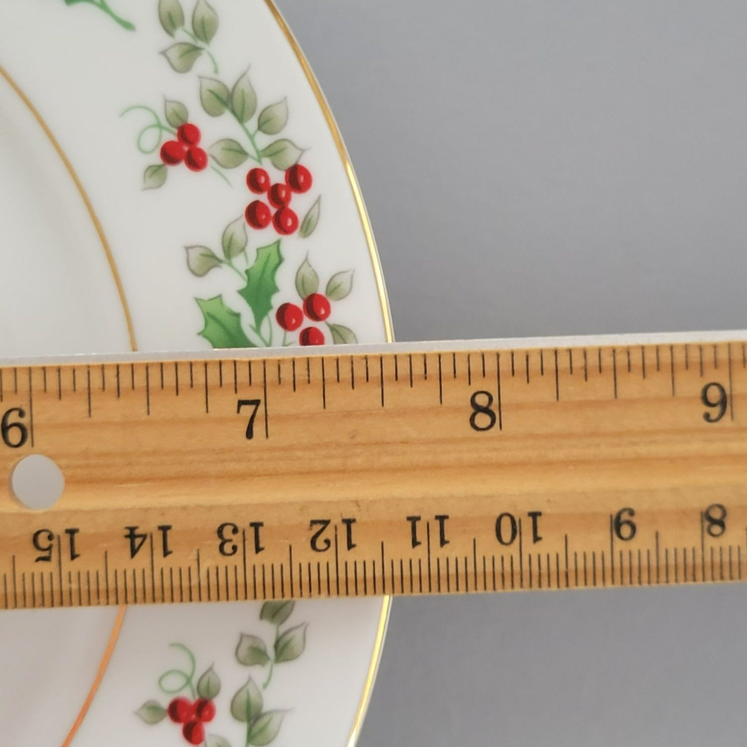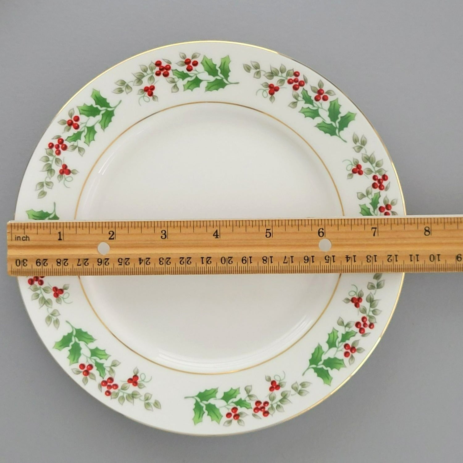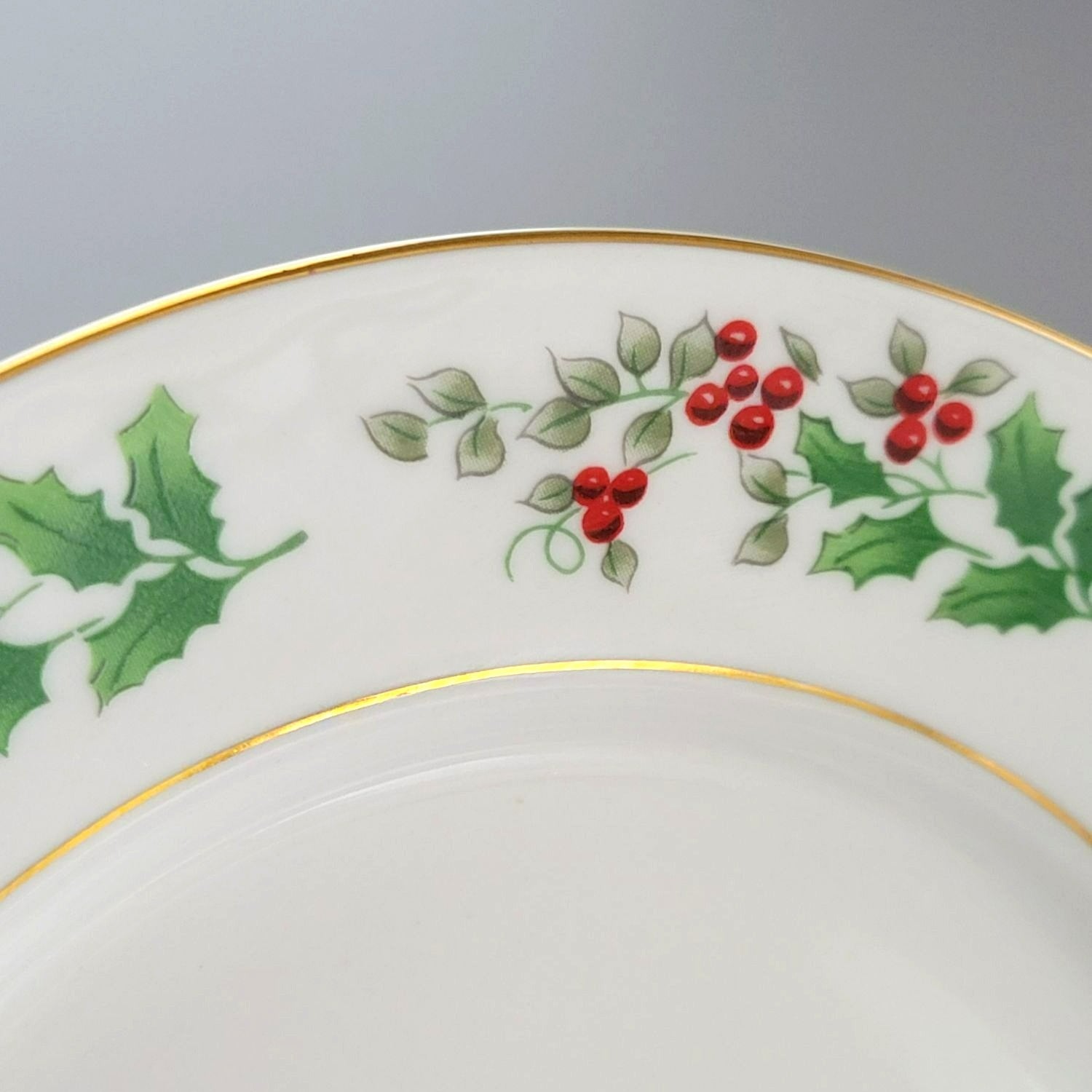 Vintage Gibson Christmas Harmony salad plates featuring holly and berry design with gold trim. Perfect for holiday gatherings or as a replacement for discontinued dinnerware. Add festive charm to your table setting with this classic set.