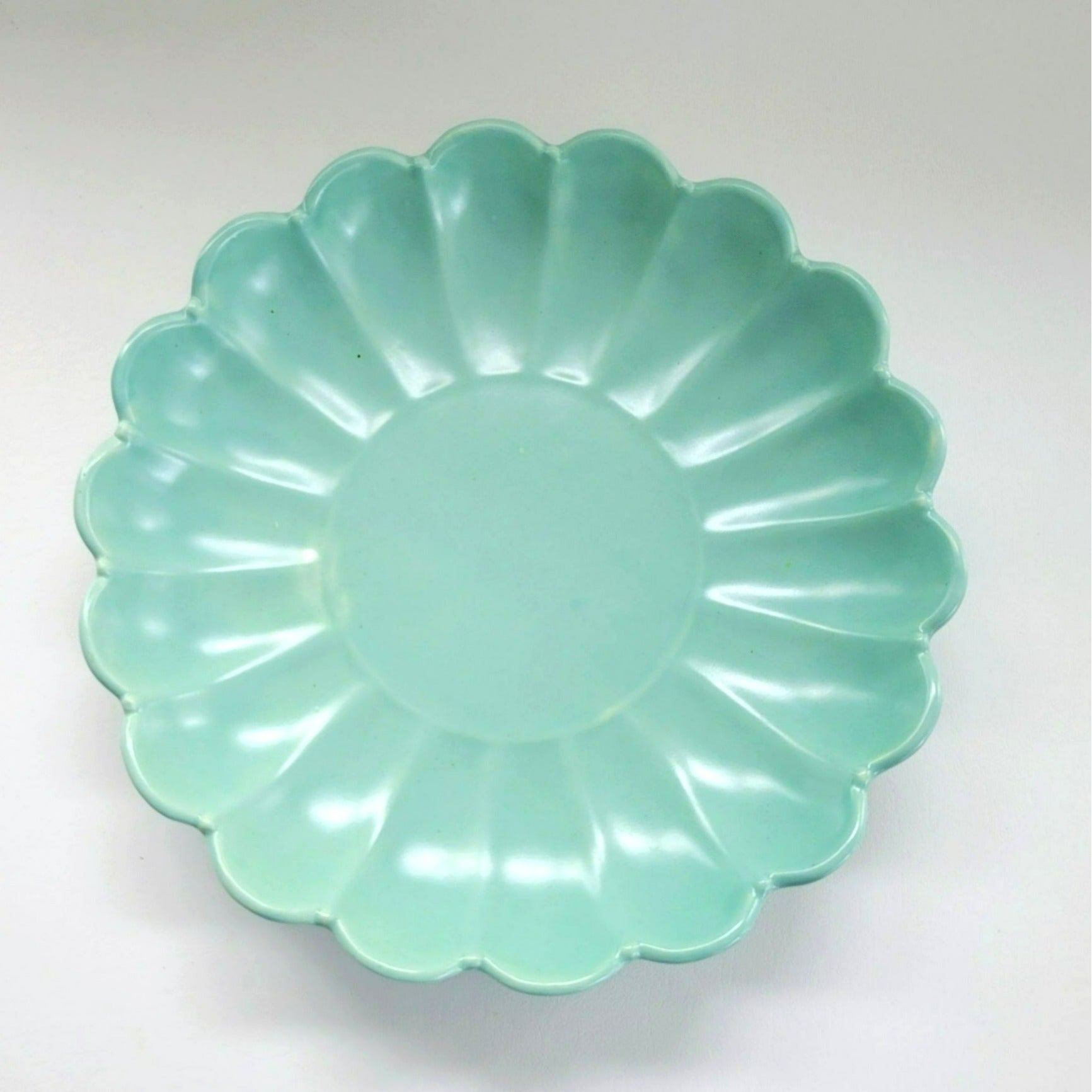 This vintage Haeger Pottery mint green serving platter features a beautiful scalloped design. Made in the USA, it's perfect for adding a touch of elegance to any dining setting or console display. Ideal for collectors and enthusiasts of classic pottery.