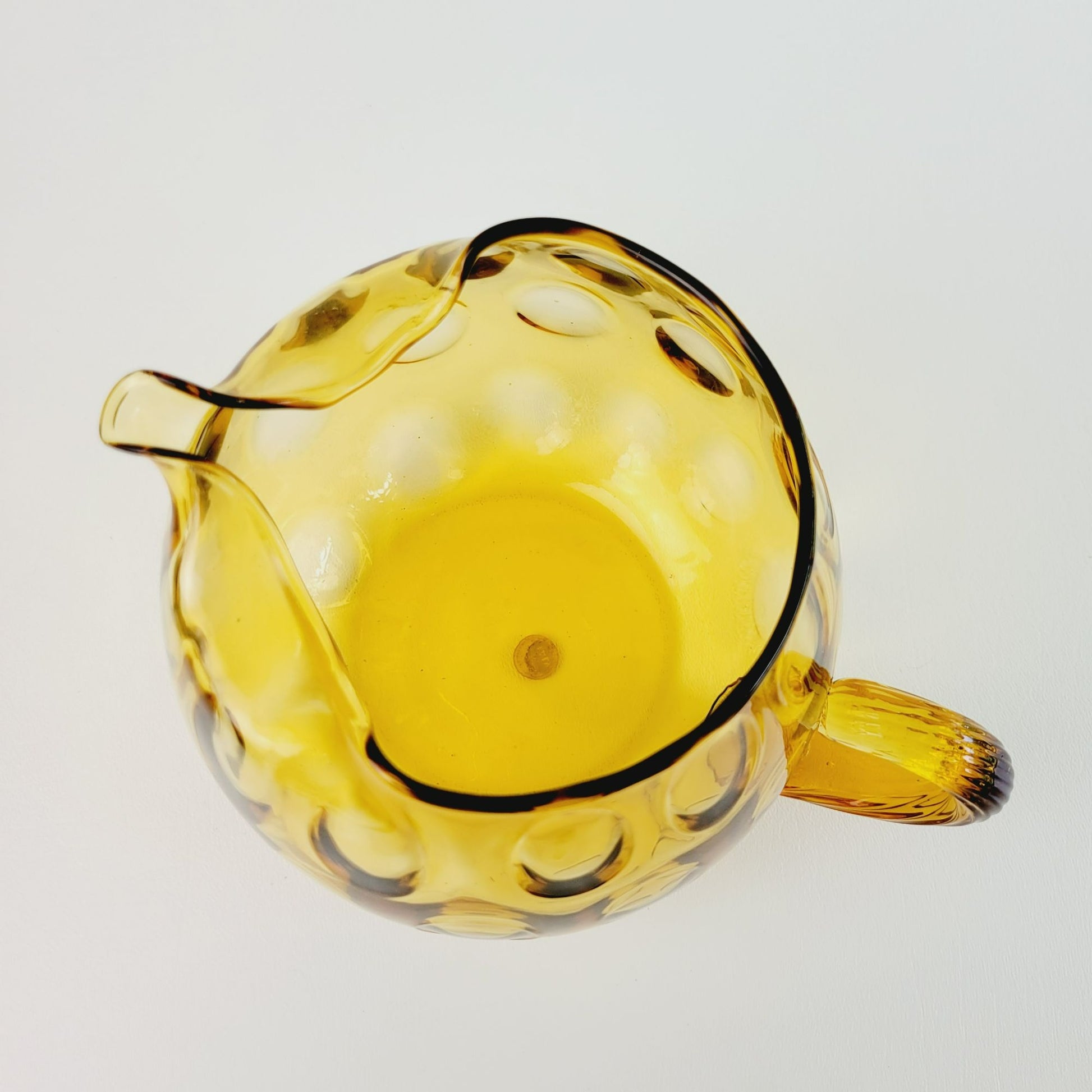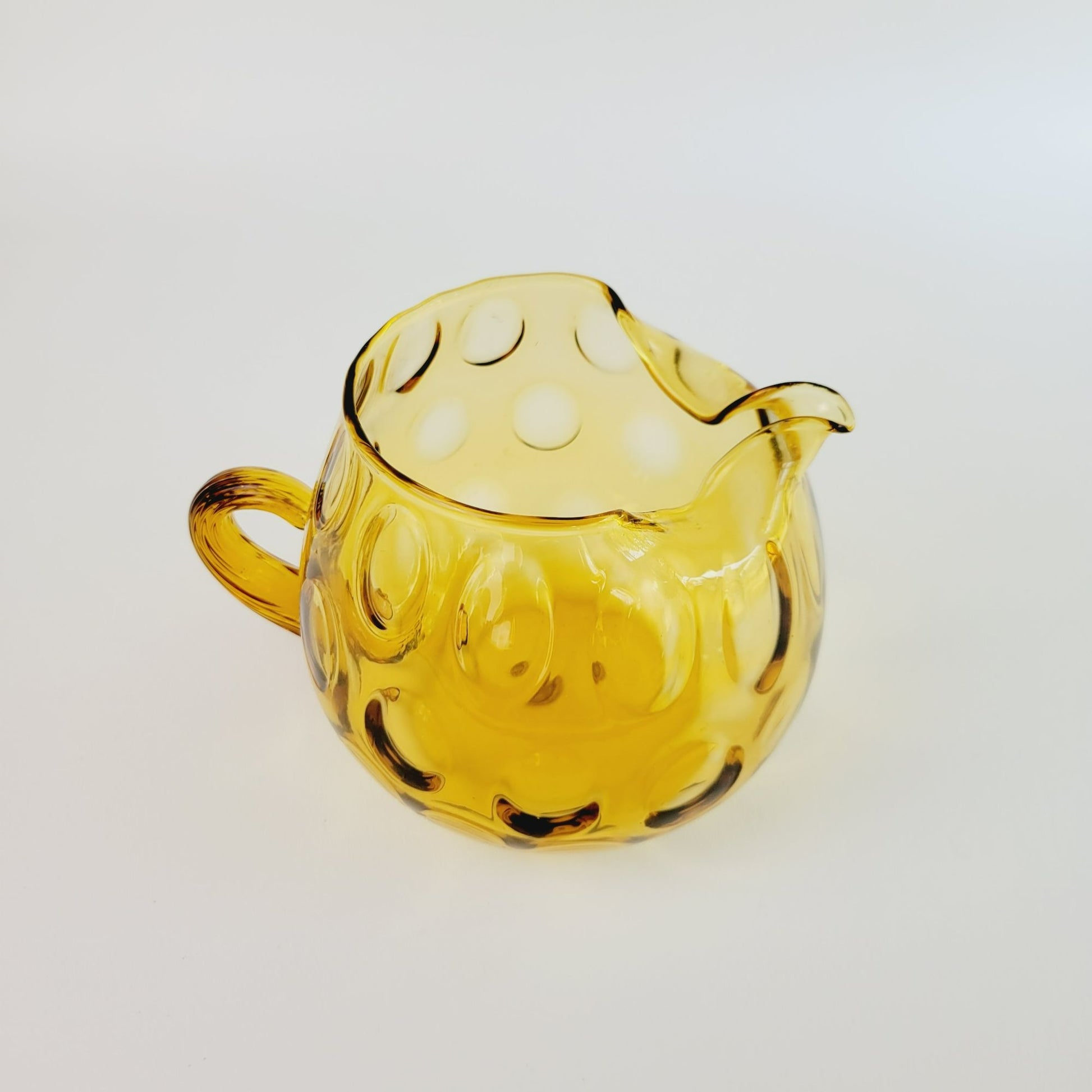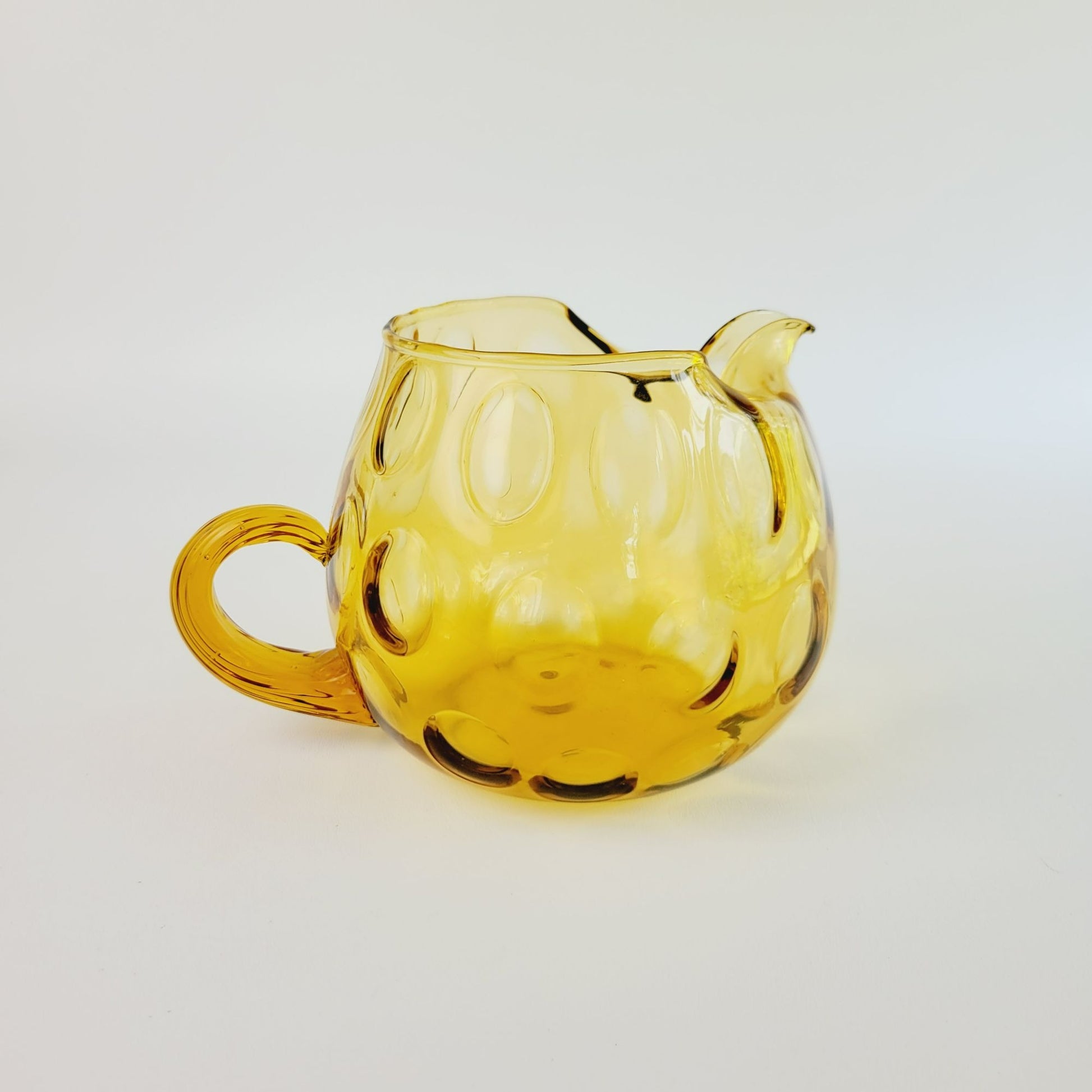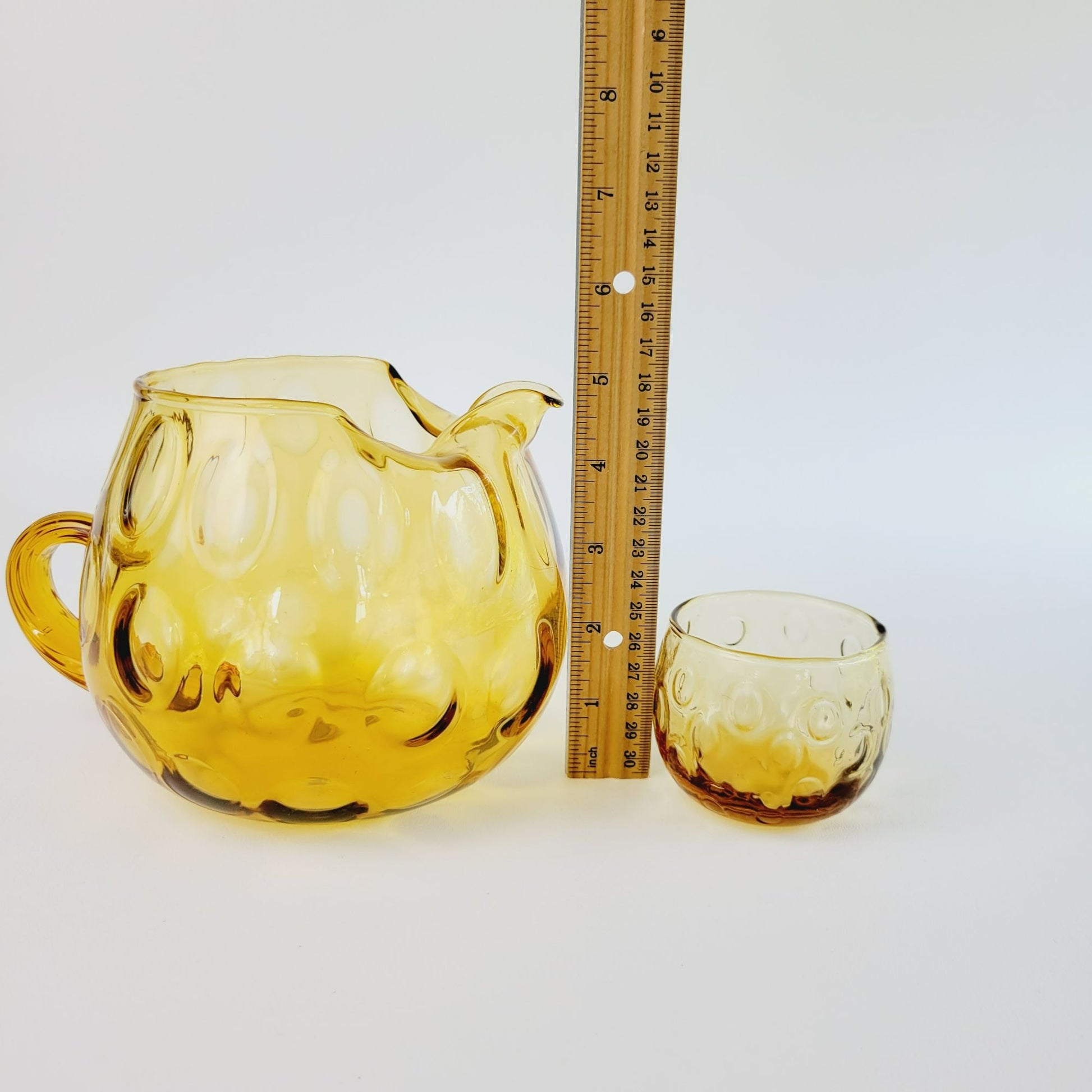 Vintage drinkware set featuring a hand-blown Italian glass pitcher and five amber optic dot juice glasses. The twisted handle adds a unique touch to this summertime drinkware set.