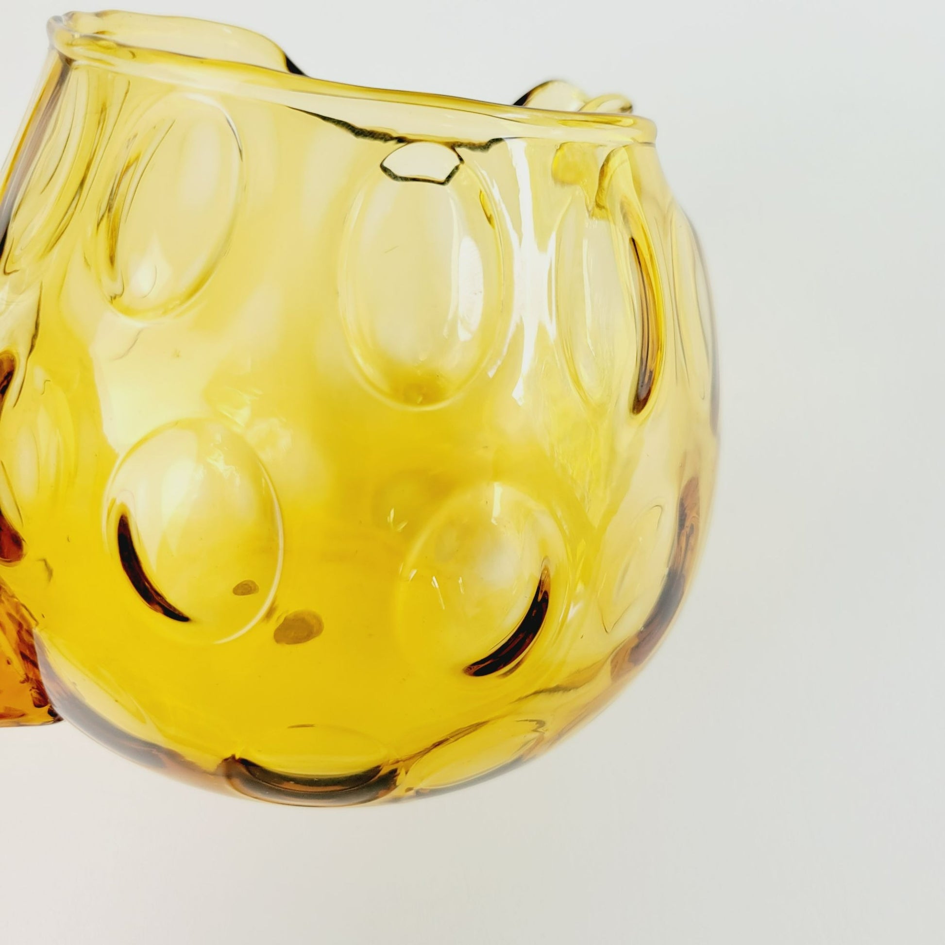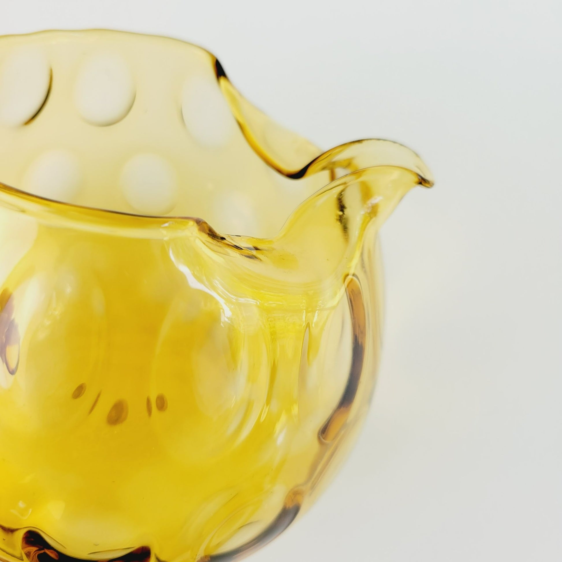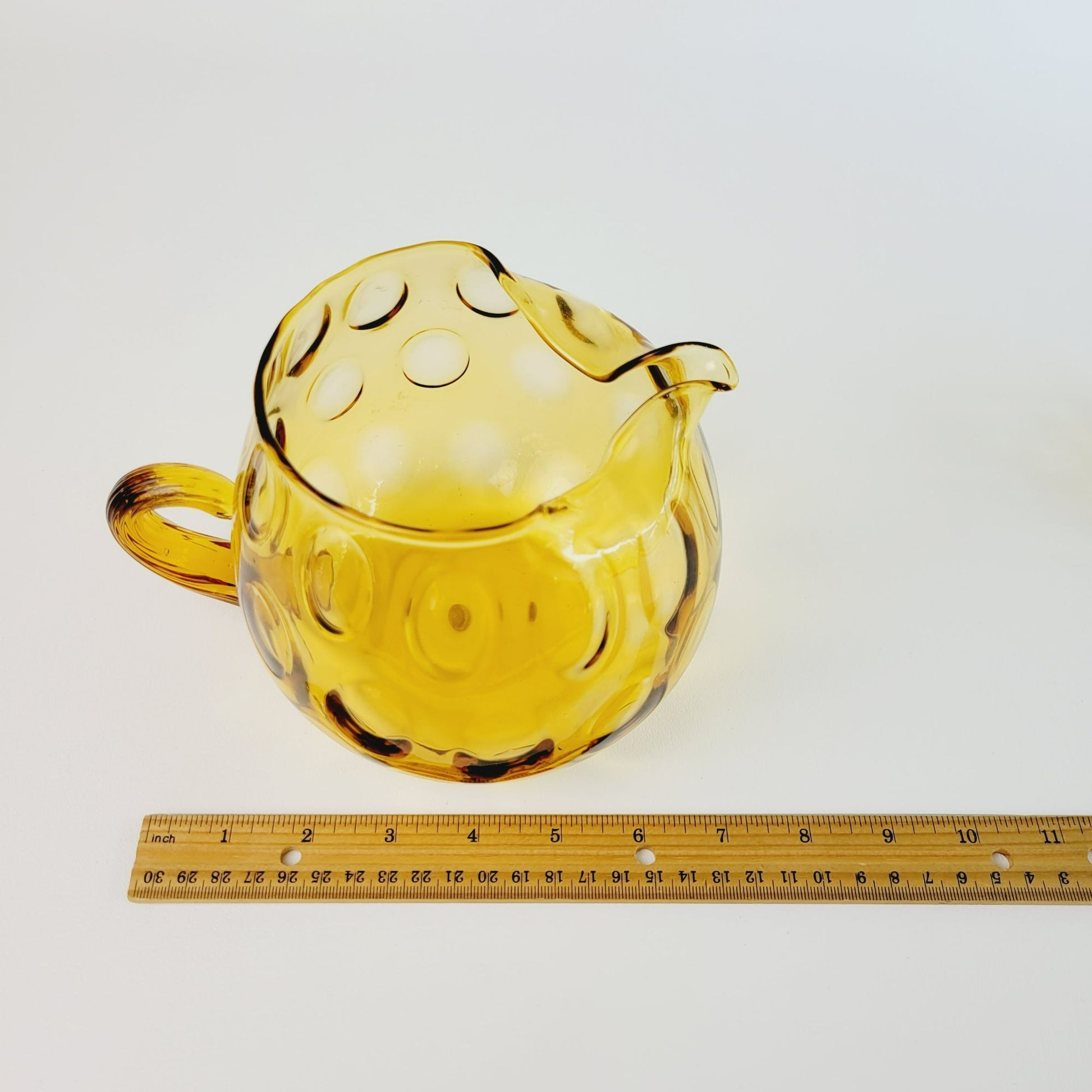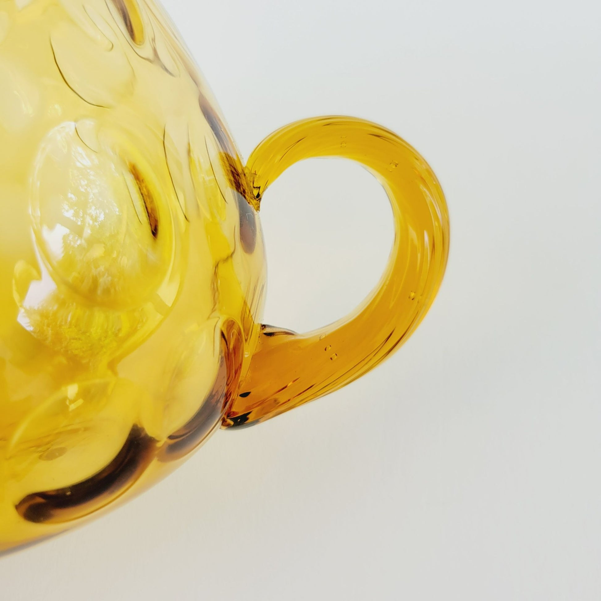 Vintage drinkware set featuring a hand-blown Italian glass pitcher and five amber optic dot juice glasses. The twisted handle adds a unique touch to this summertime drinkware set.