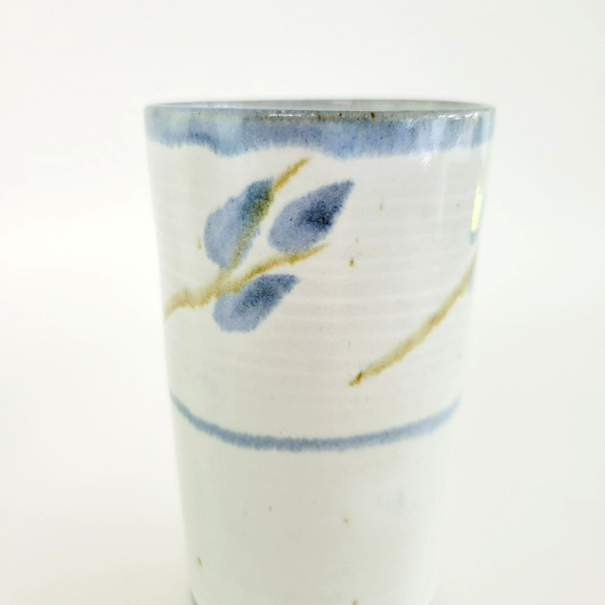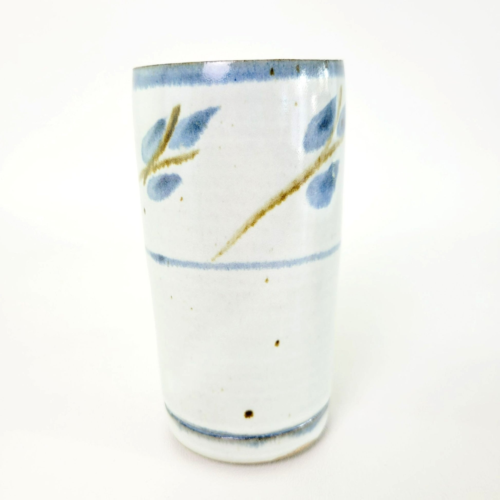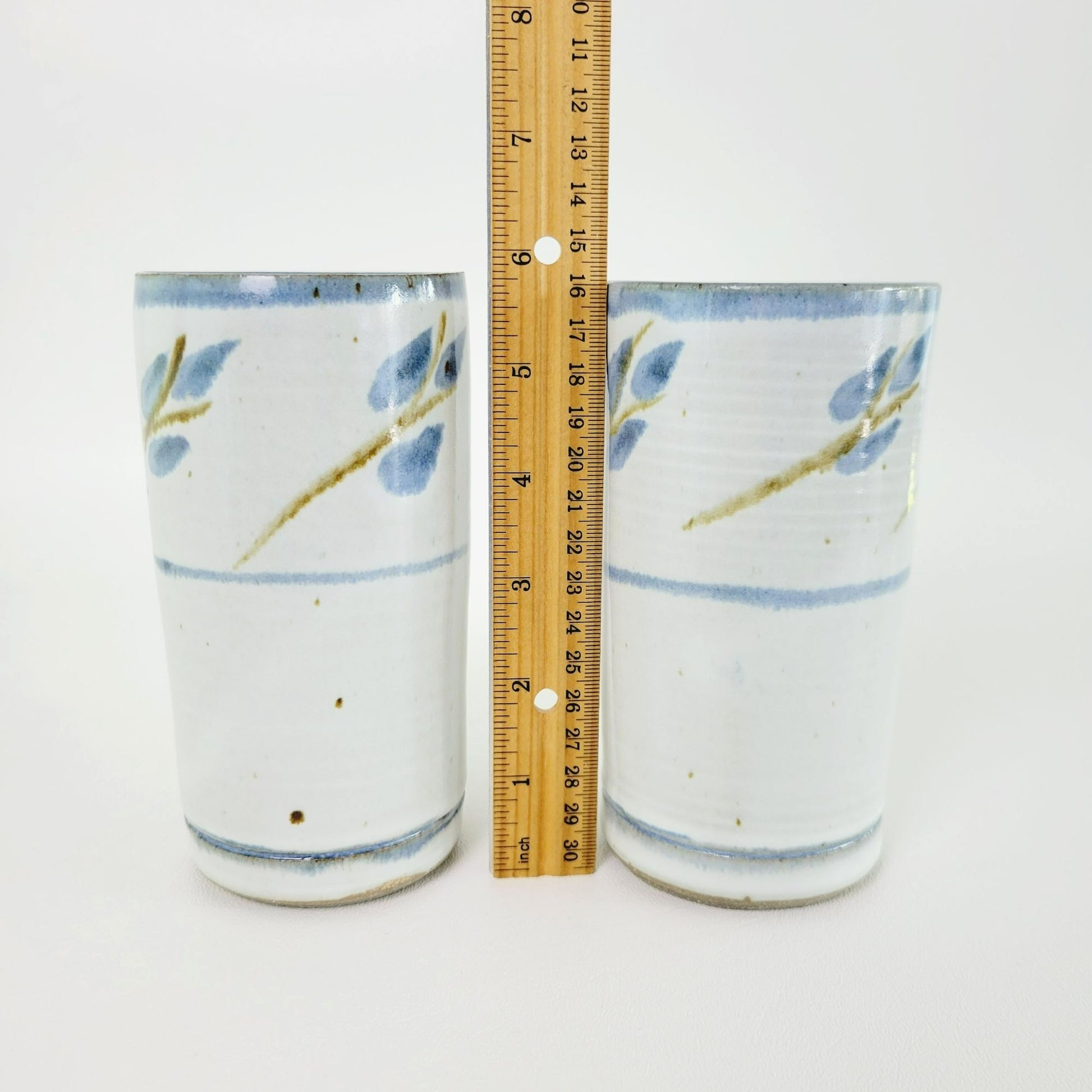 Distinctive handcrafted ceramic stoneware tumblers or vases, in a set of 2. Beautifully decorated in blue, gray and green with a leaf motif, signed by the artist. Makes an elegant addition to any home décor.
