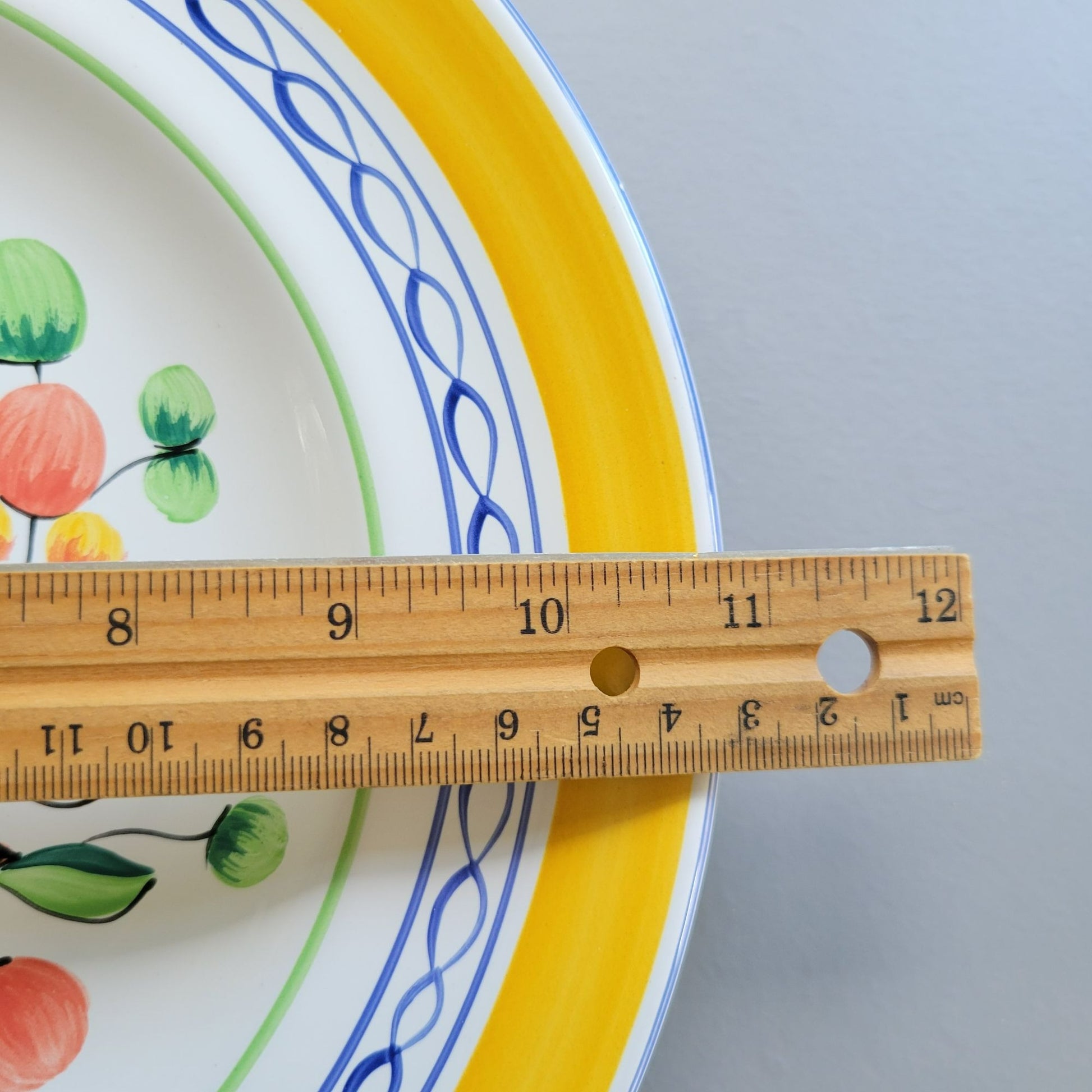 Add a touch of whimsy to your table with this vintage Herend Village Pottery Morning Song dinner plate. Hand-painted with a delightful bird and floral motif, it features a vibrant yellow and blue band. Made in Hungary, this plate is perfect for collectors and dinner party hosts.