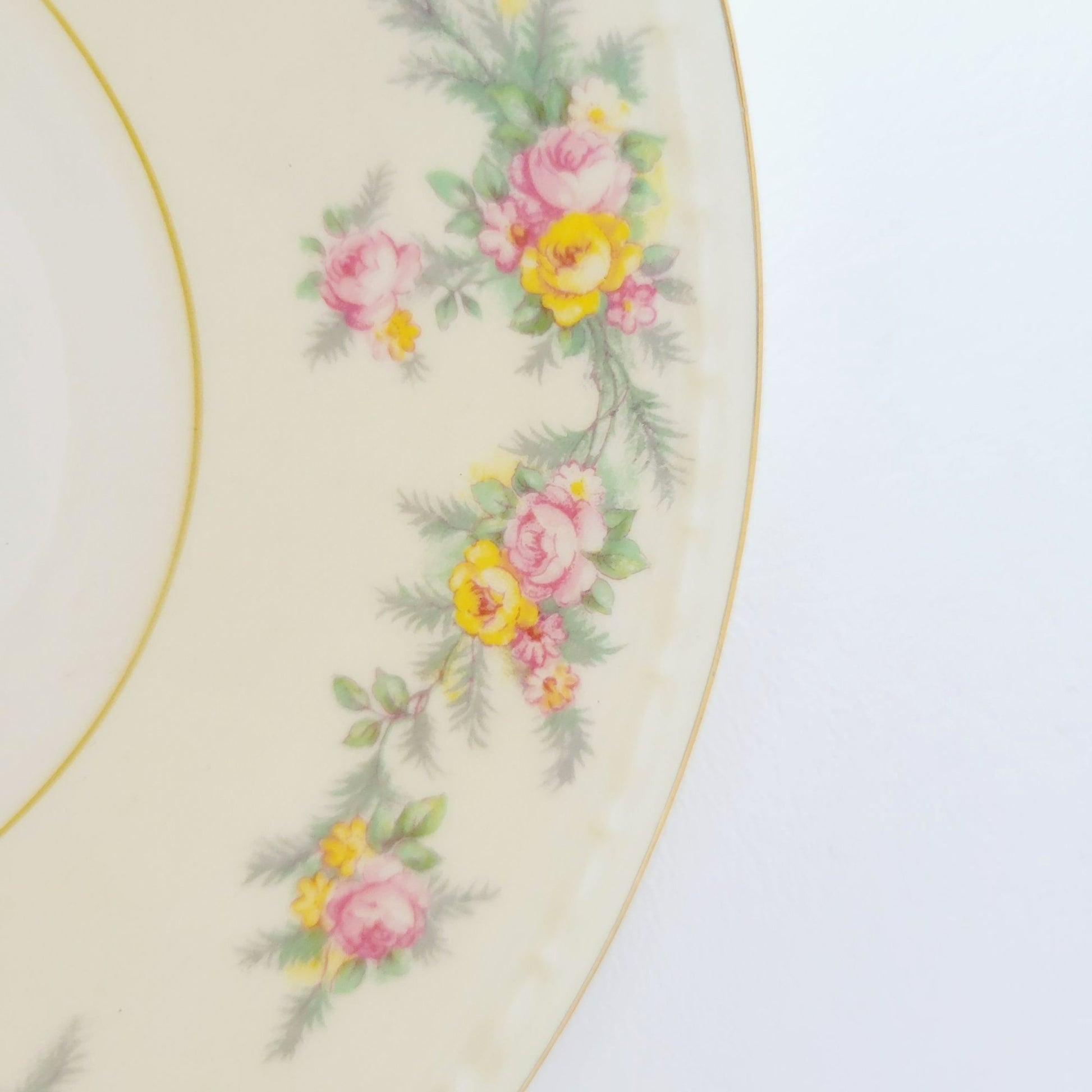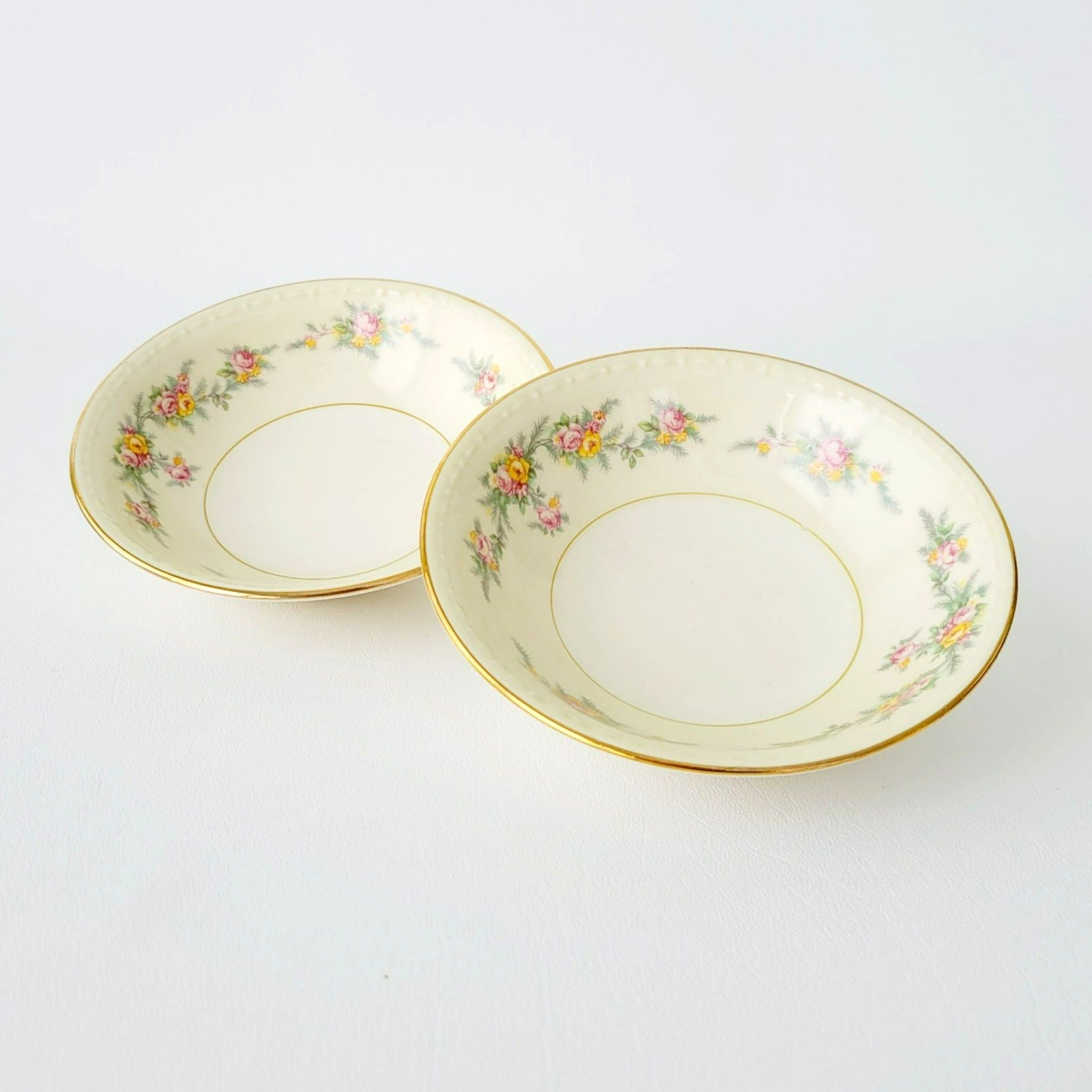 These vintage 1953 berry bowls by Homer Laughlin are a delightful addition to any table. The Eggshell Georgian design features soft hues of pink and yellow roses adorned with gold edging. Made in USA, these 6.25" plates are crafted from semi vitreous porcelain.