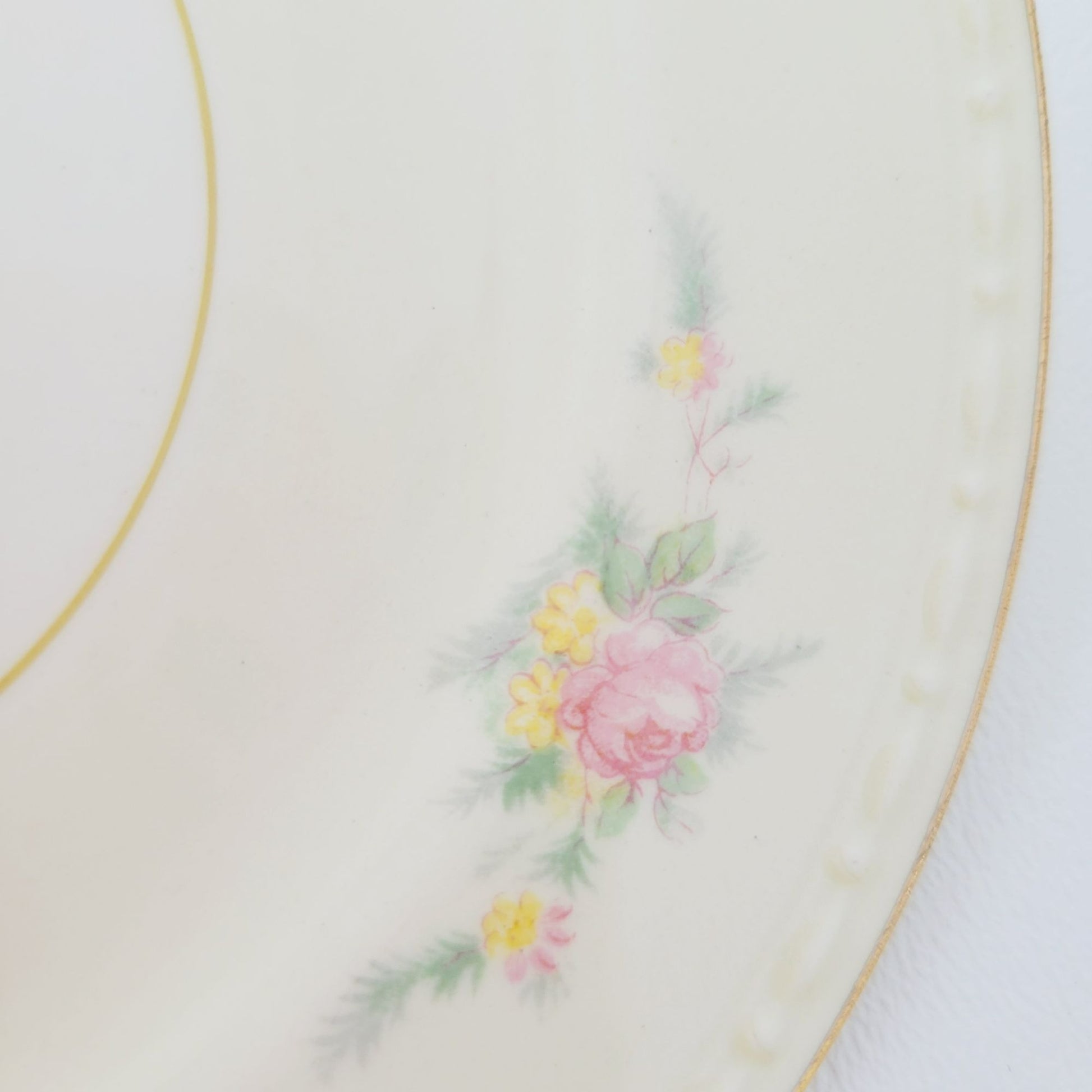 These vintage 1952 bread plates by Homer Laughlin are a delightful addition to any table. The Eggshell Georgian design features soft hues of pink and yellow roses adorned with gold edging. Made in USA, these 6.25" plates are crafted from semi vitreous porcelain.