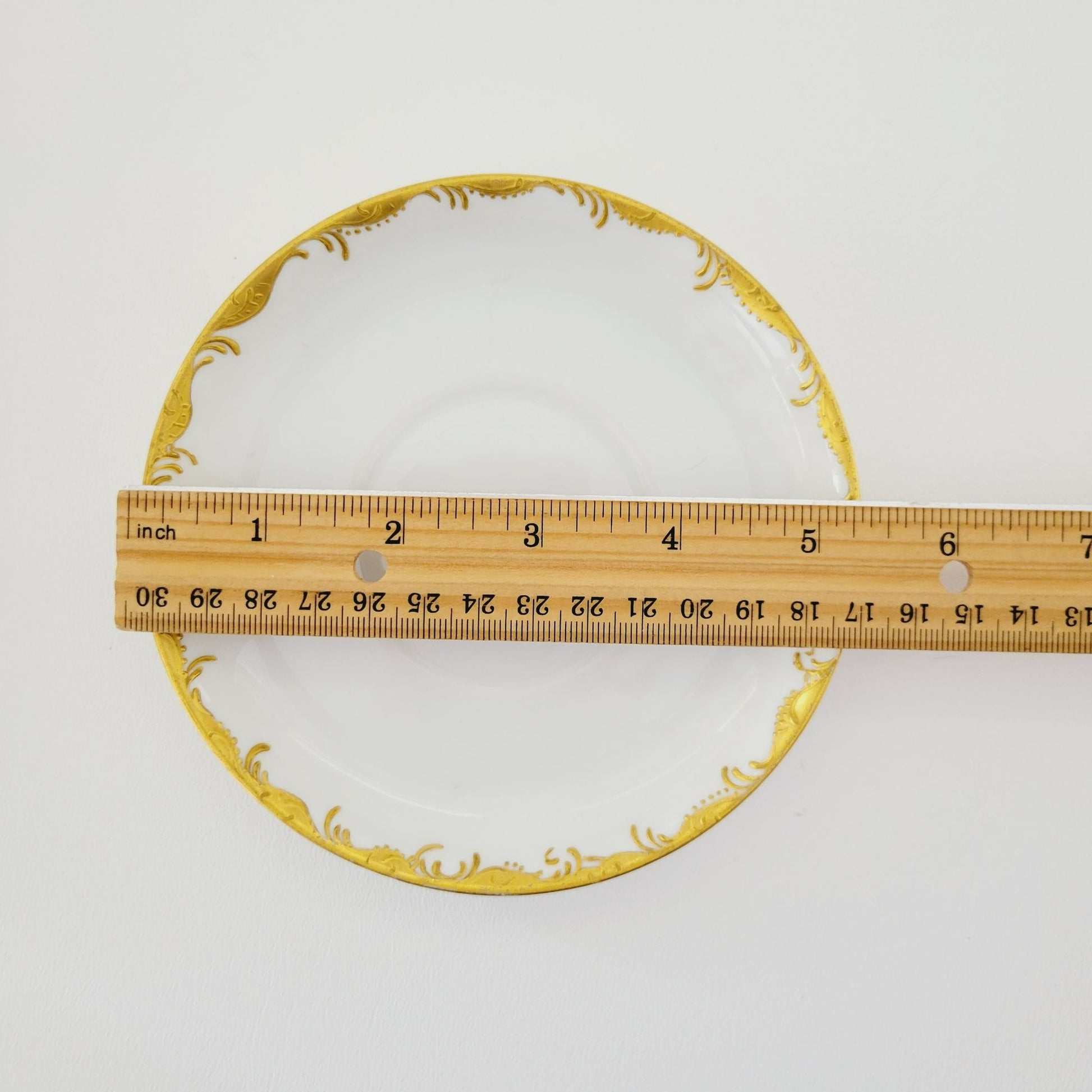 This Hutschenreuther White & Gold Footed Dessert Bowl and Saucers set, hand-painted in Bavaria Germany, features Art Nouveau design with gold accents. Made from exquisite porcelain, each item holds 4 fl. oz.