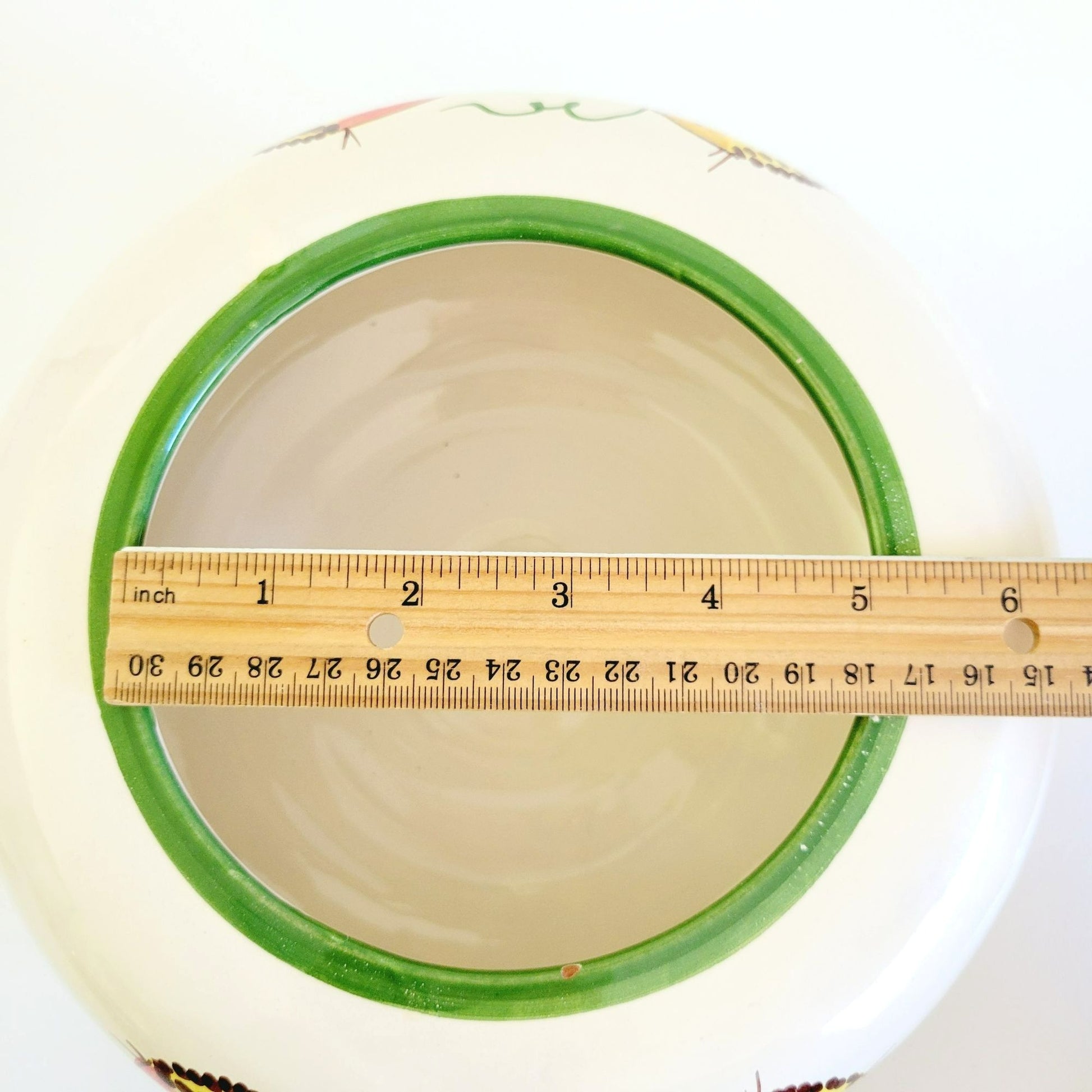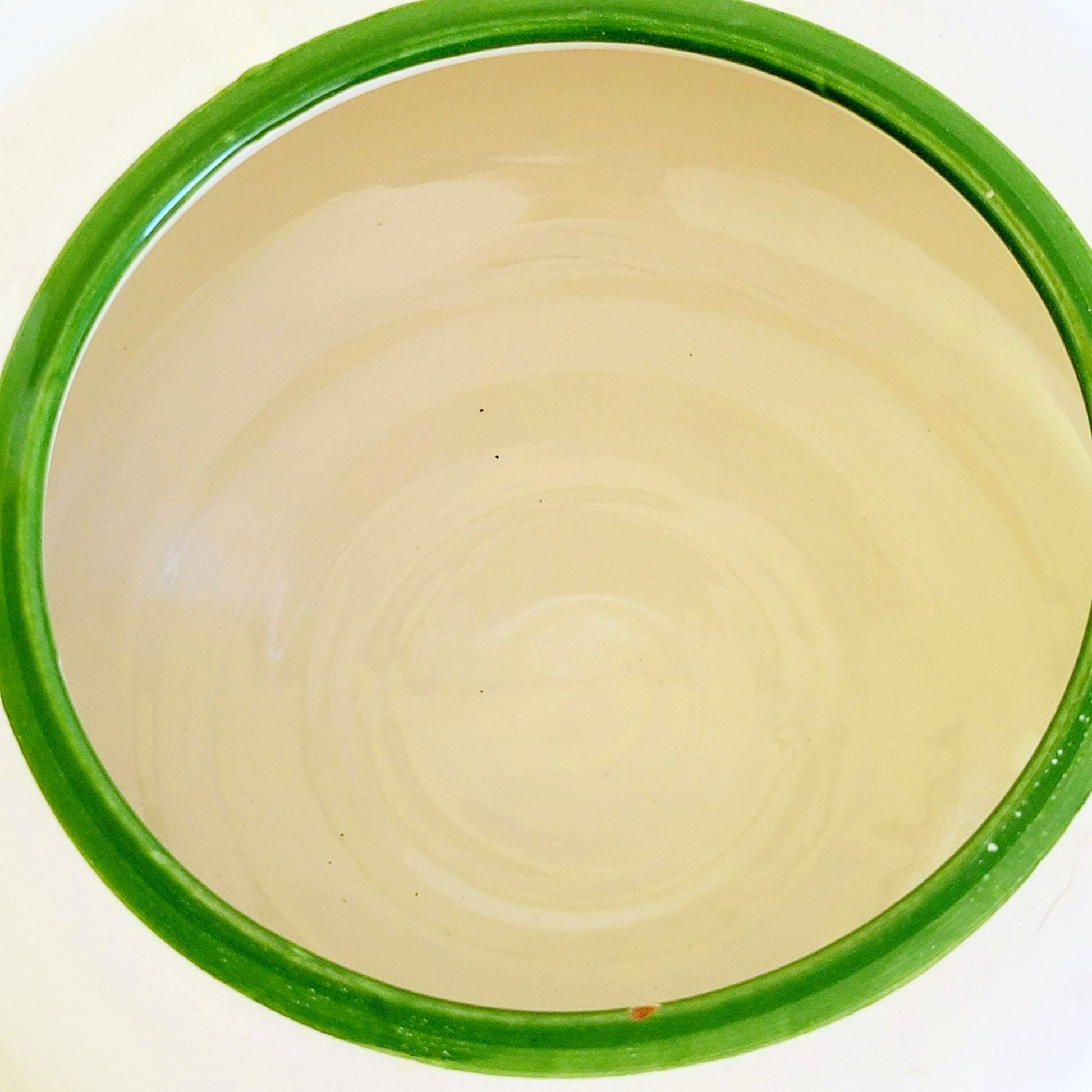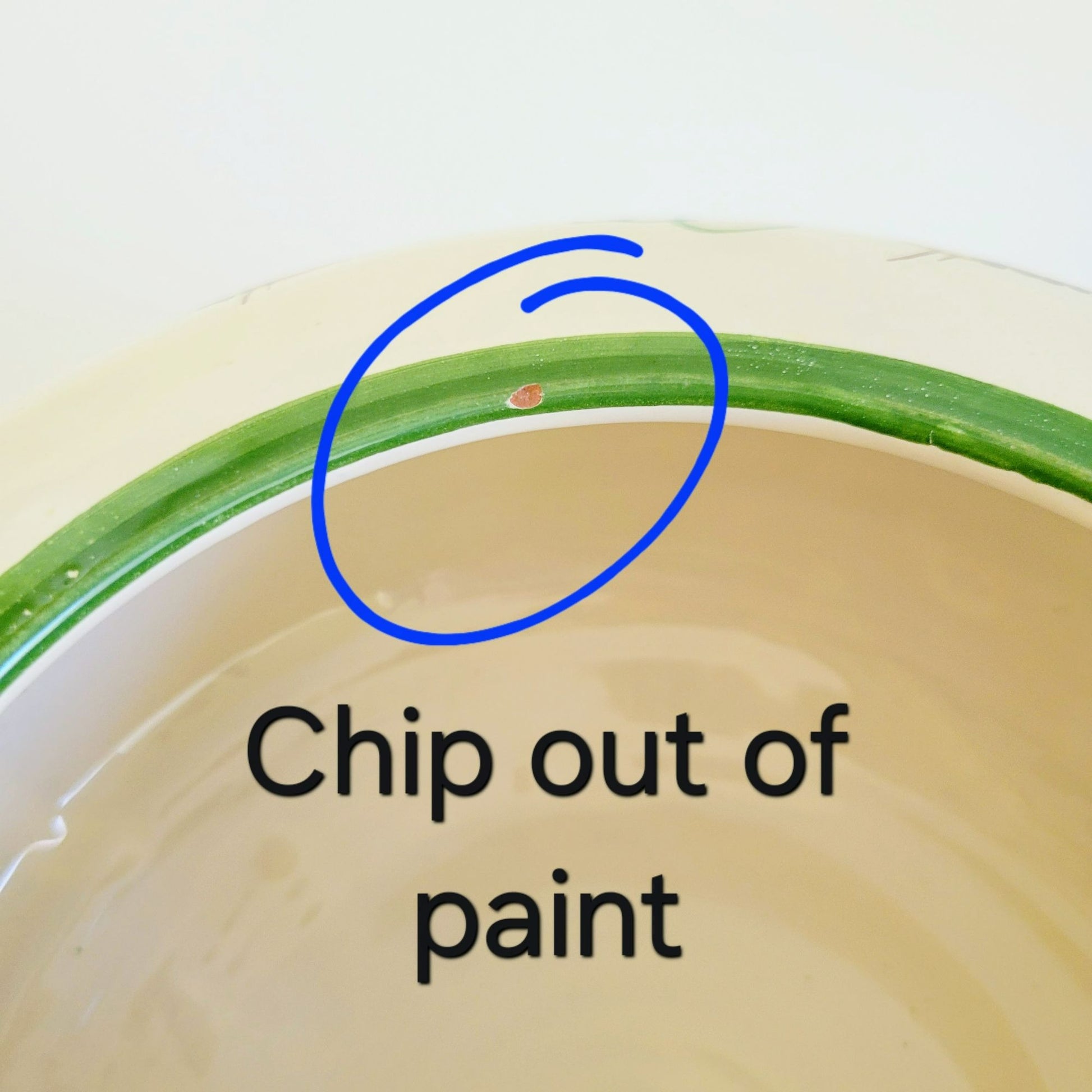Jar is in good condition with no cracks or chips in the pottery, however there is a chip out of the green paint on the inside edge (see photo).