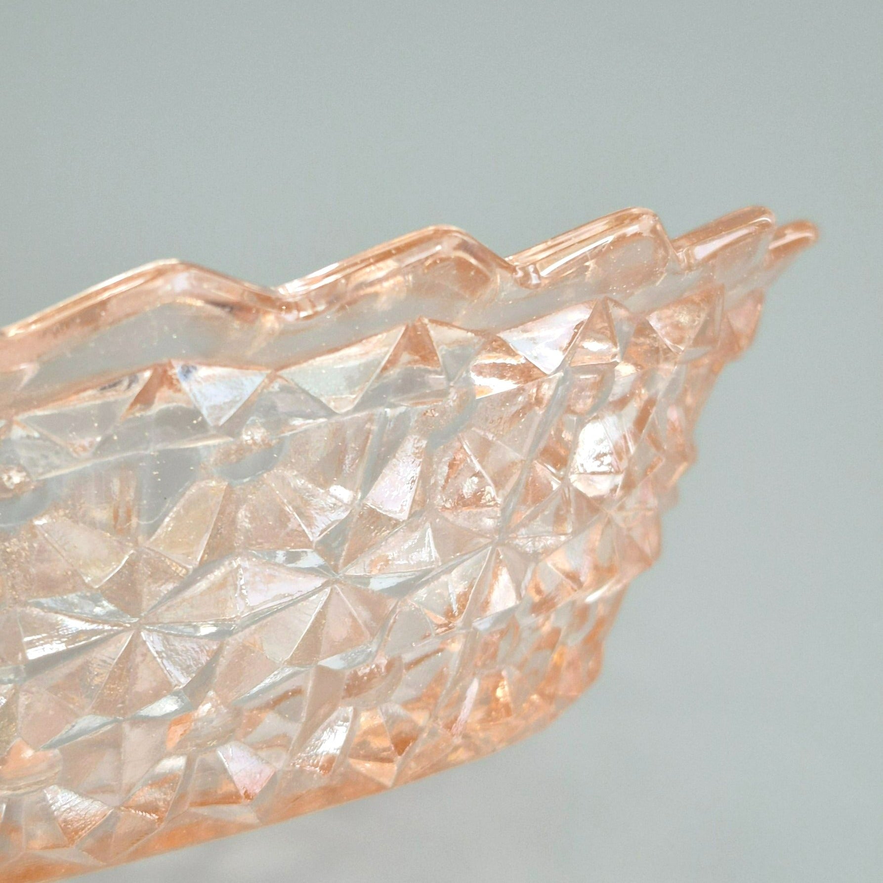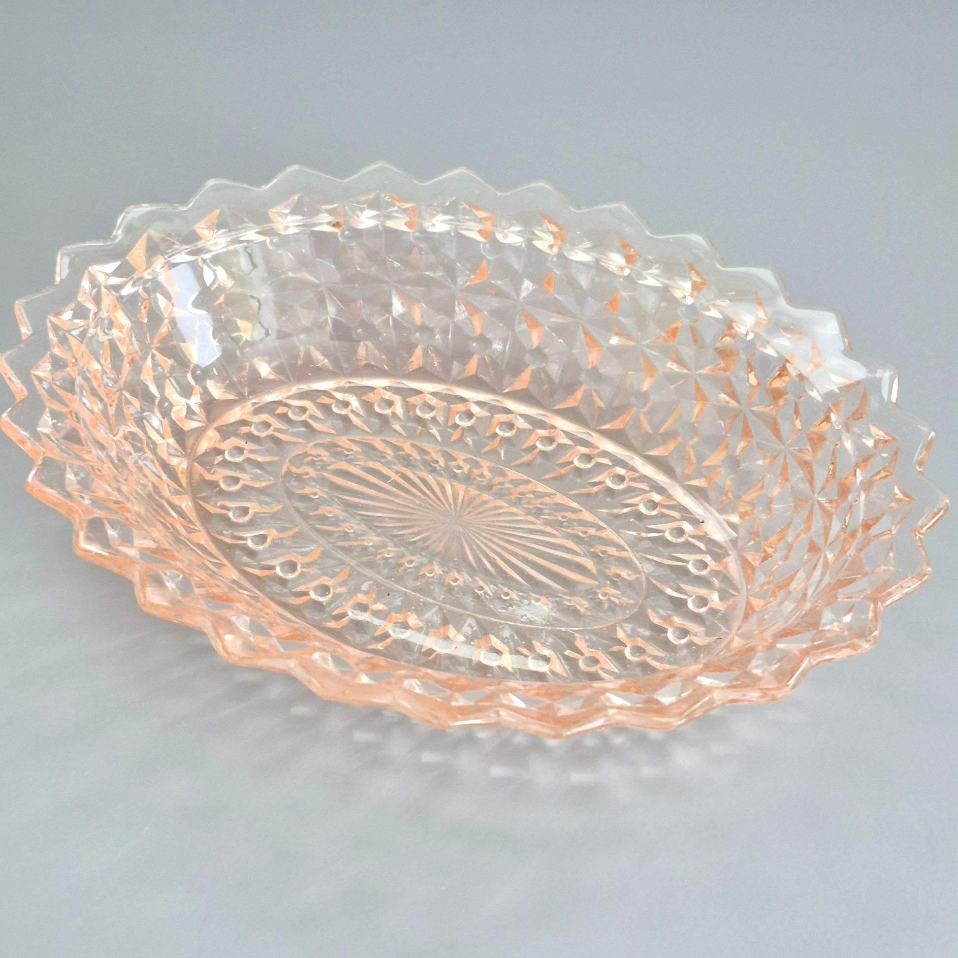 This vintage Jeannette Holiday Pink Oval Serving Bowl set features a stunning Button & Bow design. Produced in the USA between the 1940s-60s, it’s a collectible piece of colored glassware, perfect for display or use in your dining collection.