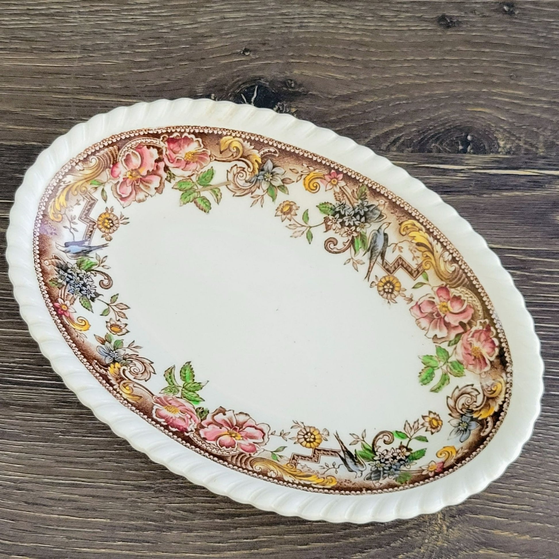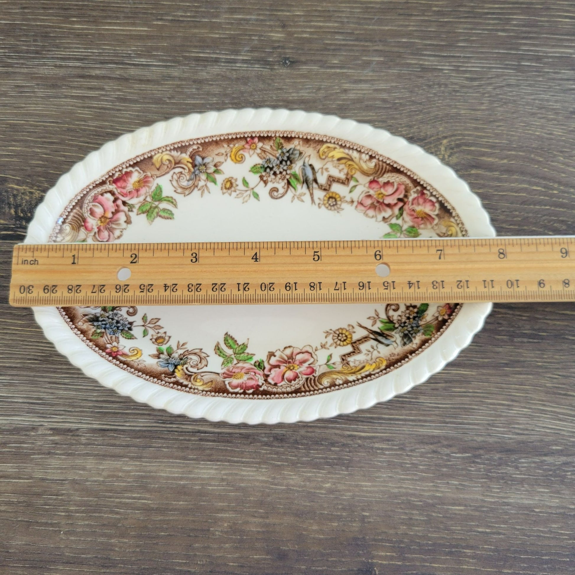 Exquisite vintage gravy boat & underplate from Johnson Bros, featuring a charming Old English multicolor bird & floral pattern with an gadroon edge. Made in England, perfect for adding a touch of elegance to your dining.