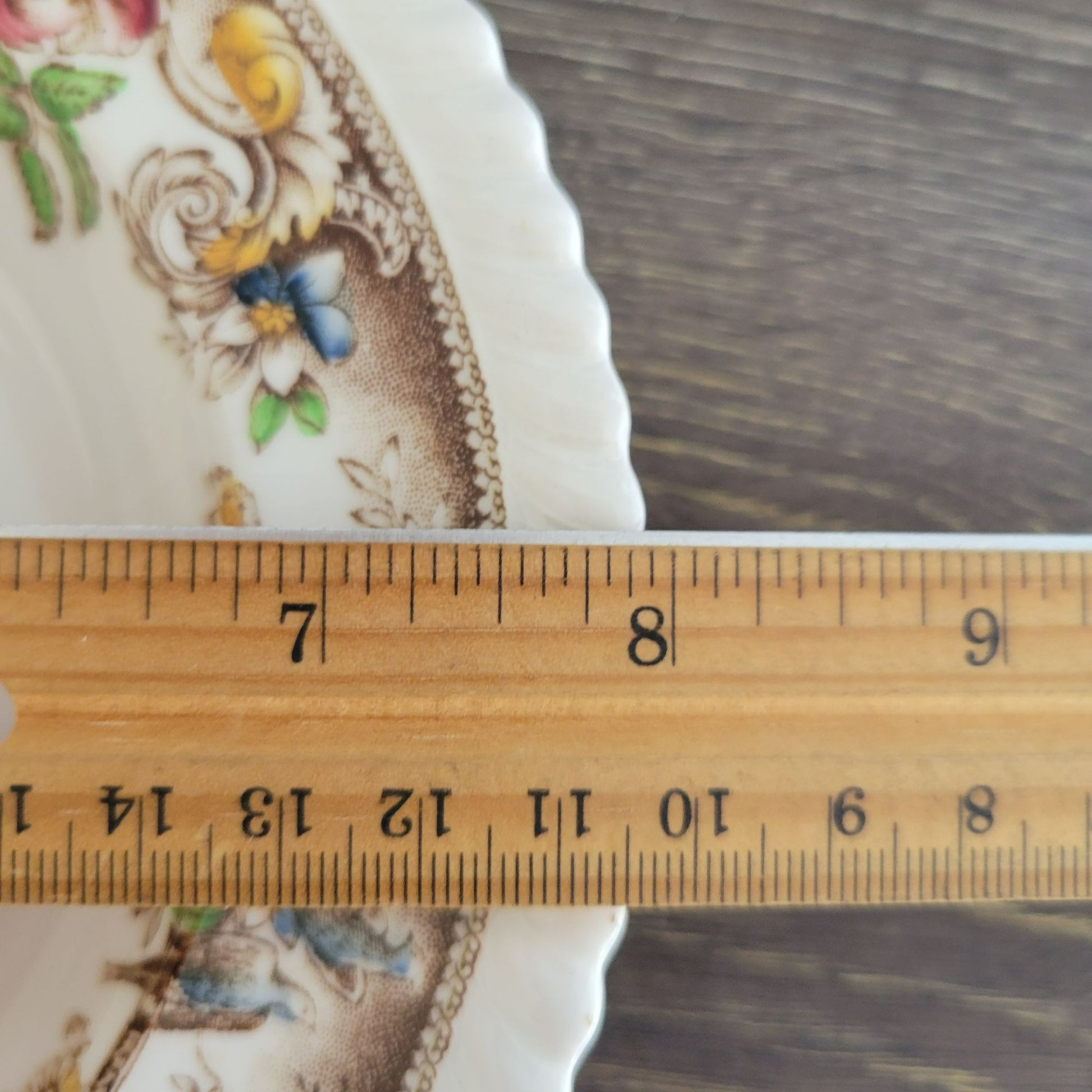 Exquisite vintage rimmed soup bowl set from Johnson Bros, featuring a charming Old English multicolor bird & floral pattern with an gadroon edge. Made in England, perfect for adding a touch of elegance to your dining.