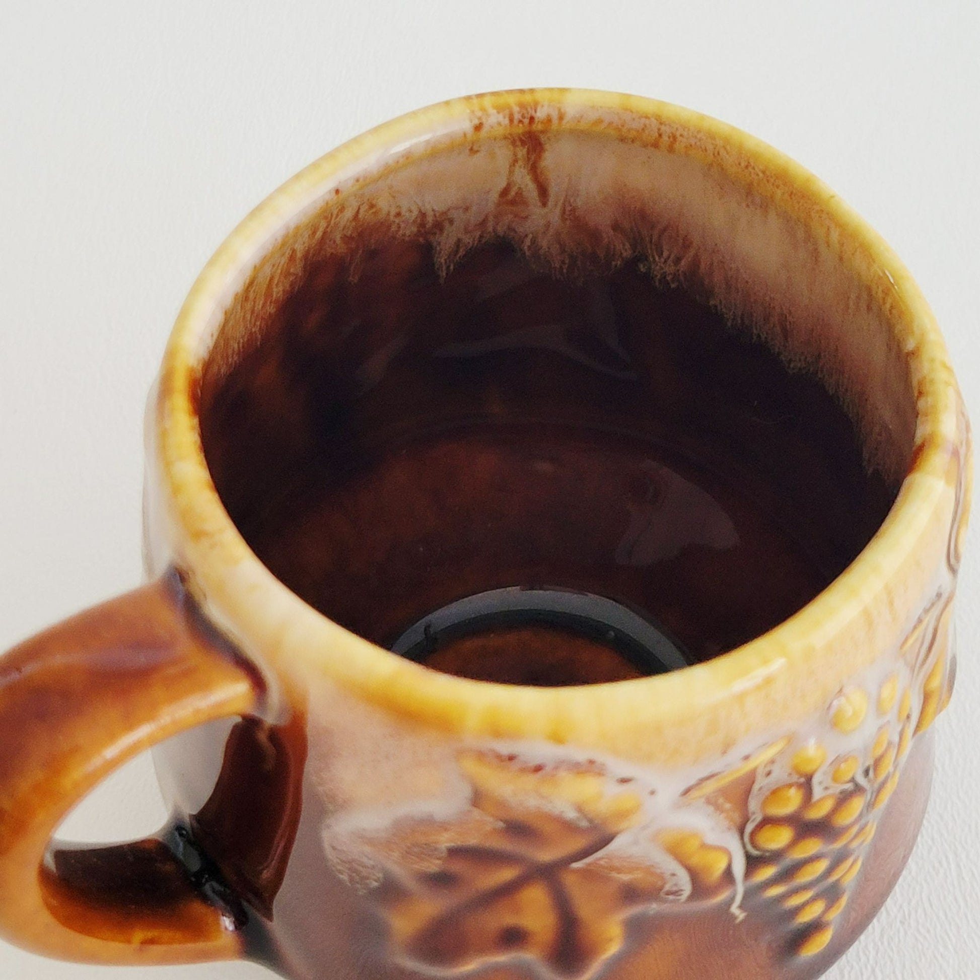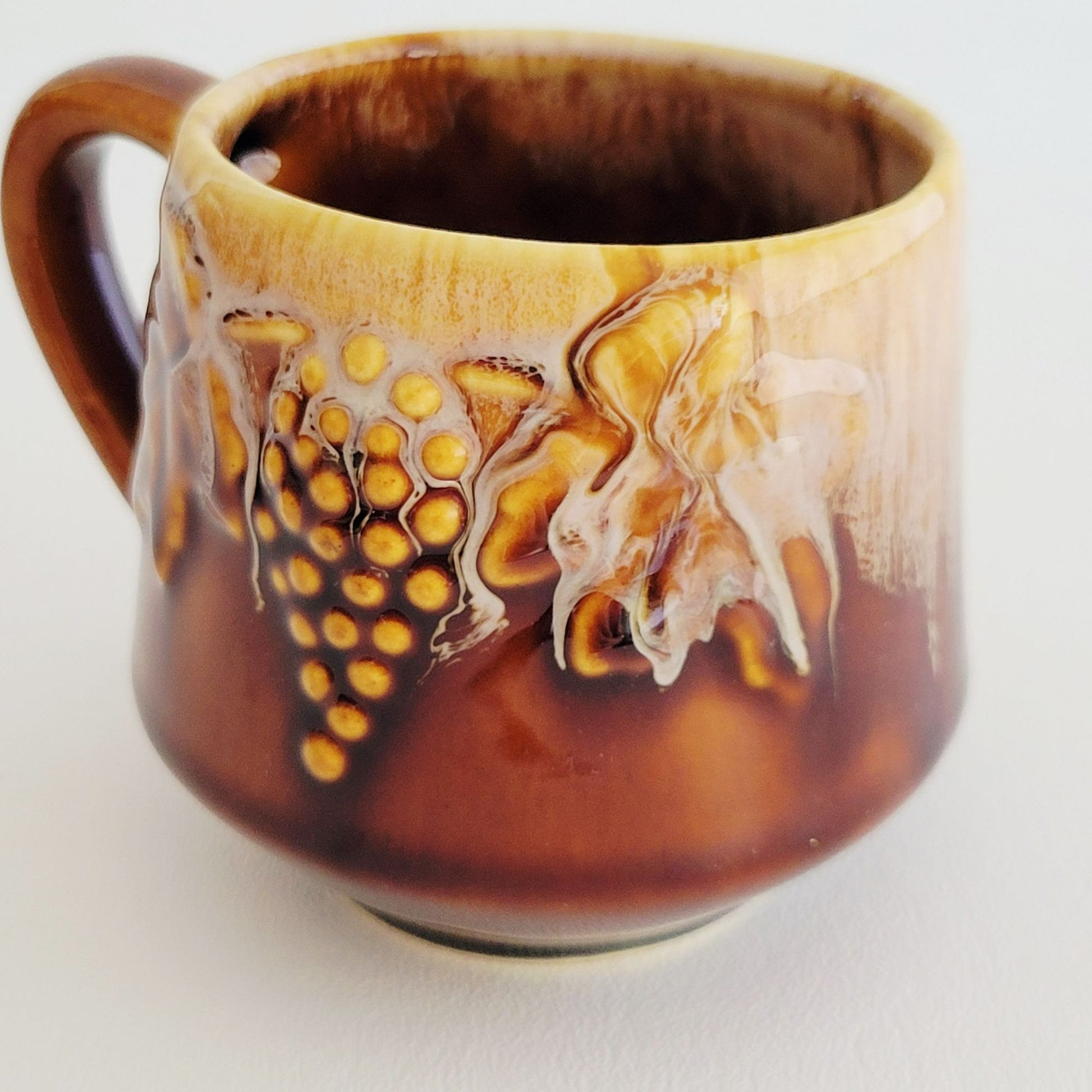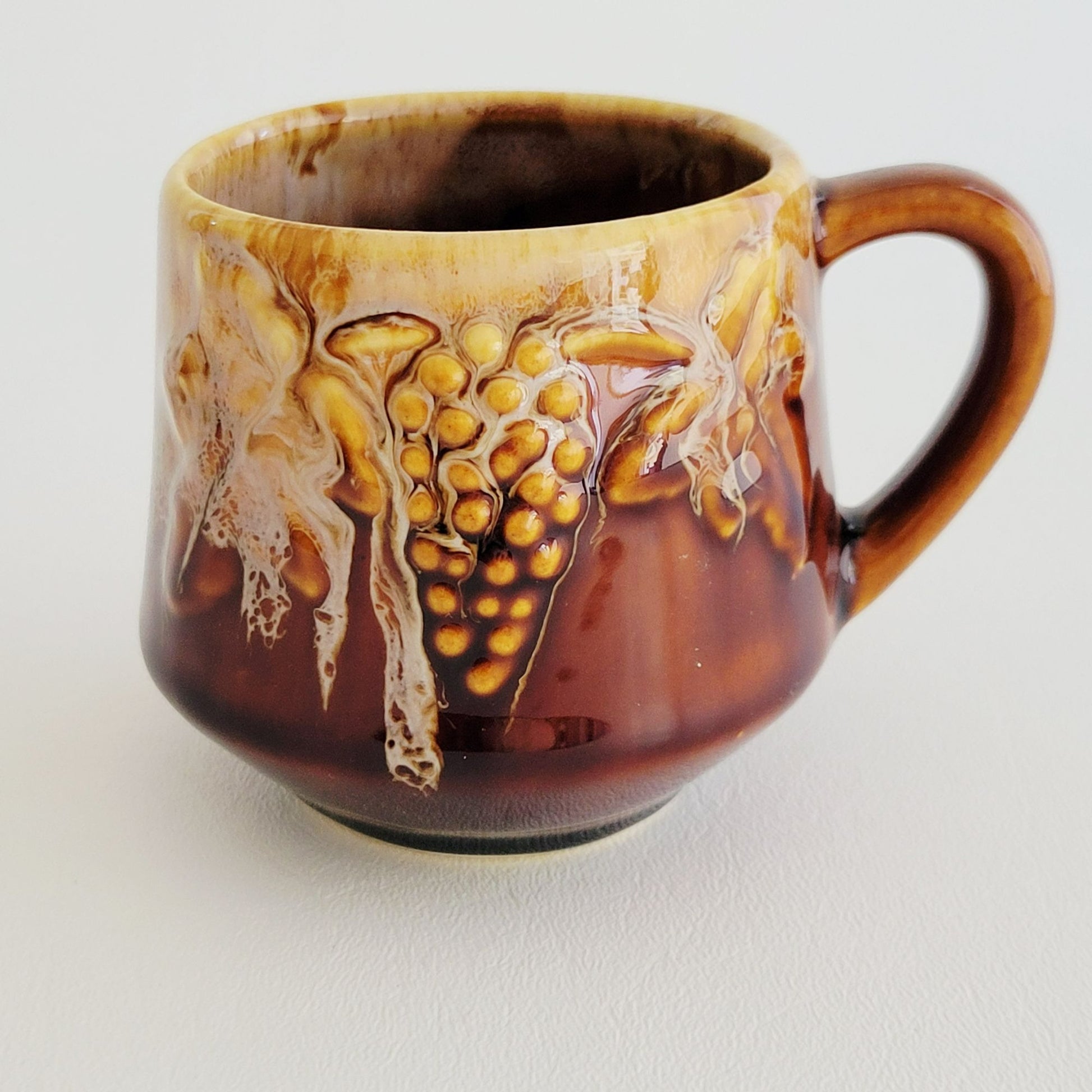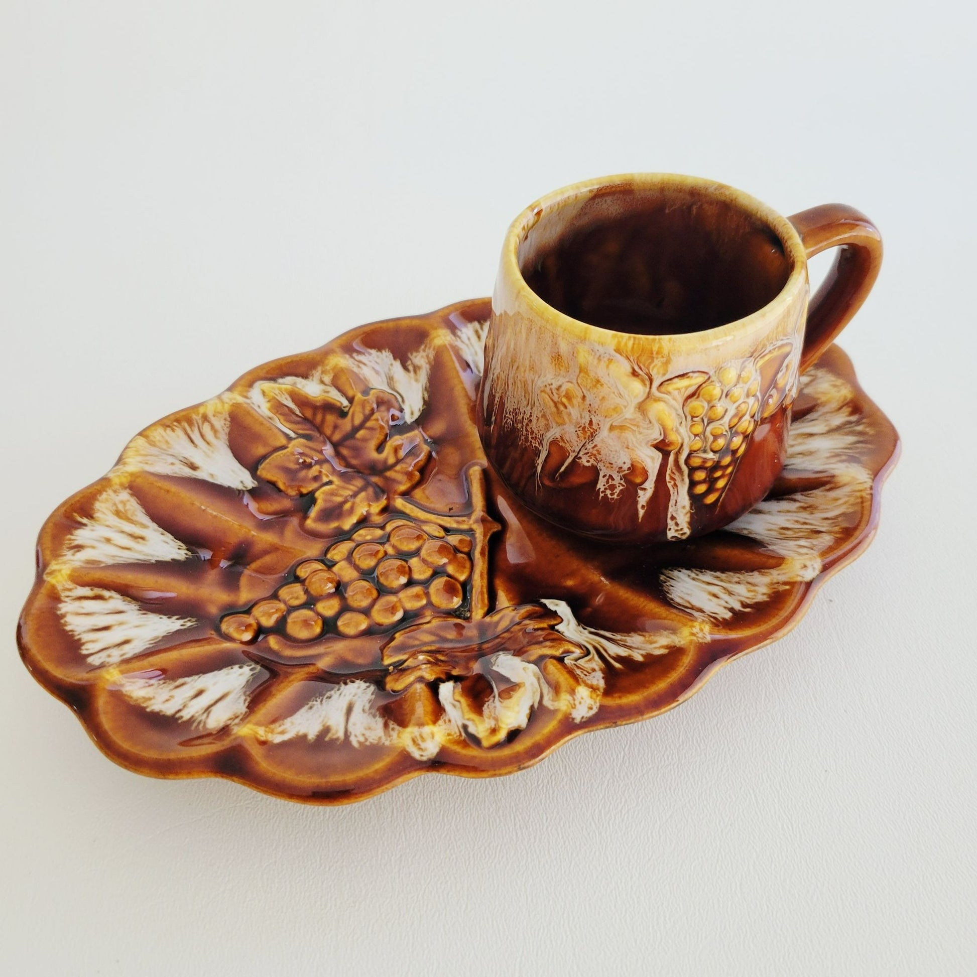 Enhance your vintage collection with two sets of Kingwood Ceramics brown snack plates and cups. Featuring an embossed grape and leaf design with a USA-made drip glaze finish, these pieces are perfect for any retro-themed gathering.