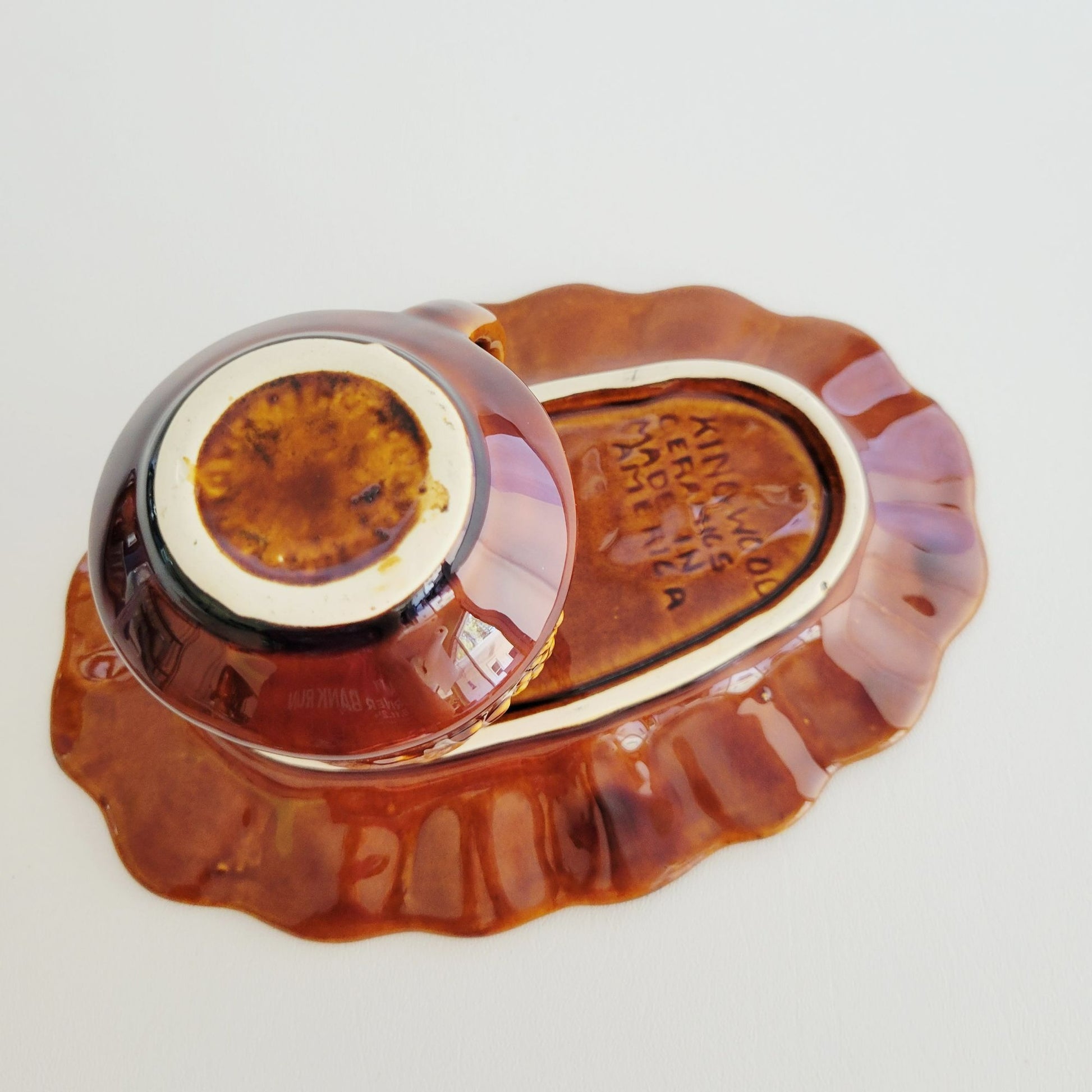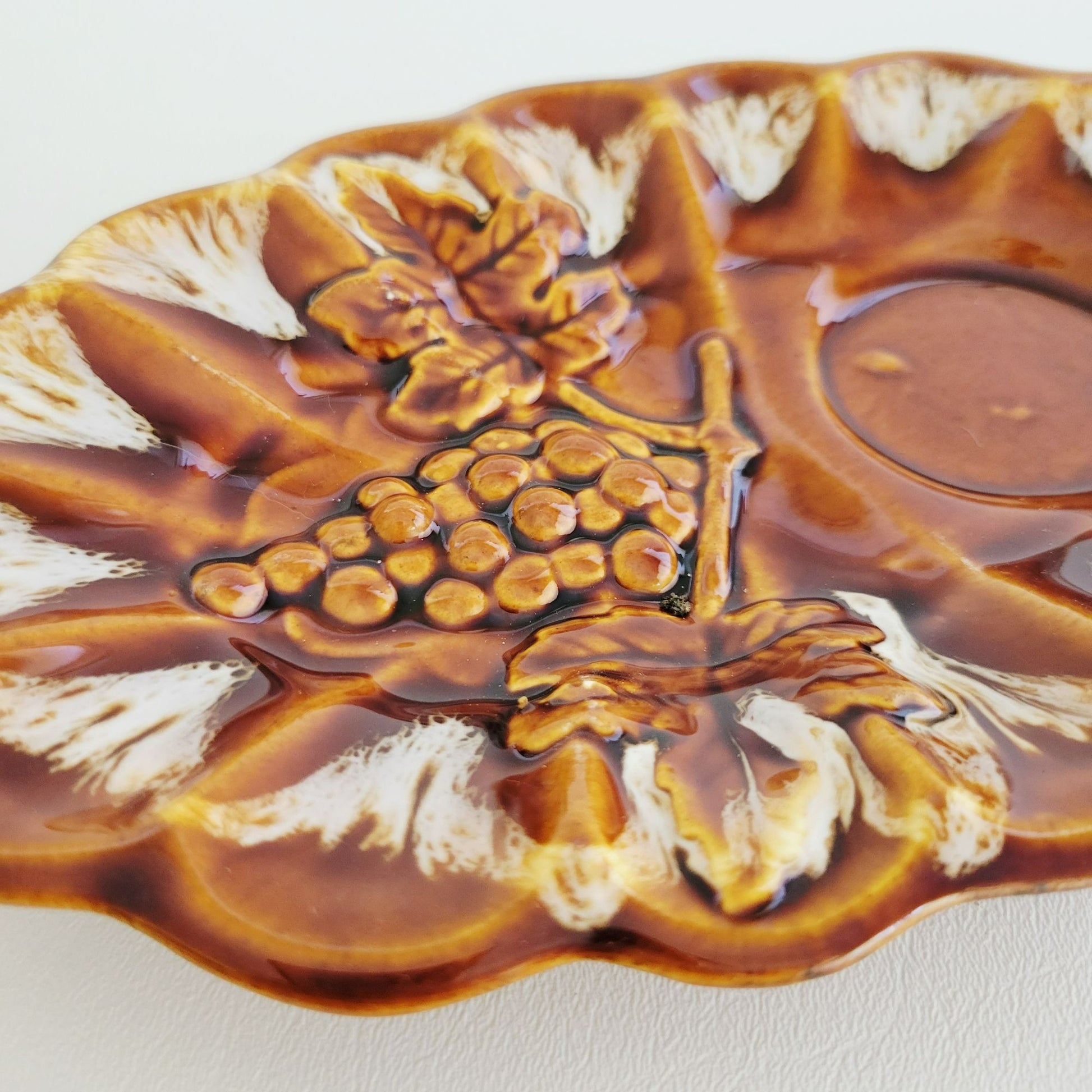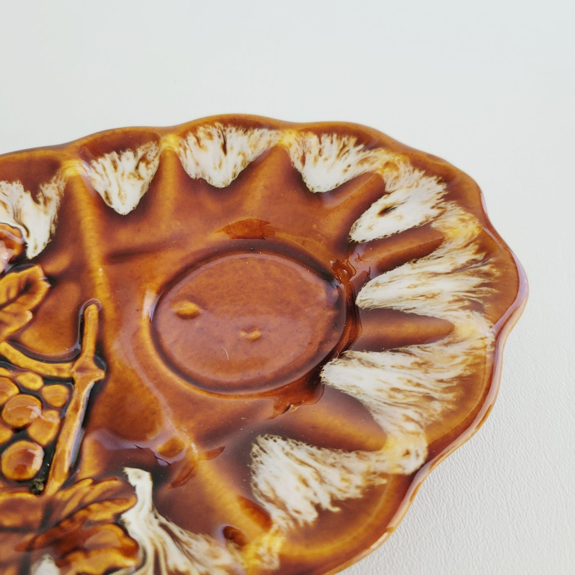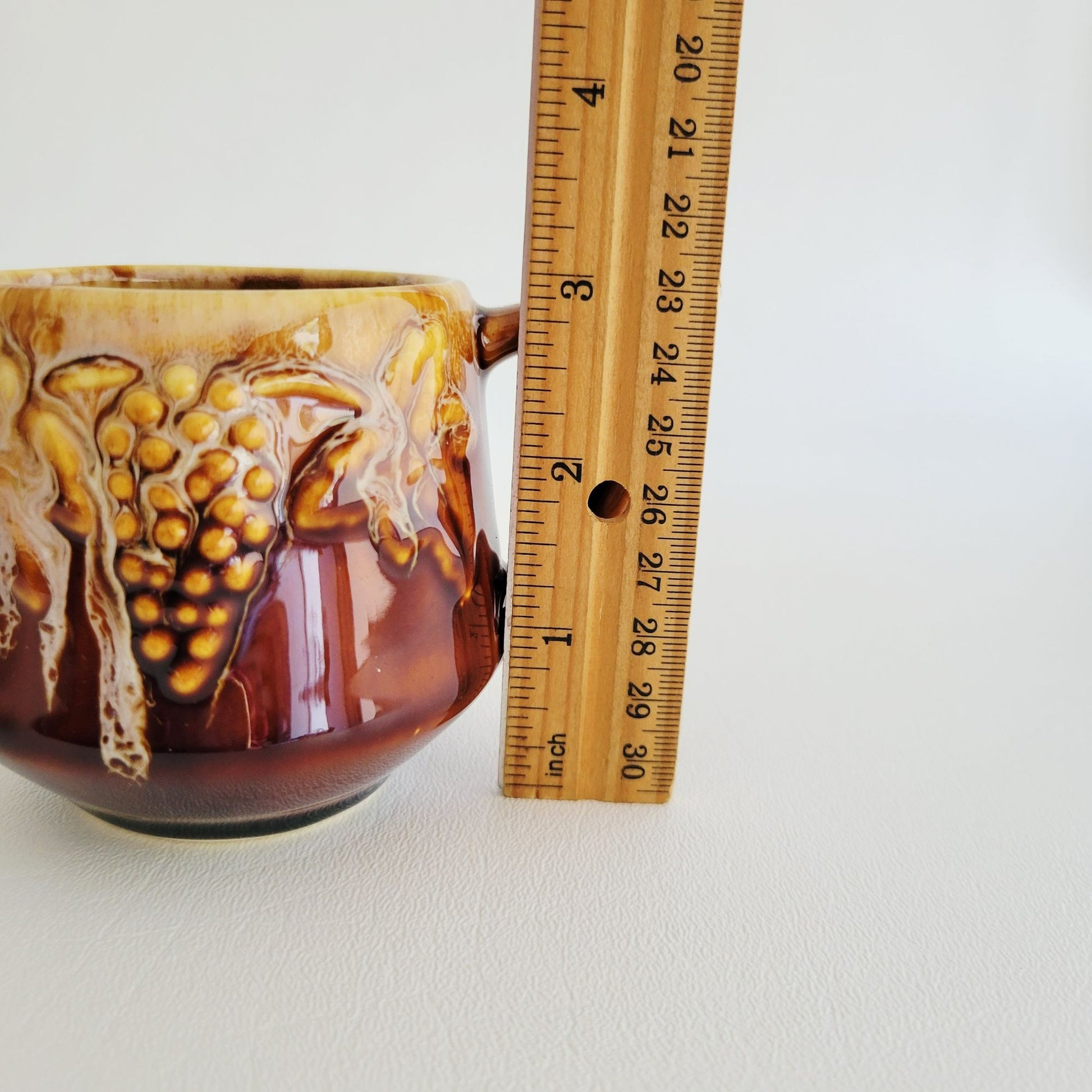 Enhance your vintage collection with two sets of Kingwood Ceramics brown snack plates and cups. Featuring an embossed grape and leaf design with a USA-made drip glaze finish, these pieces are perfect for any retro-themed gathering.
