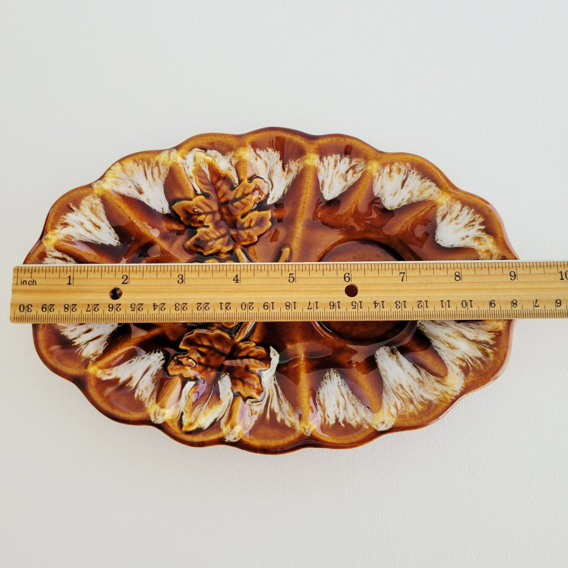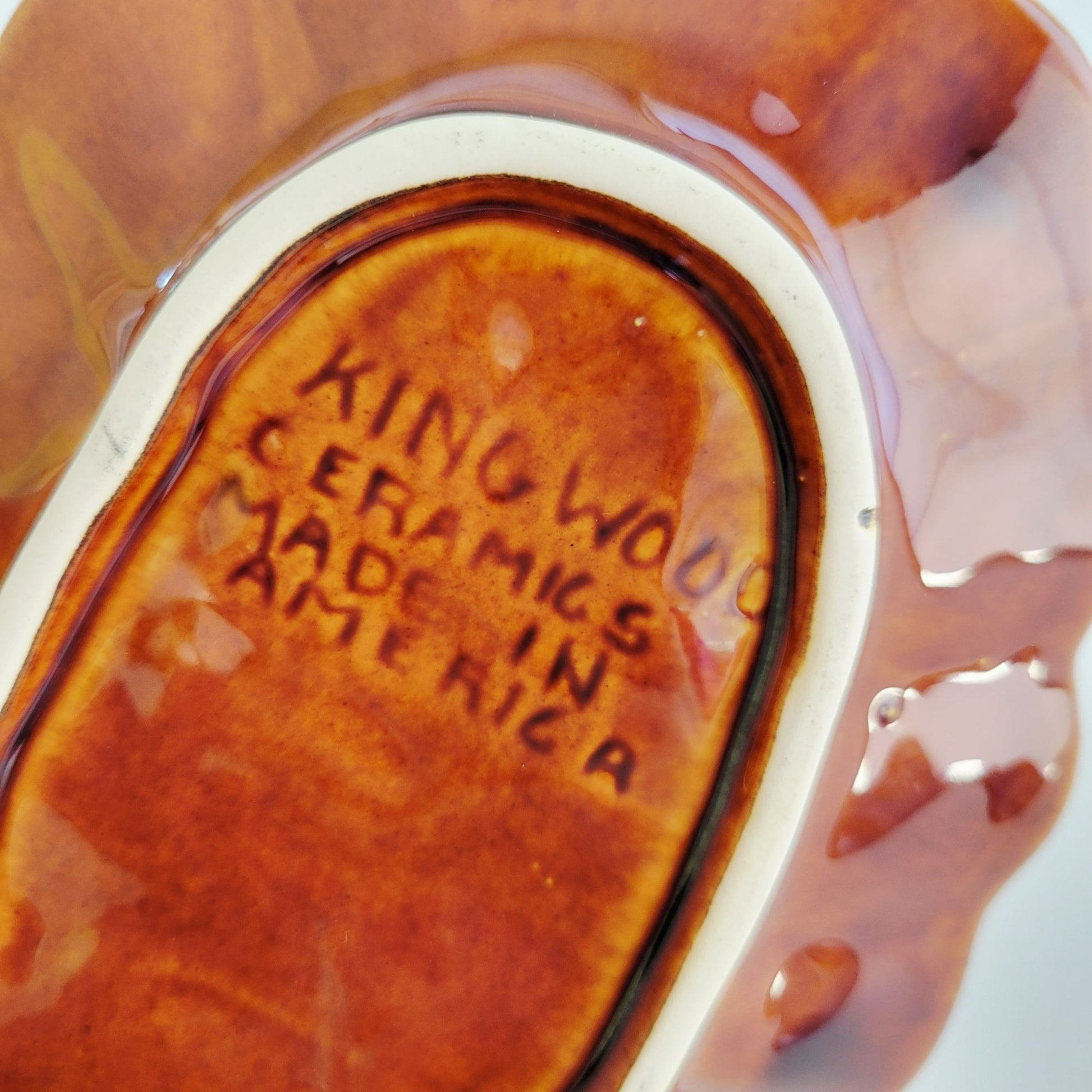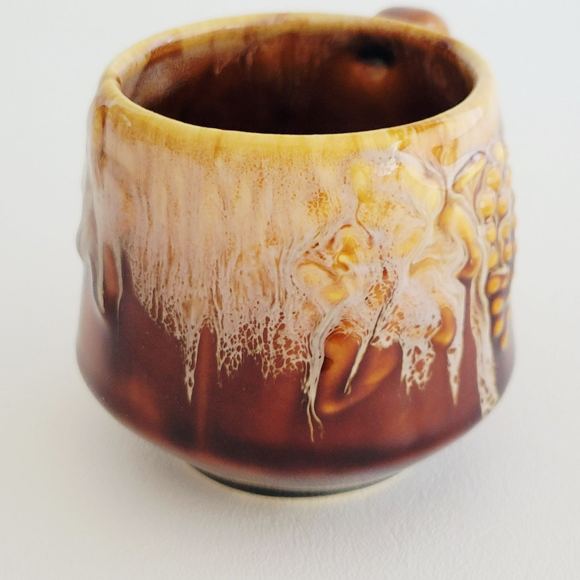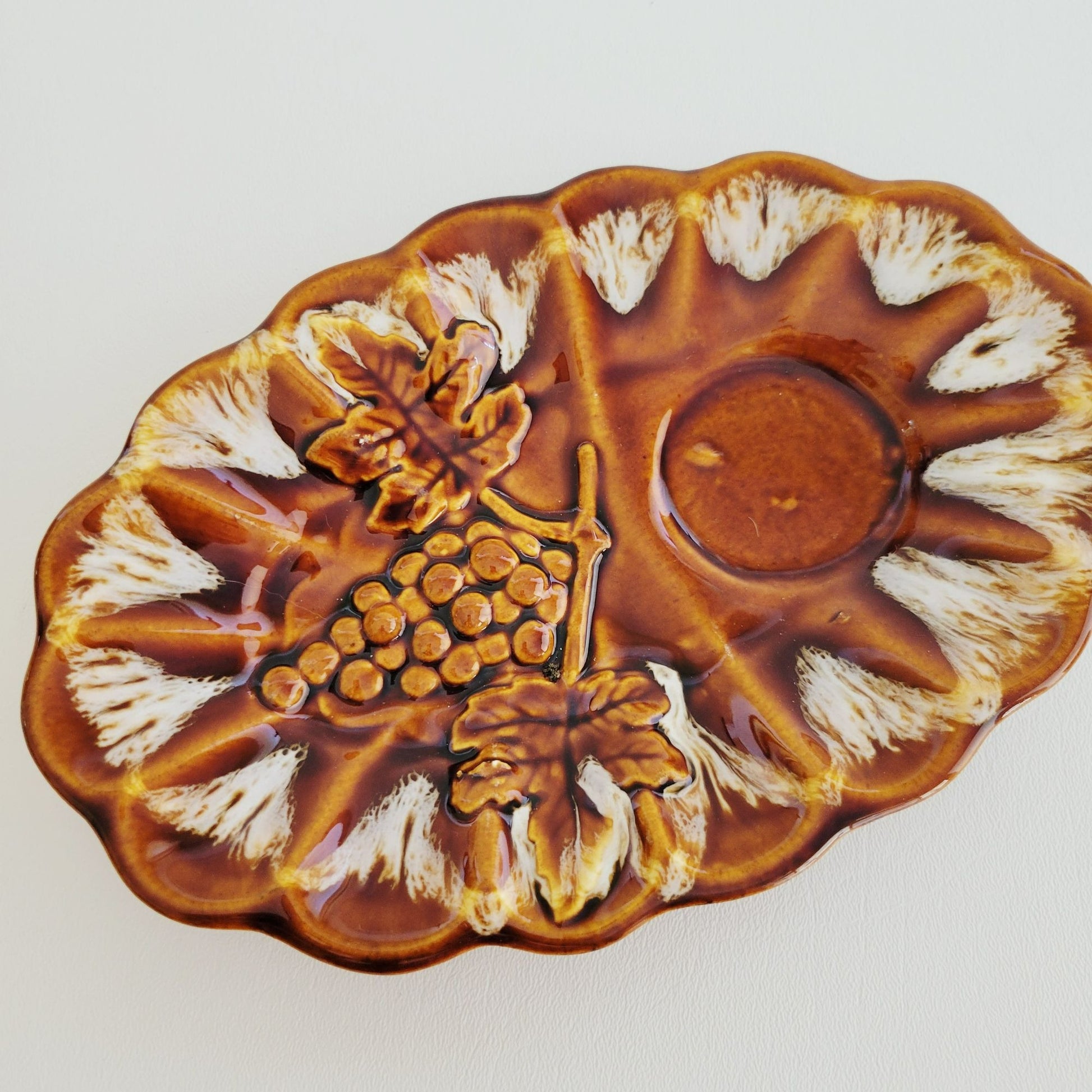 Enhance your vintage collection with two sets of Kingwood Ceramics brown snack plates and cups. Featuring an embossed grape and leaf design with a USA-made drip glaze finish, these pieces are perfect for any retro-themed gathering.