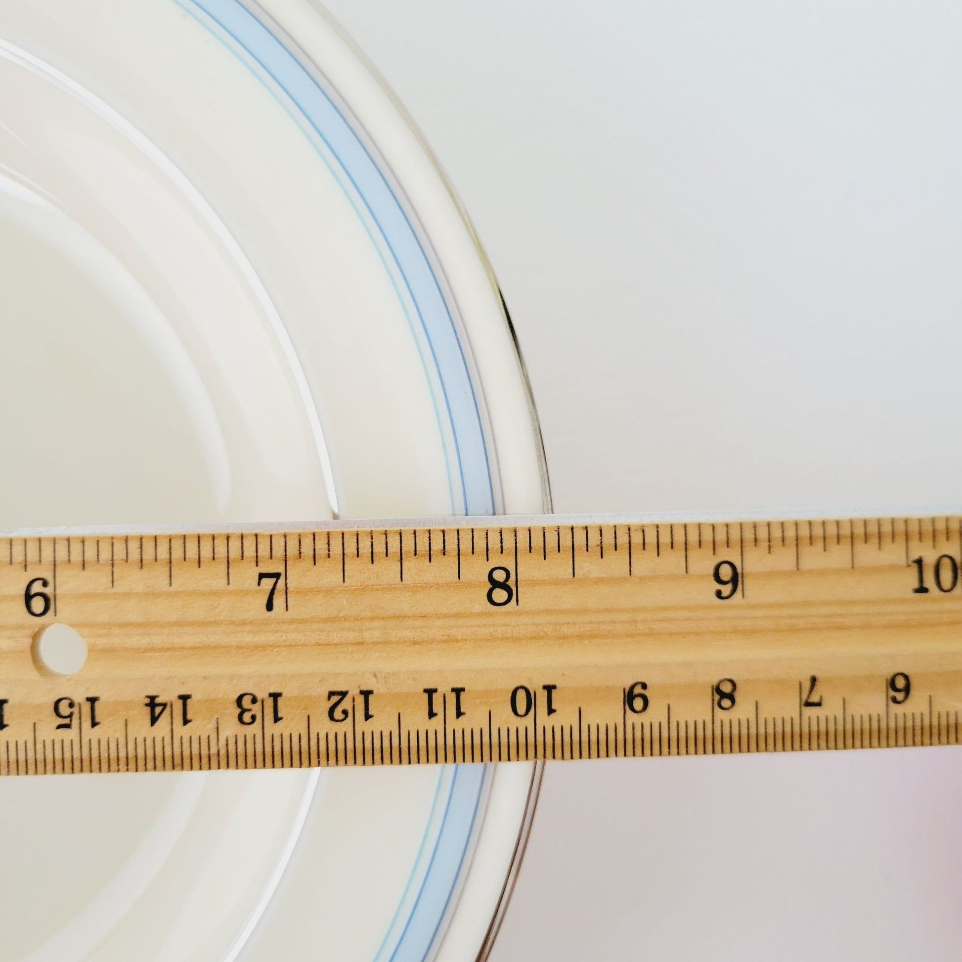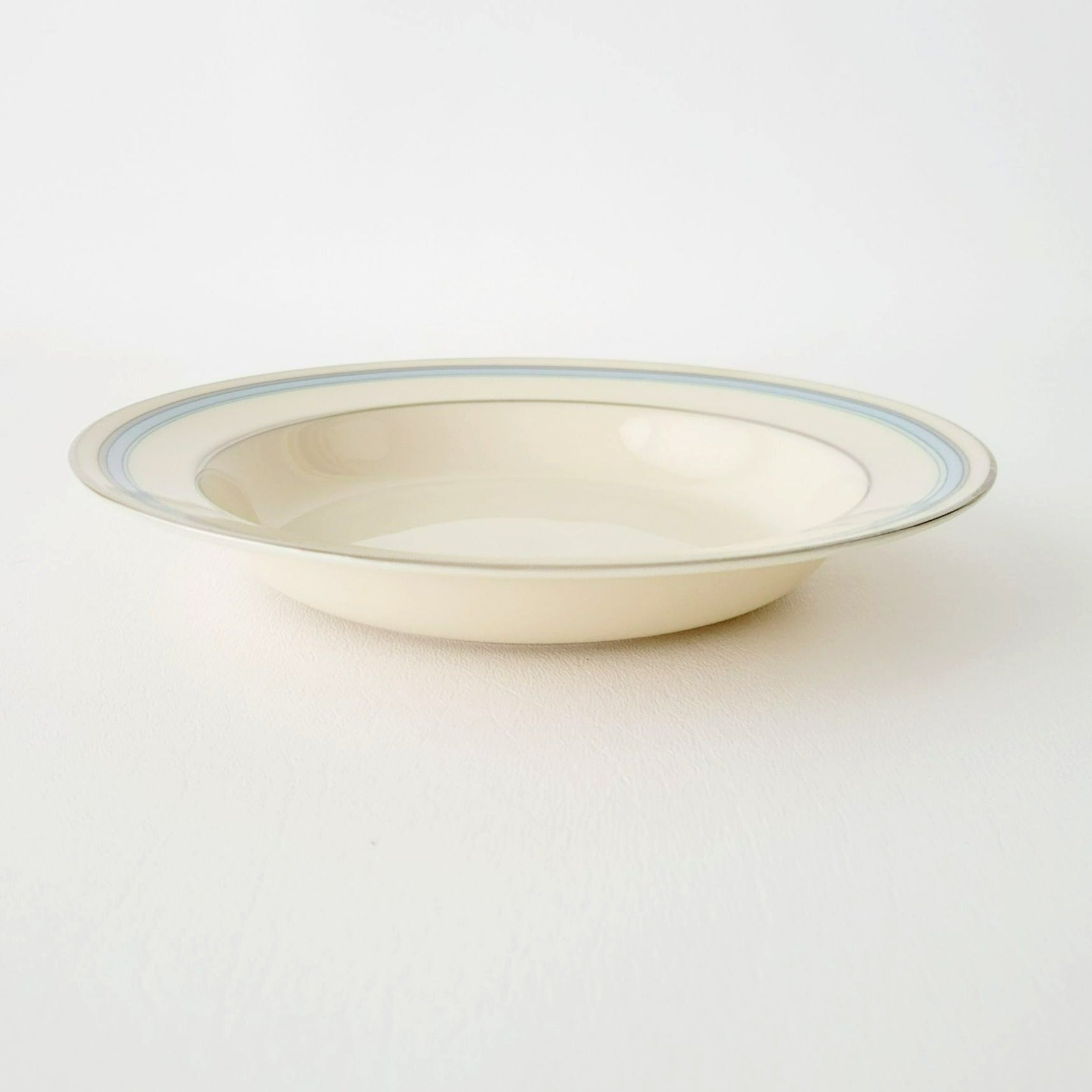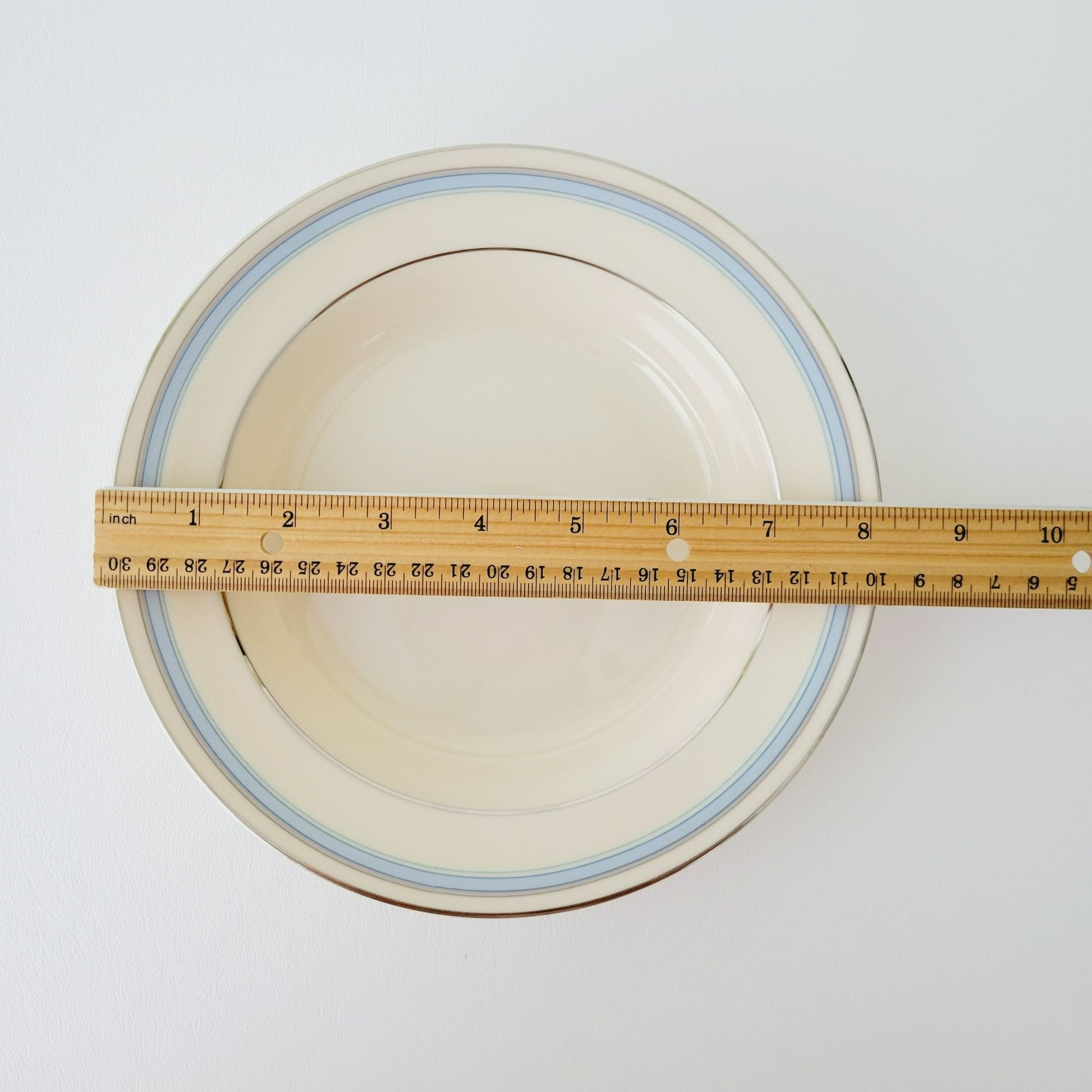 This vintage Lenox Bradford Rimmed Soup Bowl is an elegant addition to your table. Made in the USA in the 1980s, the 8.25" cream bowl features a delicate blue and platinum trim, crafted from high-quality bone china.
