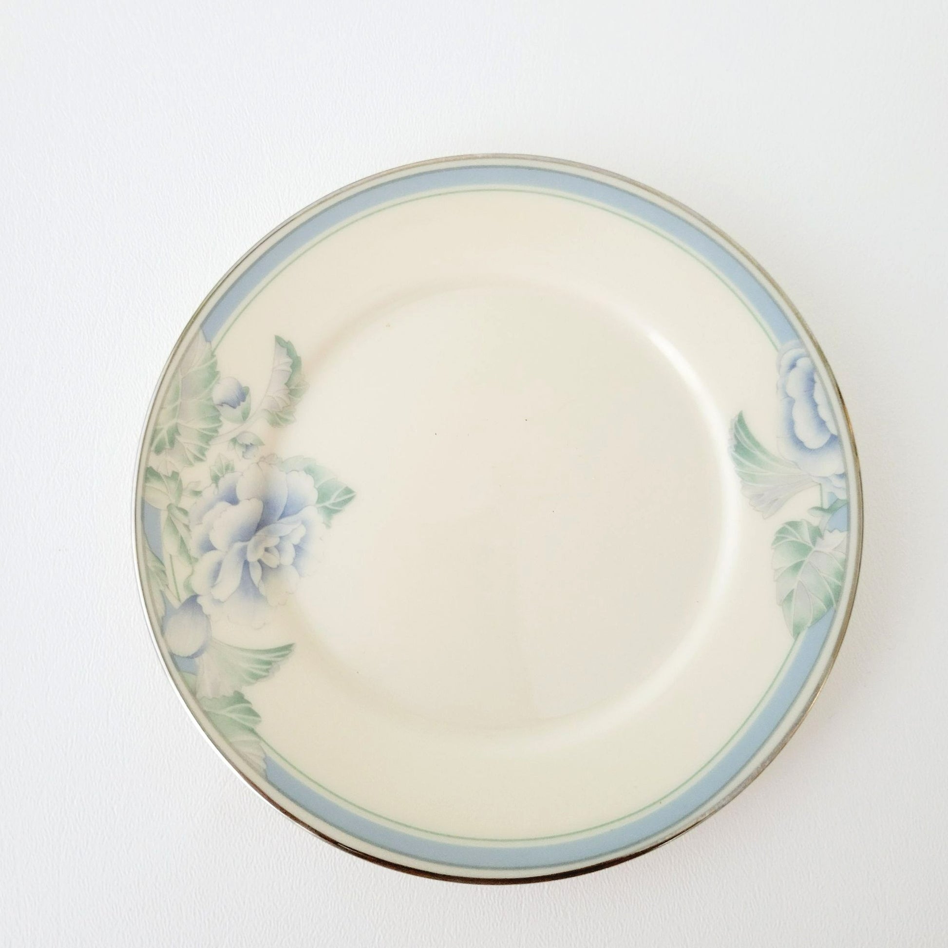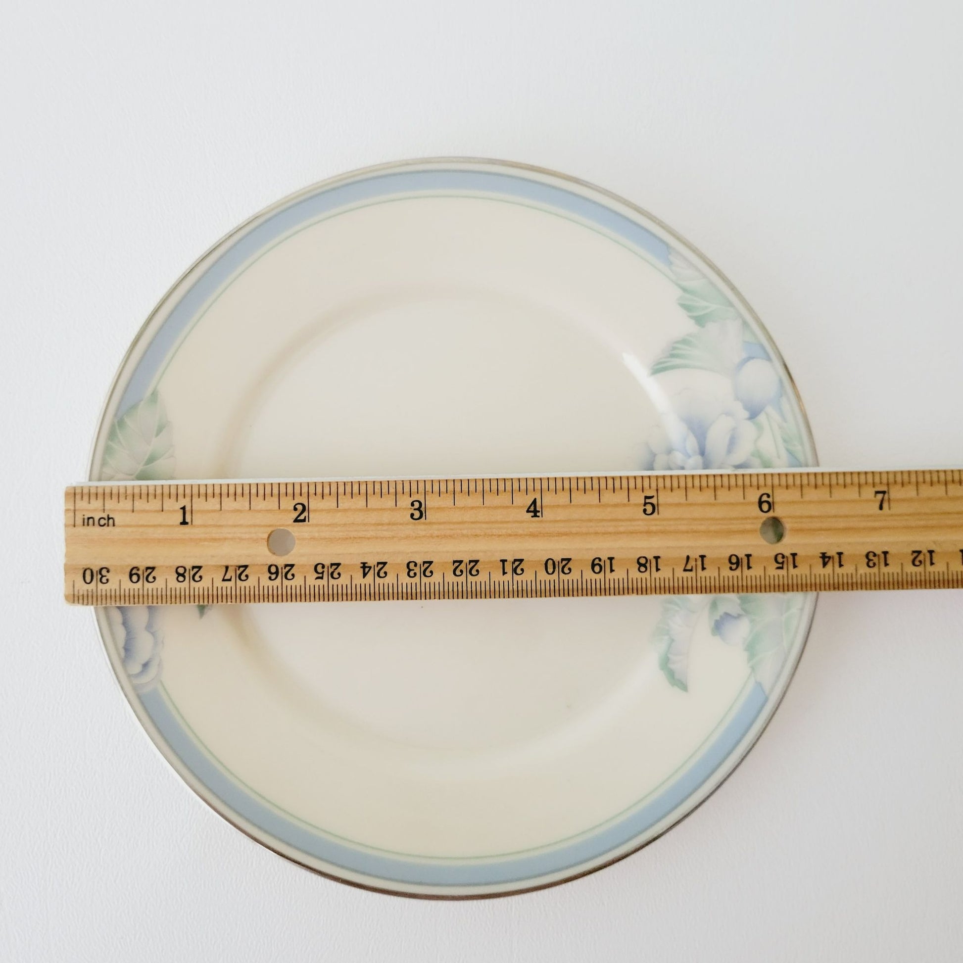 Lenox Brentwood Bread & Butter Plates, set of 2, feature a captivating blue and green floral pattern with a platinum trim. These vintage 1980s plates from USA impart a retro vibe, measuring 6.5", made of high-quality bone china.