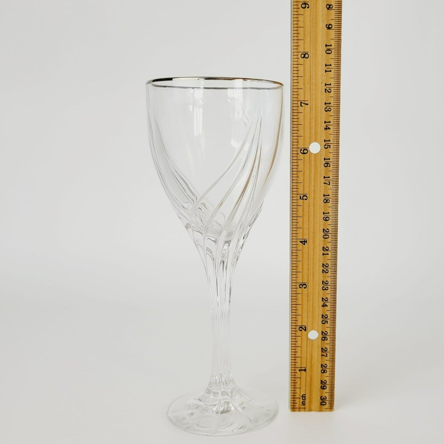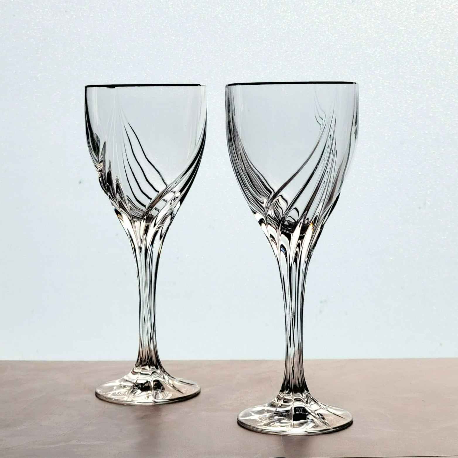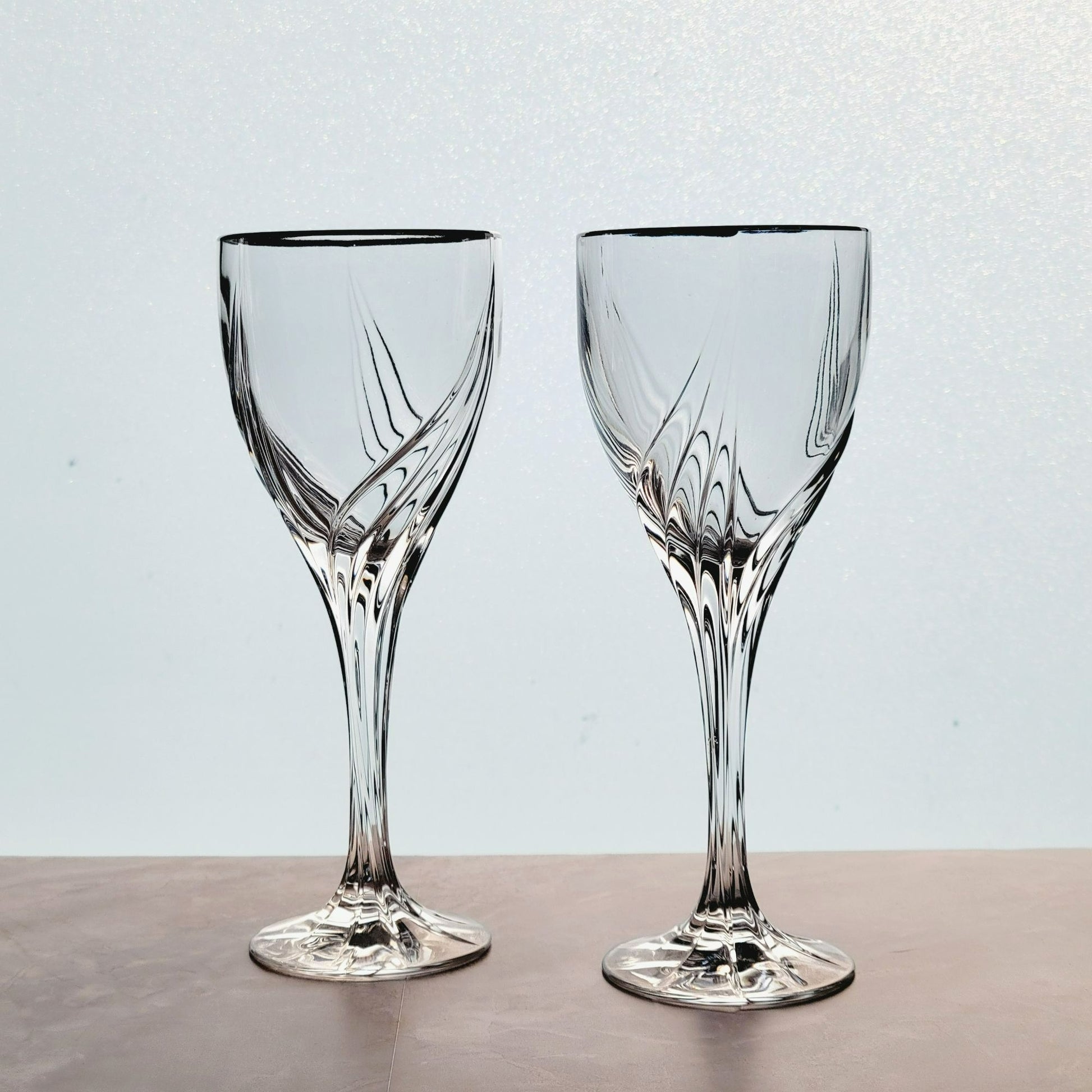 Set of 2 Lenox Crystal Wine Glasses, Debut Platinum, featuring an elegant swirl design with platinum trim. Each glass is 7.5" tall and holds 4fl oz. Perfect as replacement glassware or shower/wedding gift.