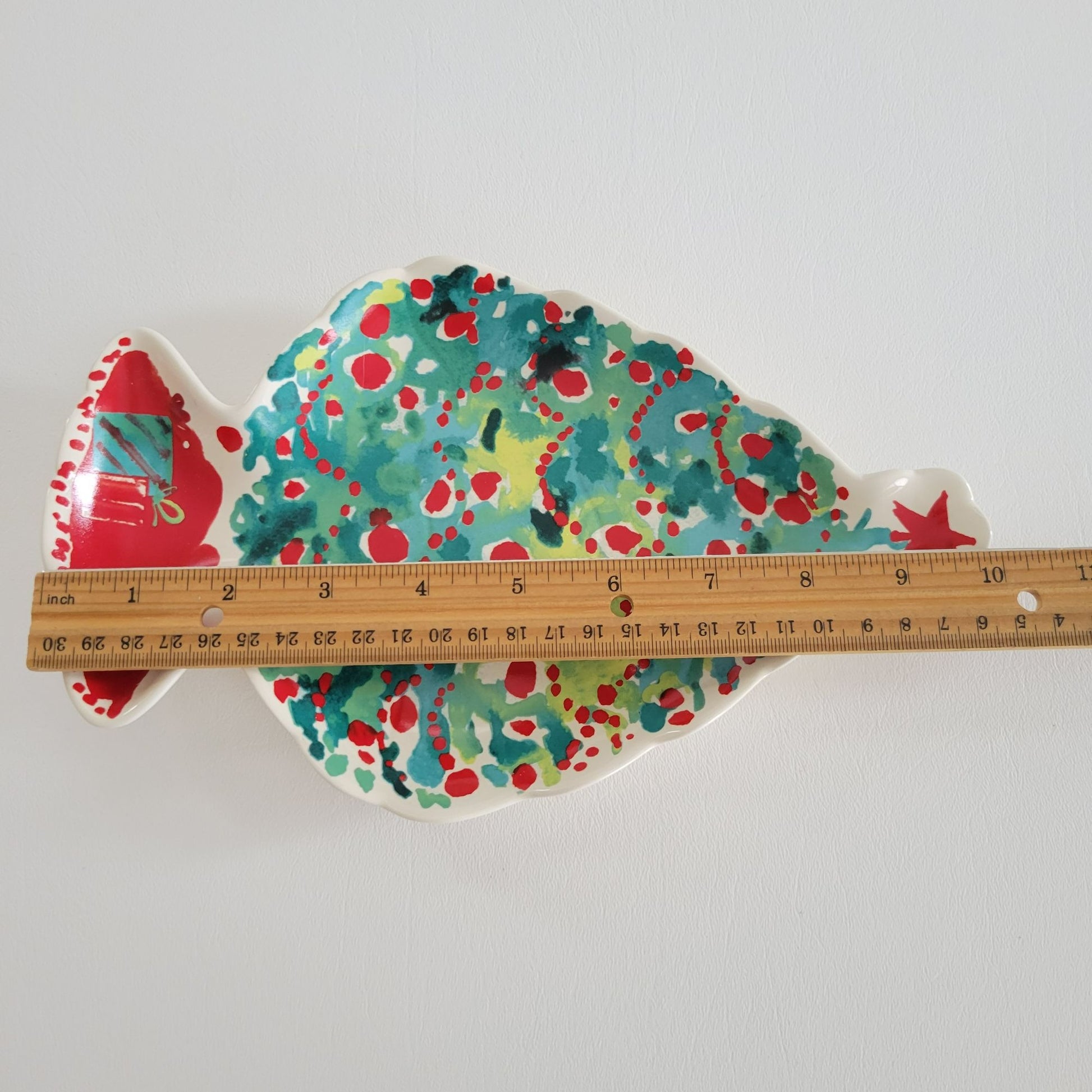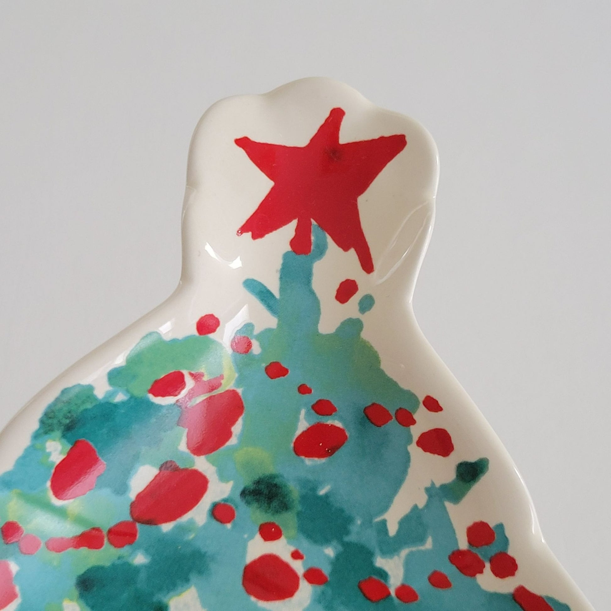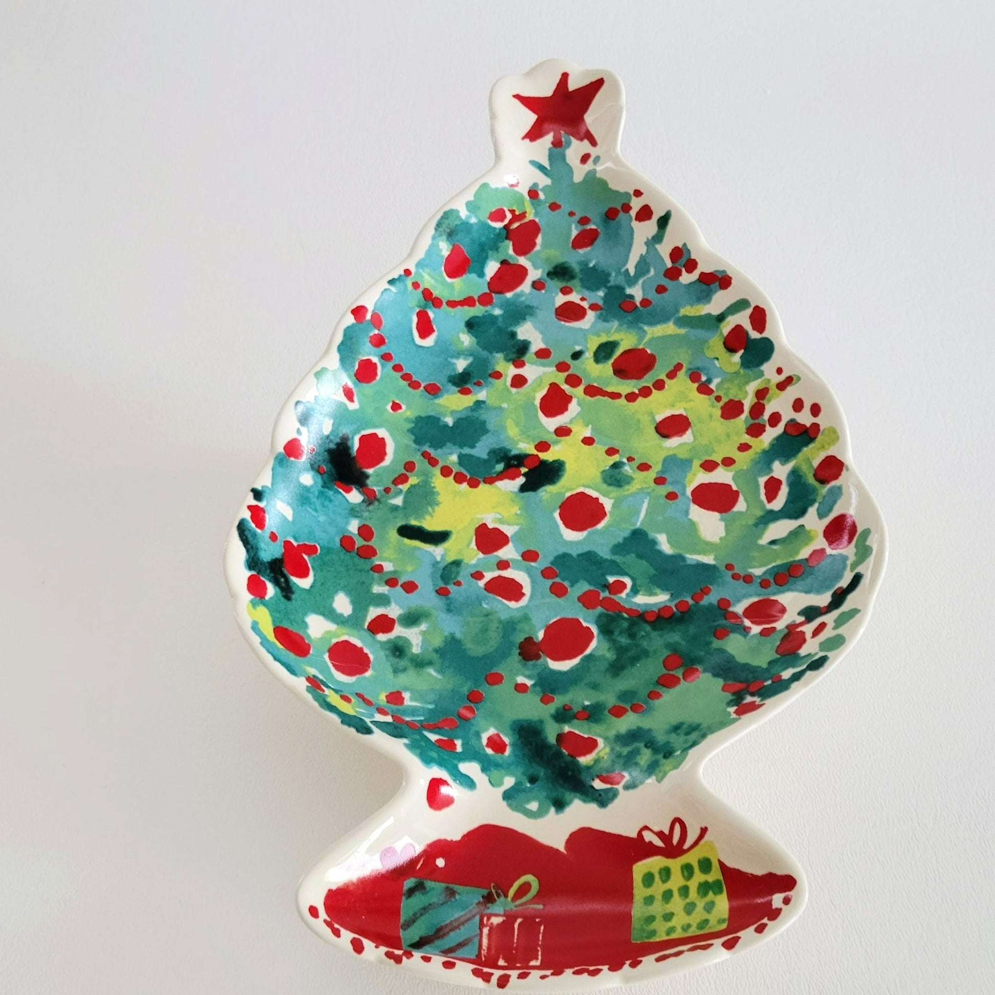 Festive and colorful Christmas tree-shaped plate, ideal for serving appetizers or desserts during holiday celebrations. Durable and decorative design.