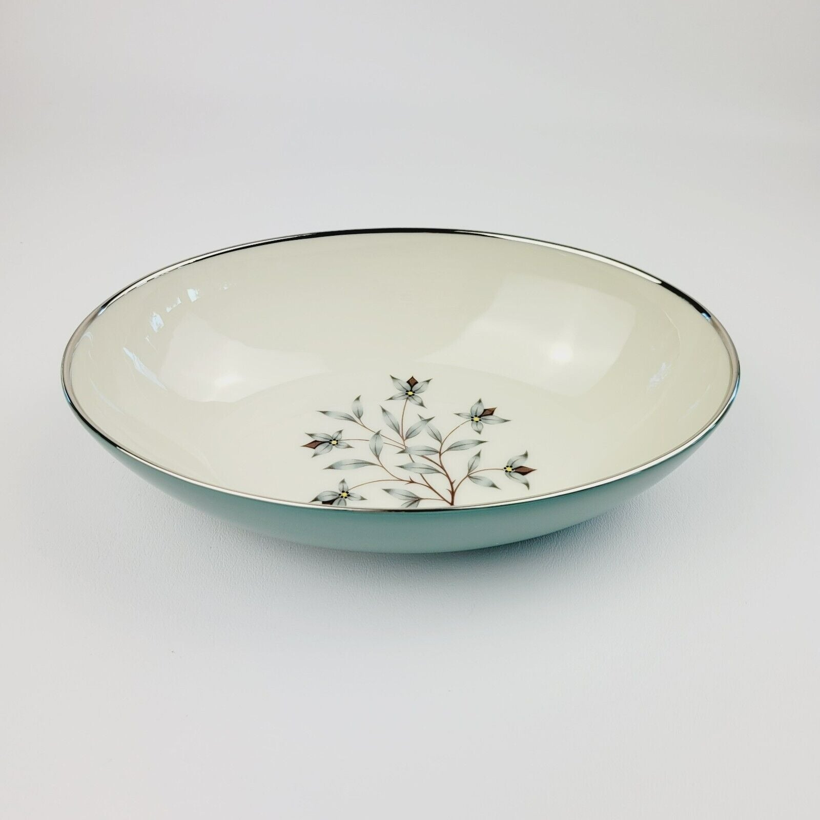 Vintage Lenox Kingsley Oval Serving Bowl featuring a teal band, platinum trim, and floral center. Manufactured between 1954-79 in the USA. It's made of porcelain with a smooth finish.