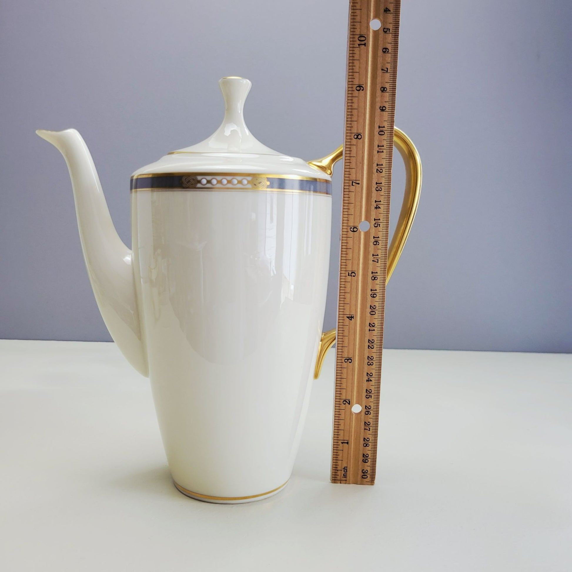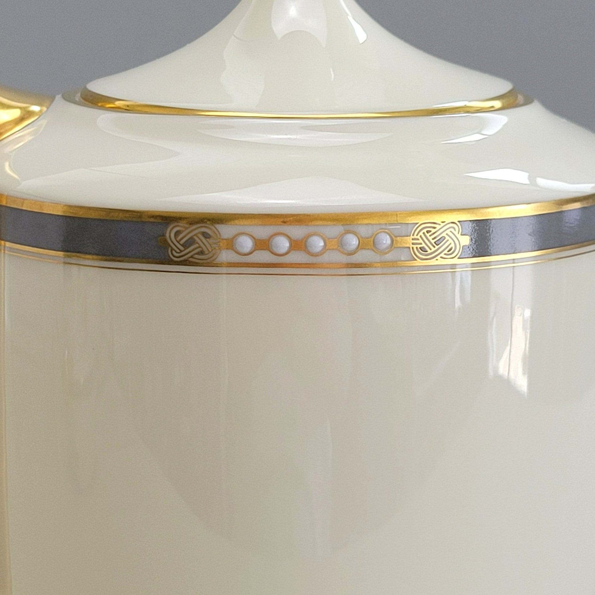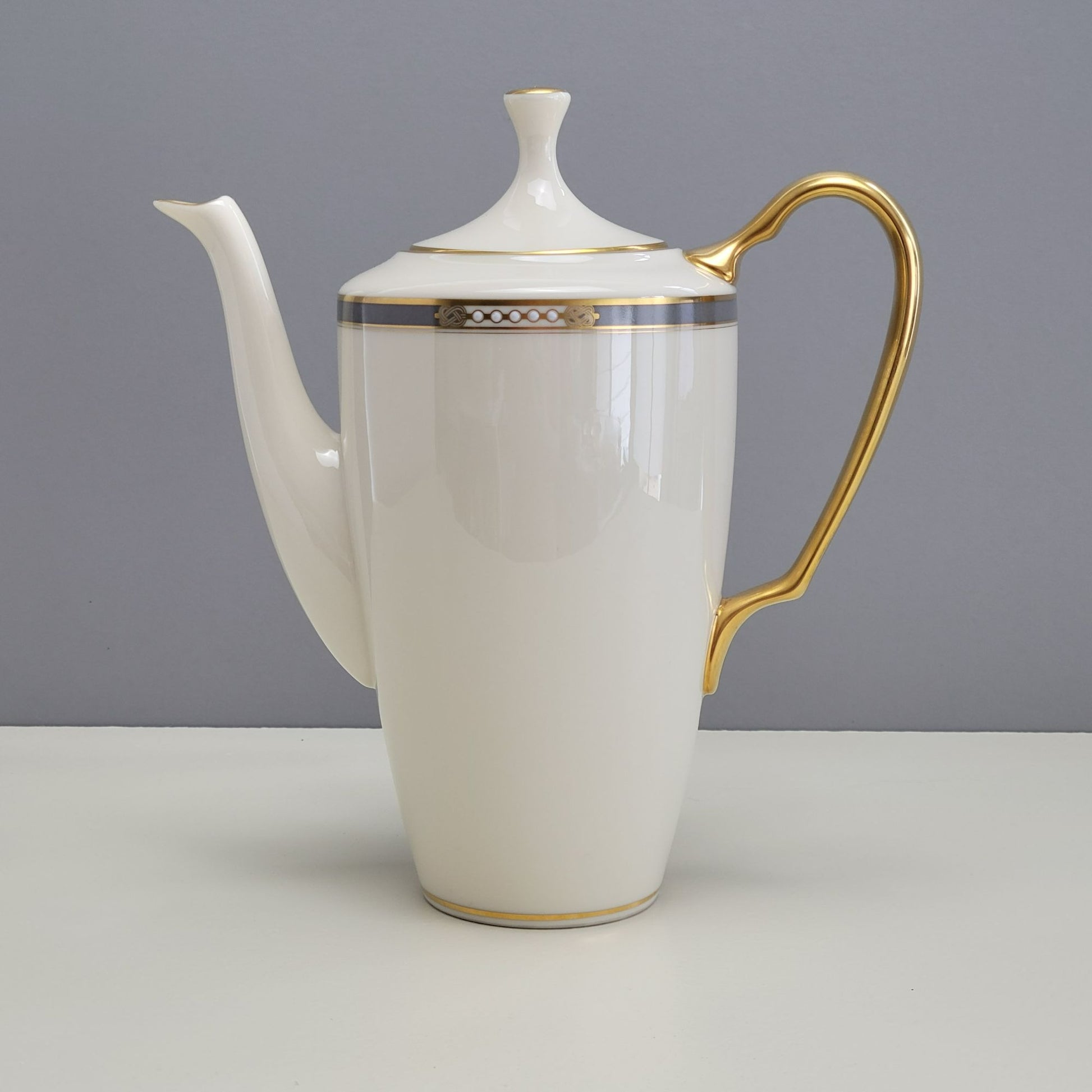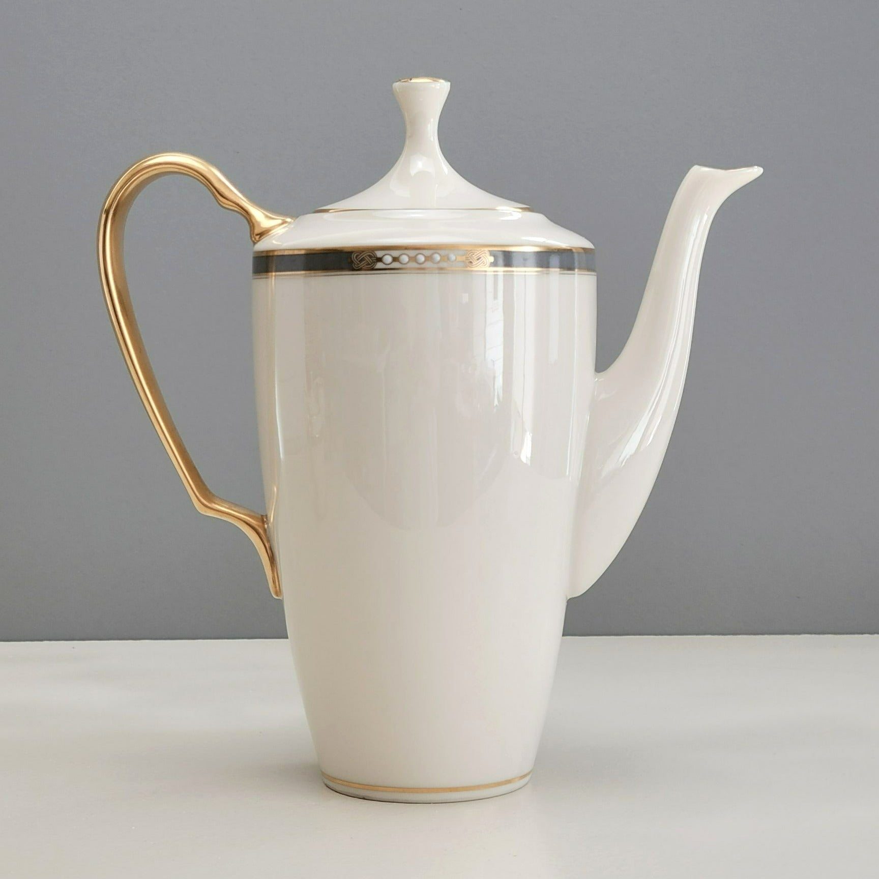 Beautifully crafted Vintage Lenox McKinley Coffee Pot from the Presidential Collection. Features an elegant ivory color with a gray band and enameled dots, highlighted by heavy gold trim. Made in the USA, this piece is a perfect addition to any collection.