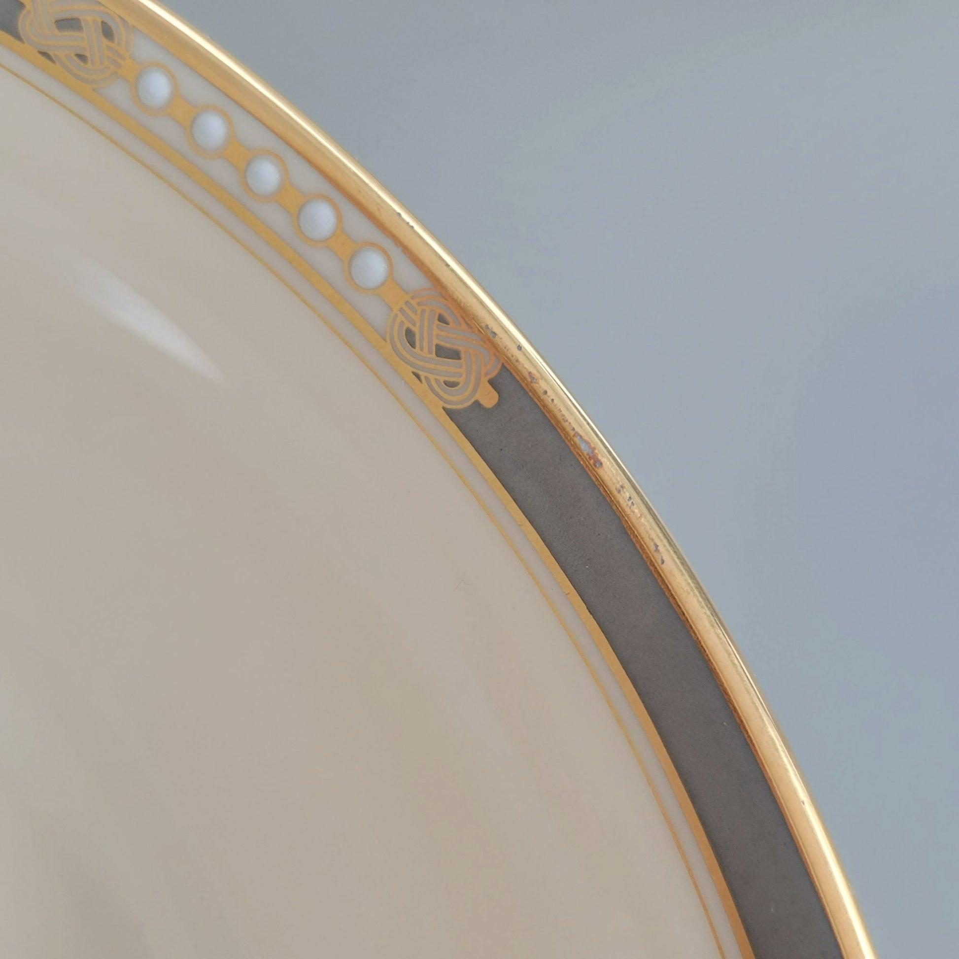 Piece is in good condition with no cracks, chips, or crazing. There is minor wear along the gold trim.