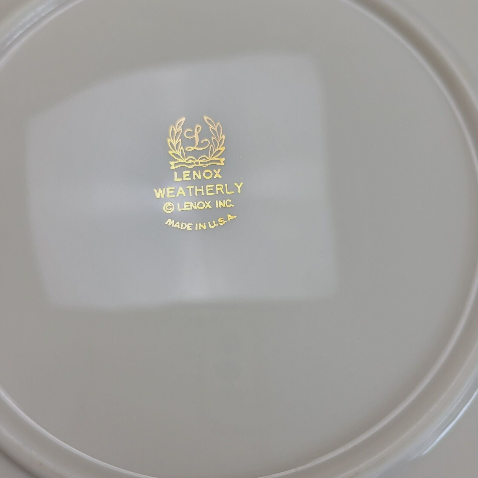 Elegant vintage Lenox Weatherly ivory color plate with a swirled edge and platinum trim, made in the USA between 1959 and 1986. Perfect for collectors seeking discontinued dinnerware or elegant replacements.
