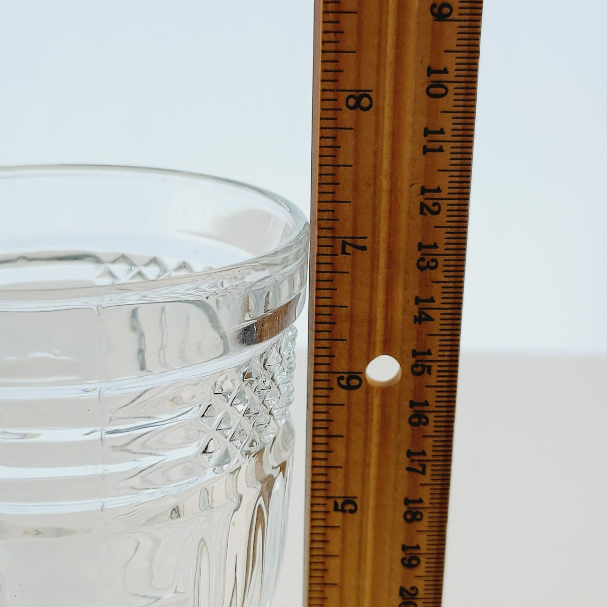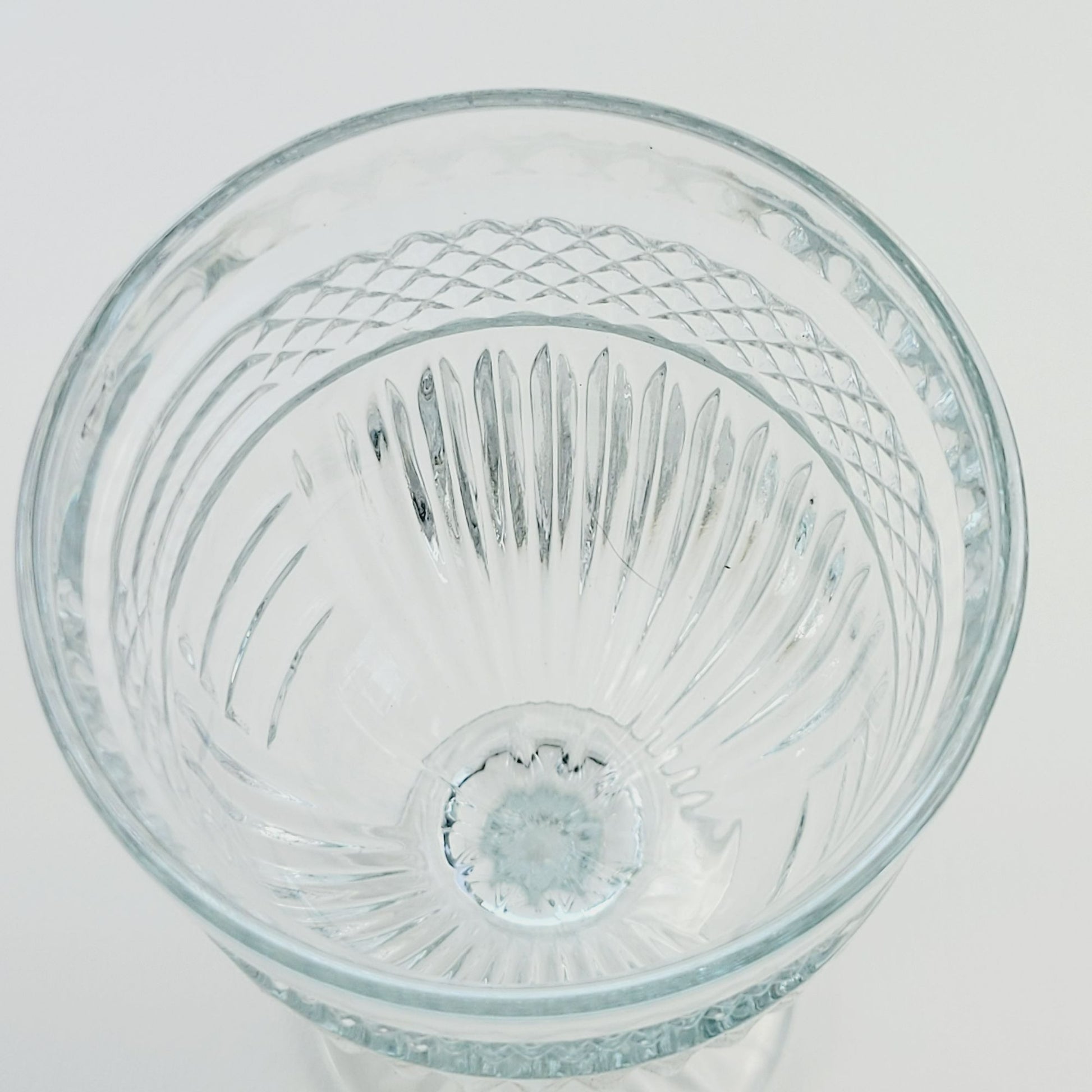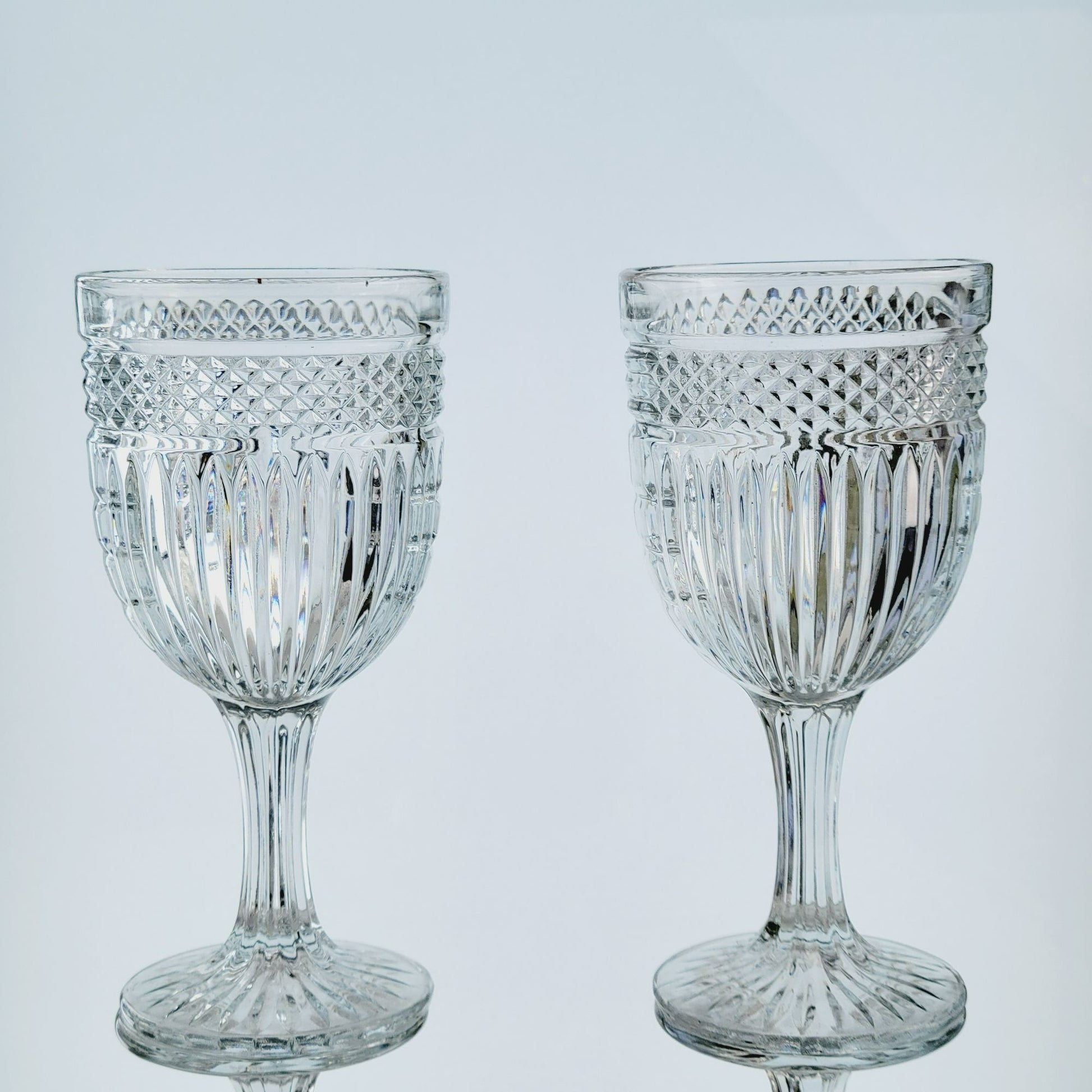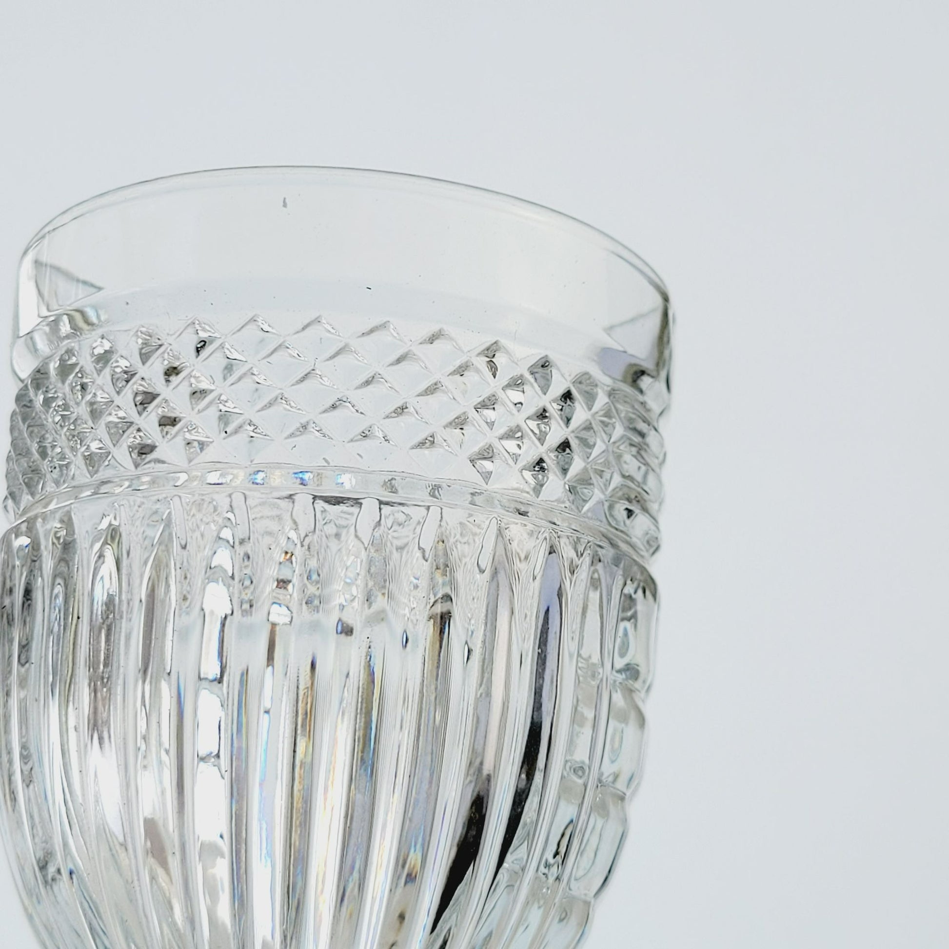 Add a touch of fun to your table with these vintage Libbey Radiant water goblets. Beautifully crafted in the USA, these discontinued pieces feature a unique diamond criss-cross and vertical line design. Perfect for collectors or as a replacement in your drinkware collection.
