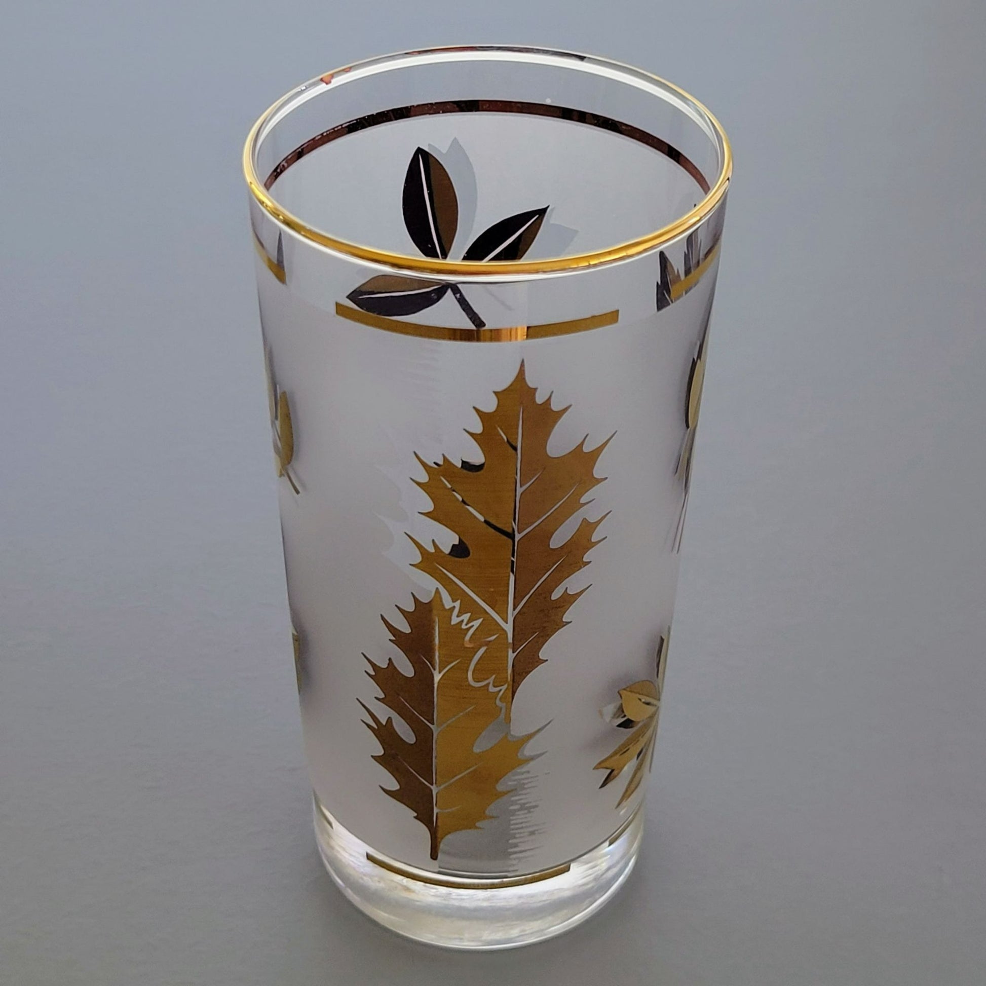 Vintage Libbey Golden Foliage Tumblers, set of 2, feature gold leaves and rims on frosted glass. Perfect for mid-century modern enthusiasts and collectors.