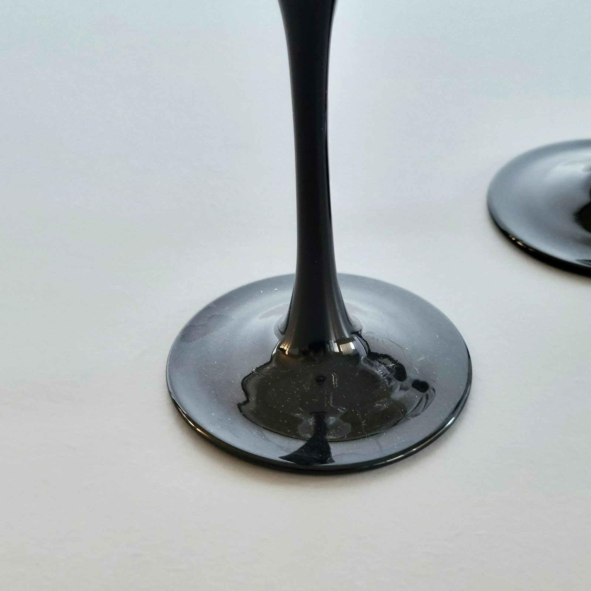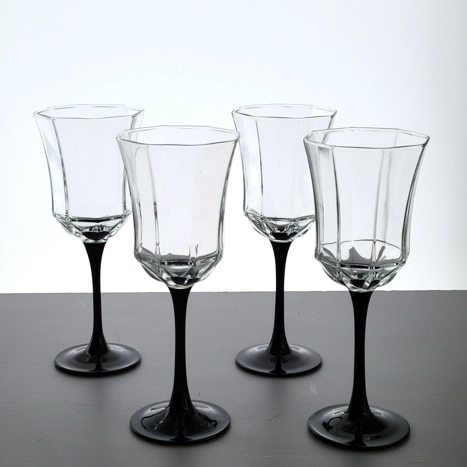 Elegant vintage wine glass set by Luminarc France, featuring black stems and clear bases. Discontinued and collectible, these octagonal-shaped goblets are perfect for stylish entertaining or as a unique addition to your glassware collection.