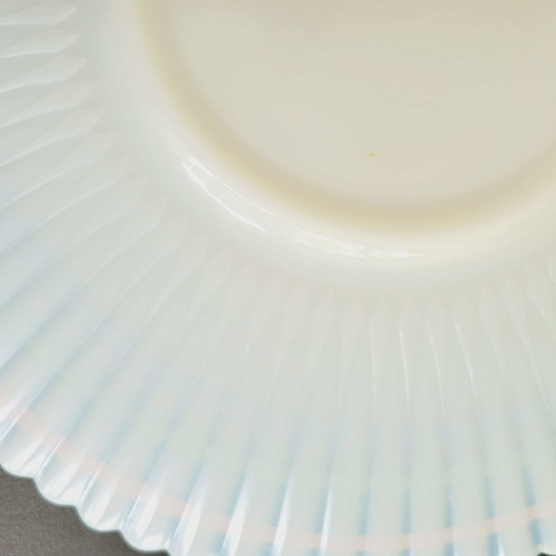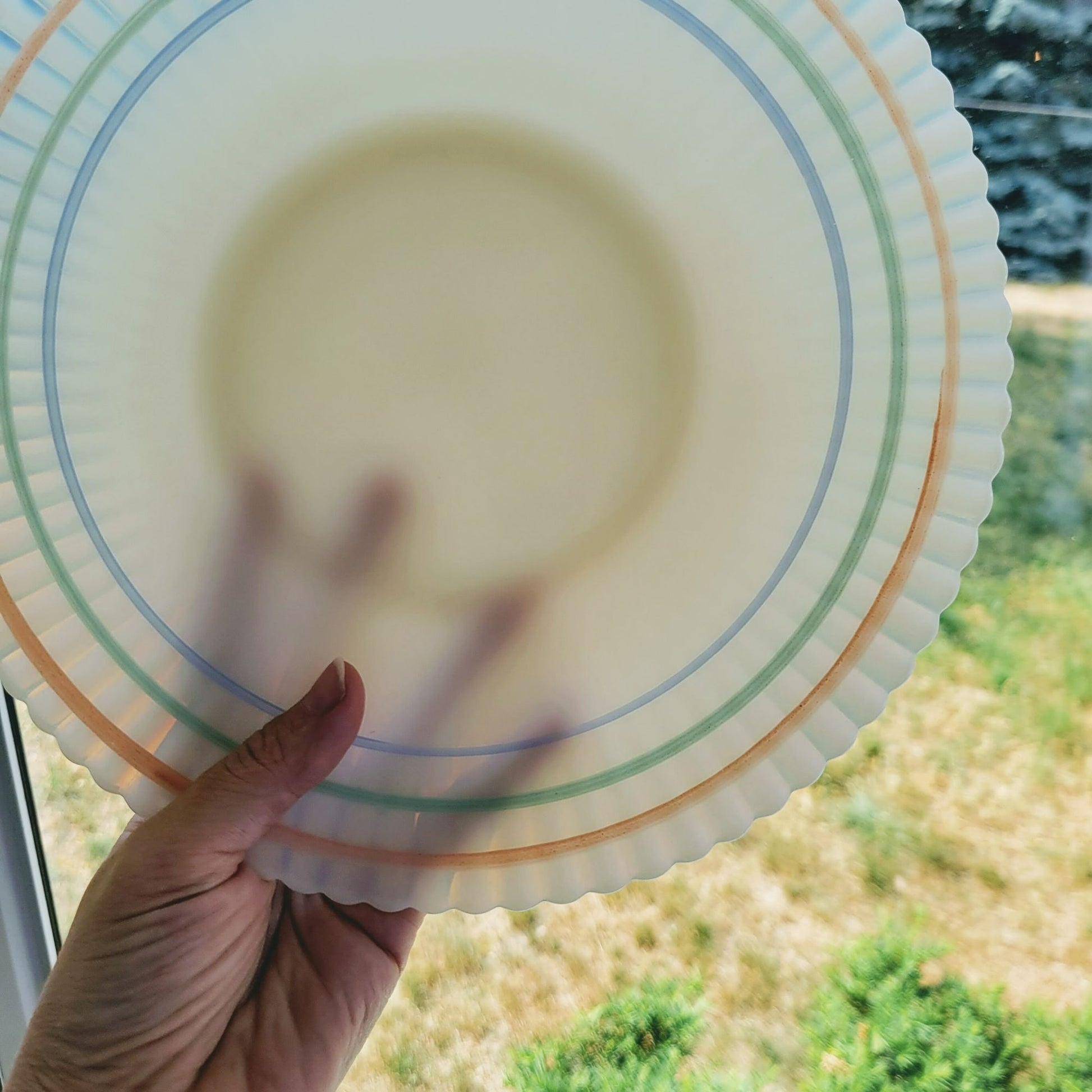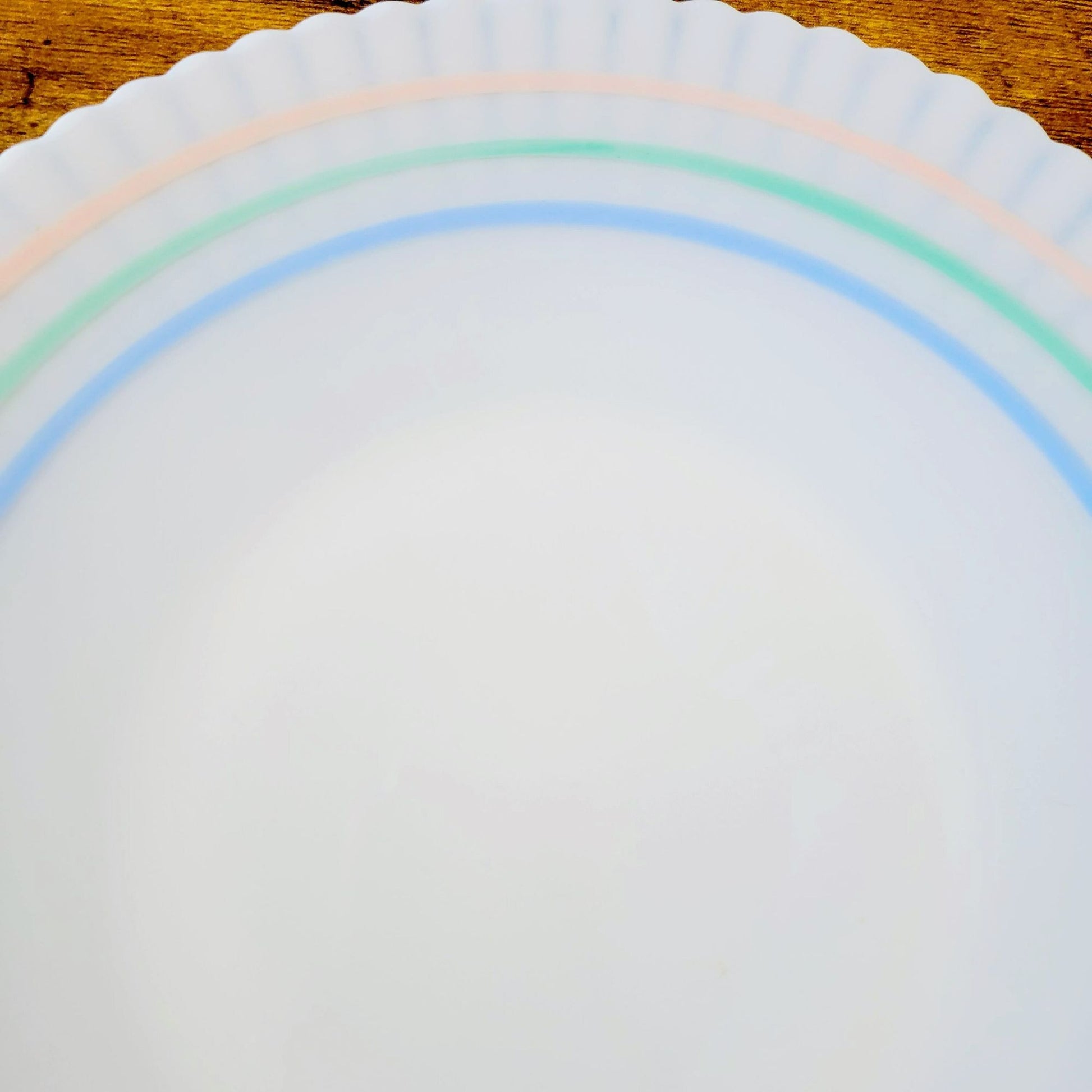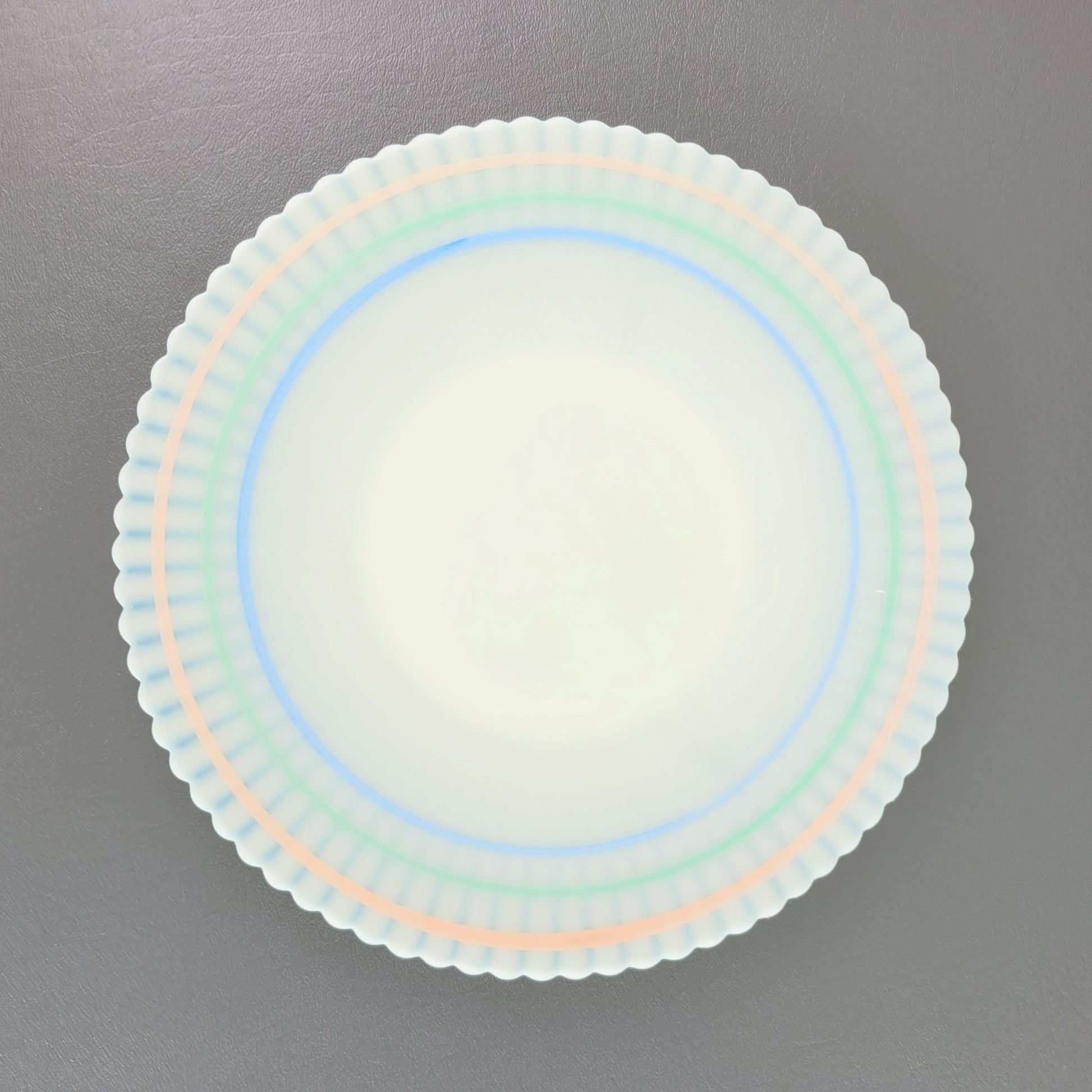 Petalware Cake Plate / Platter by MacBeth Evans is from the 1930s. The Stunning Soft White and Pastel Depression Glass Round Platter is Translucent in Sunlight.