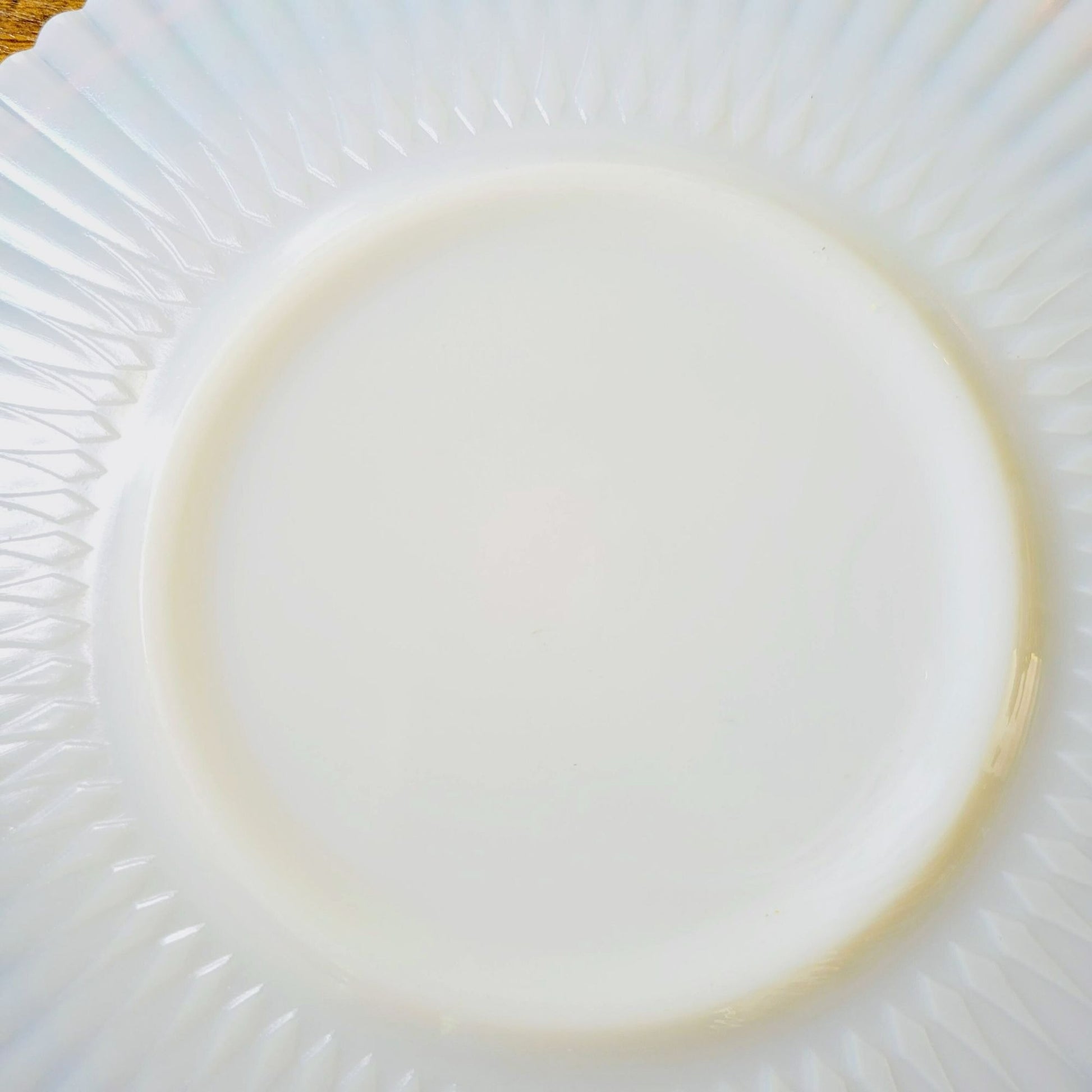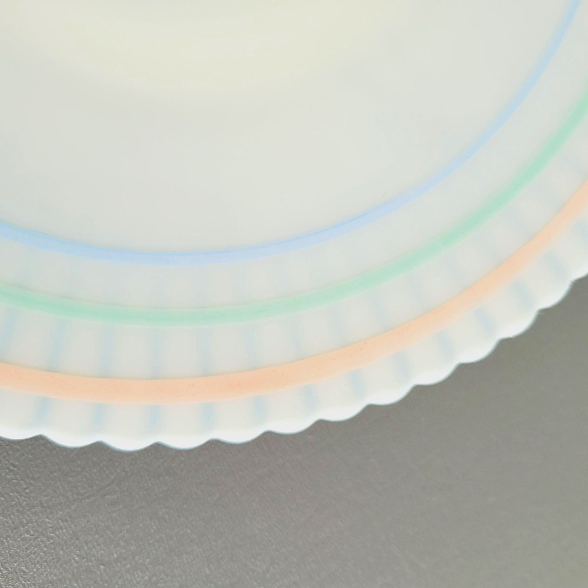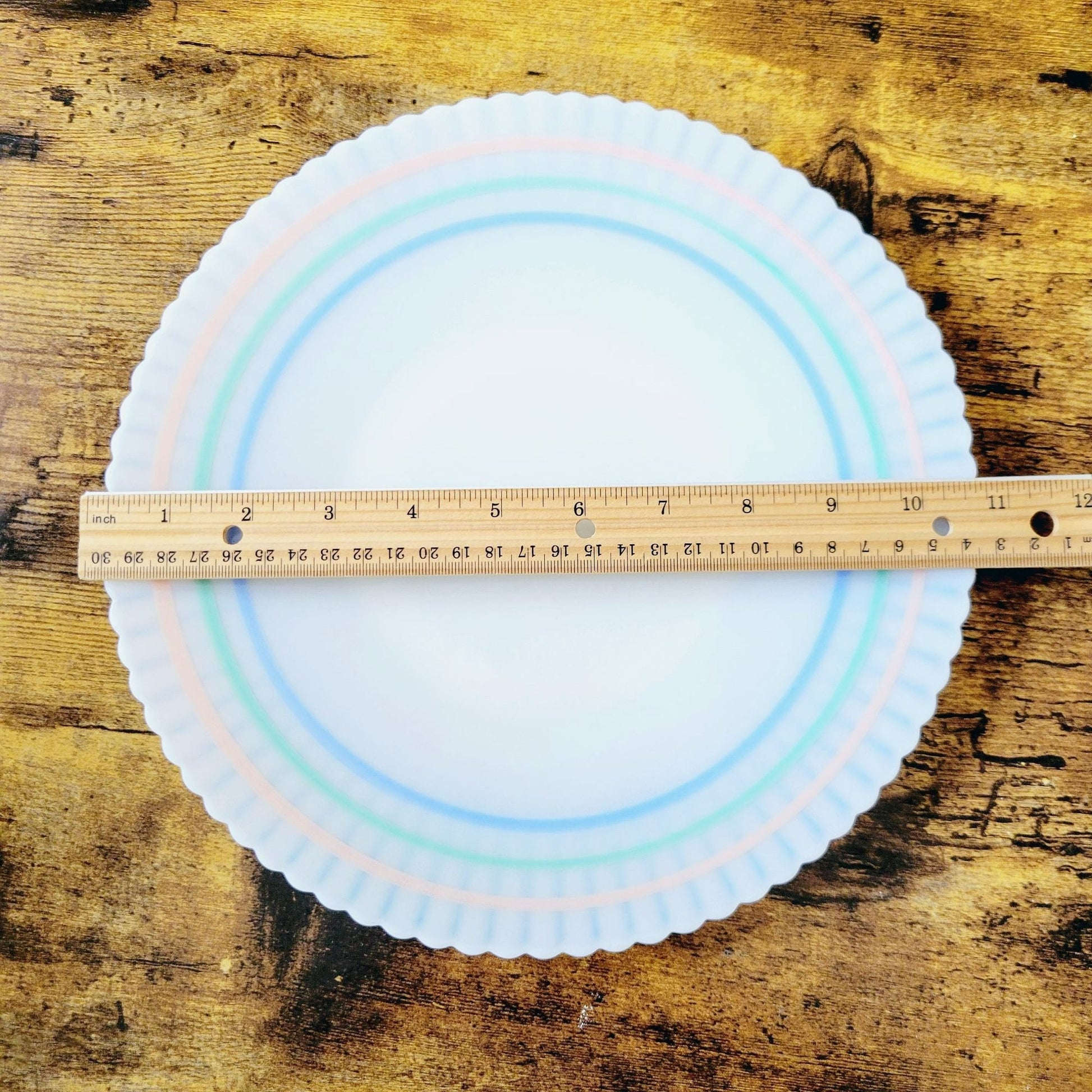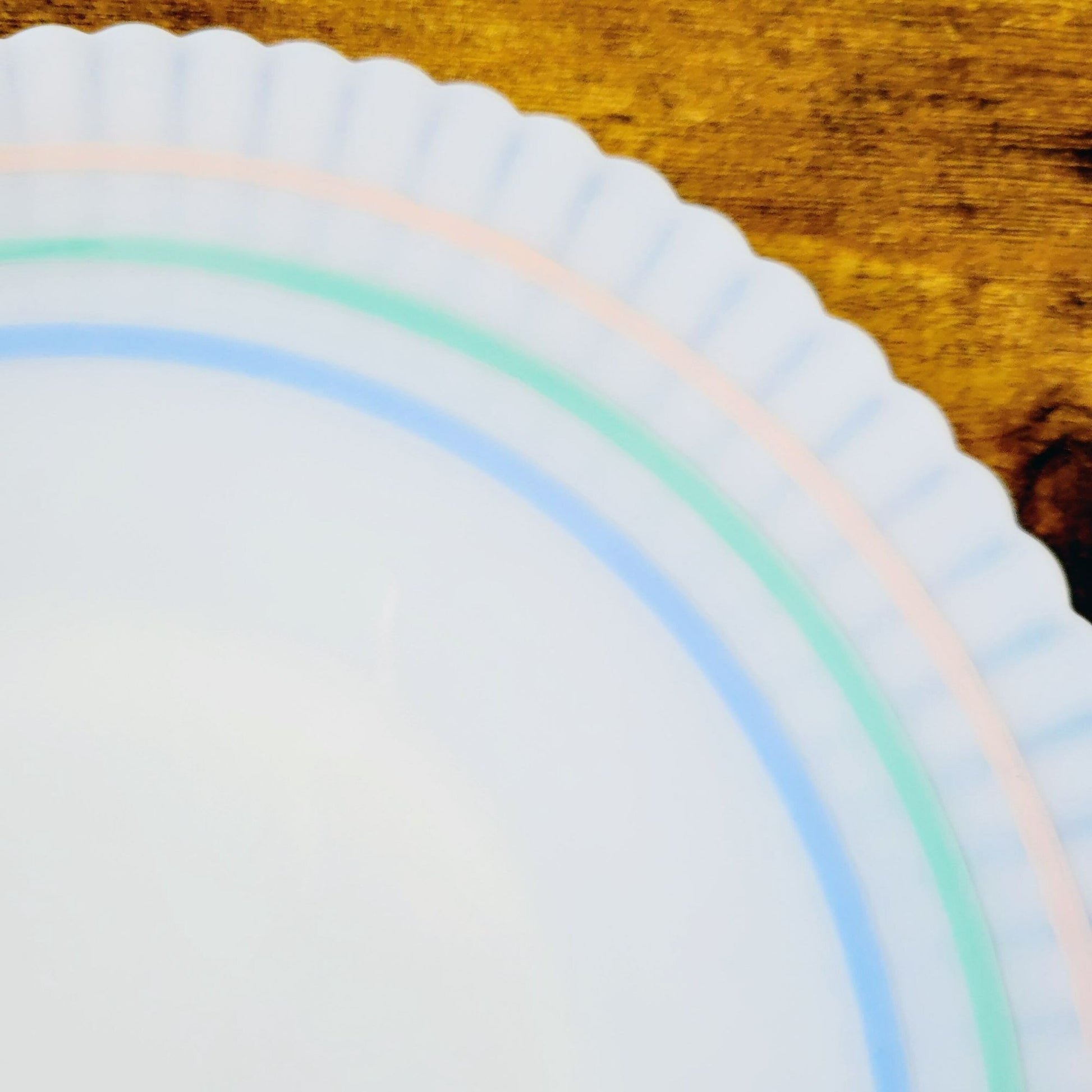 Petalware Cake Plate / Platter by MacBeth Evans is from the 1930s. The Stunning Soft White and Pastel Depression Glass Round Platter is Translucent in Sunlight.