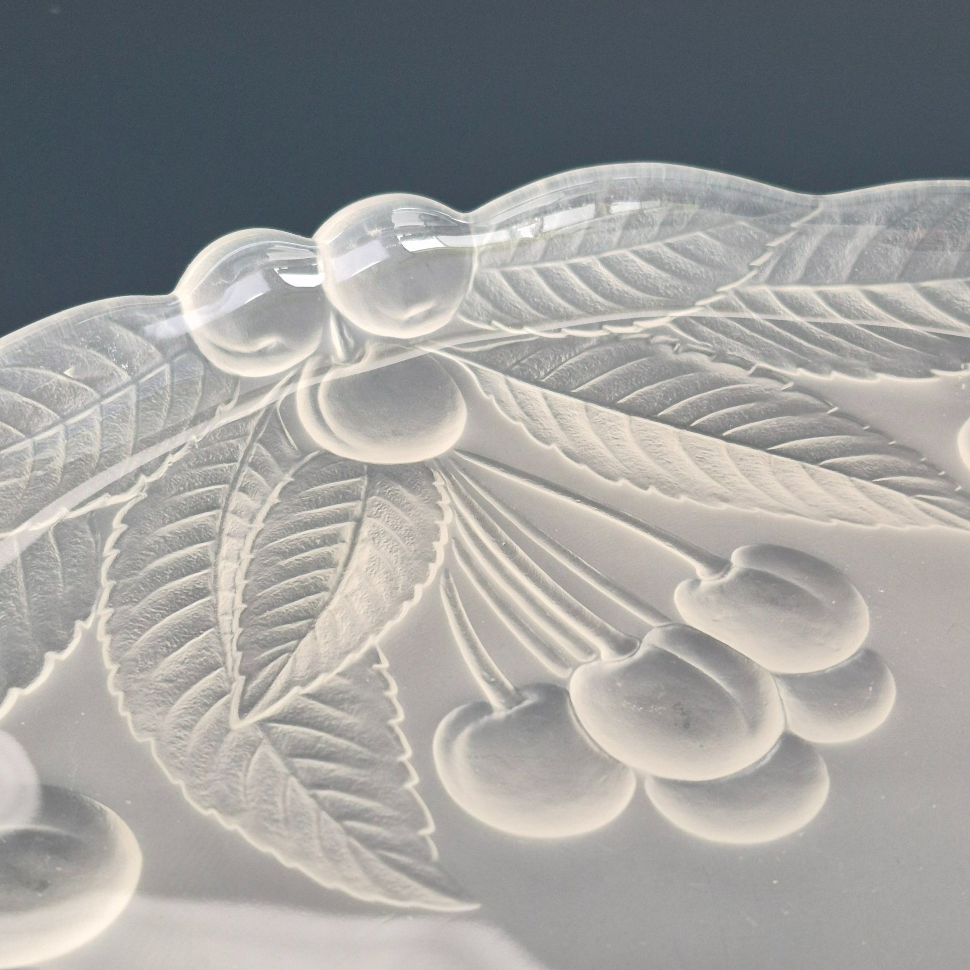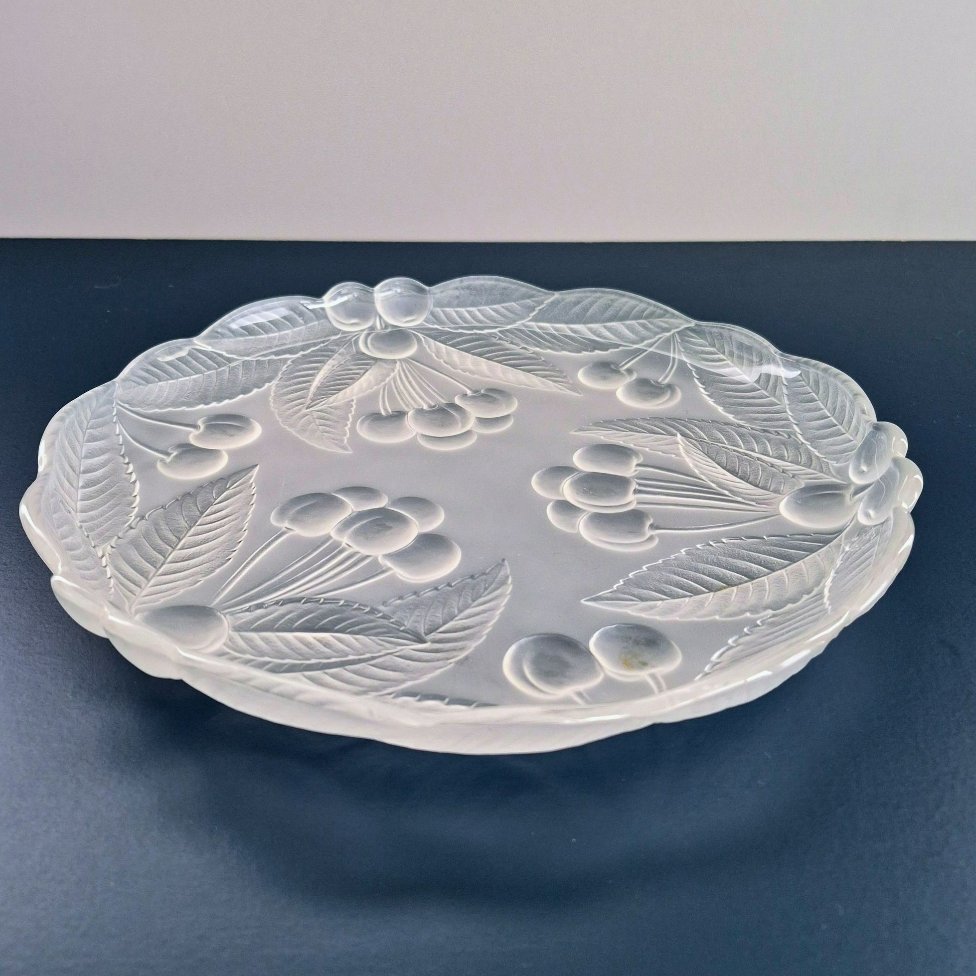 This vintage Mikasa Bountiful Glass Round Serving Platter features a frosted raised cherry design, perfect for elegant dining settings or as a beautiful display piece.
