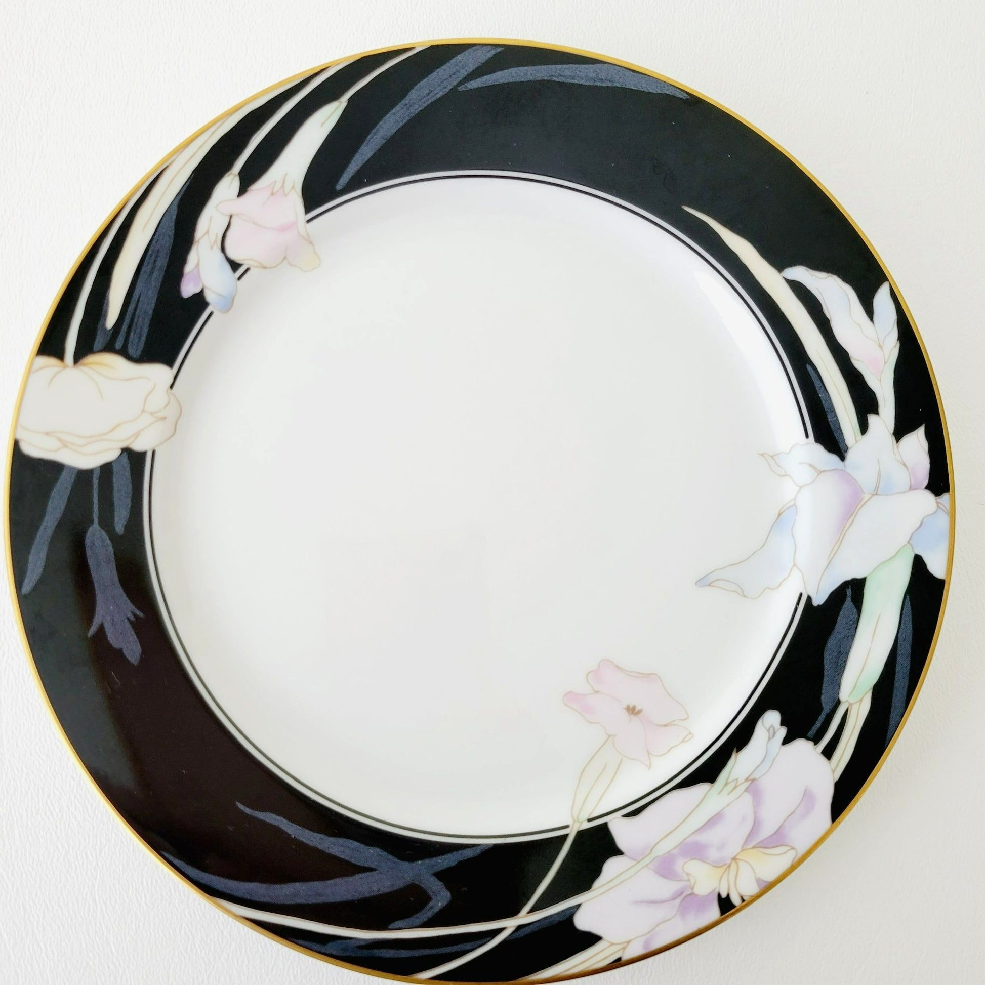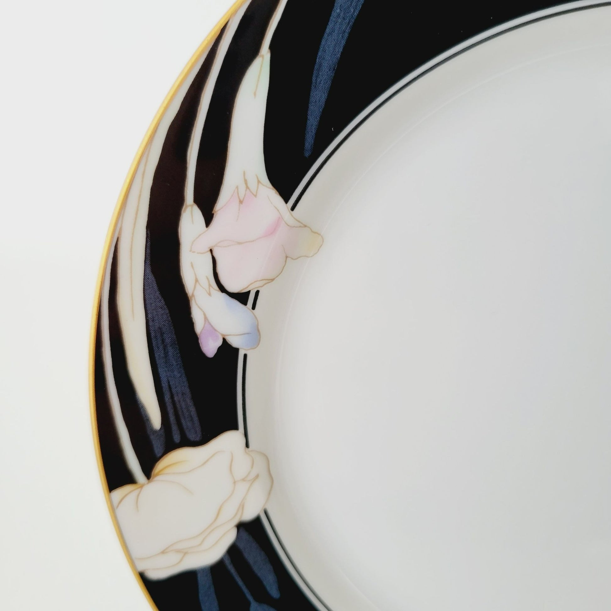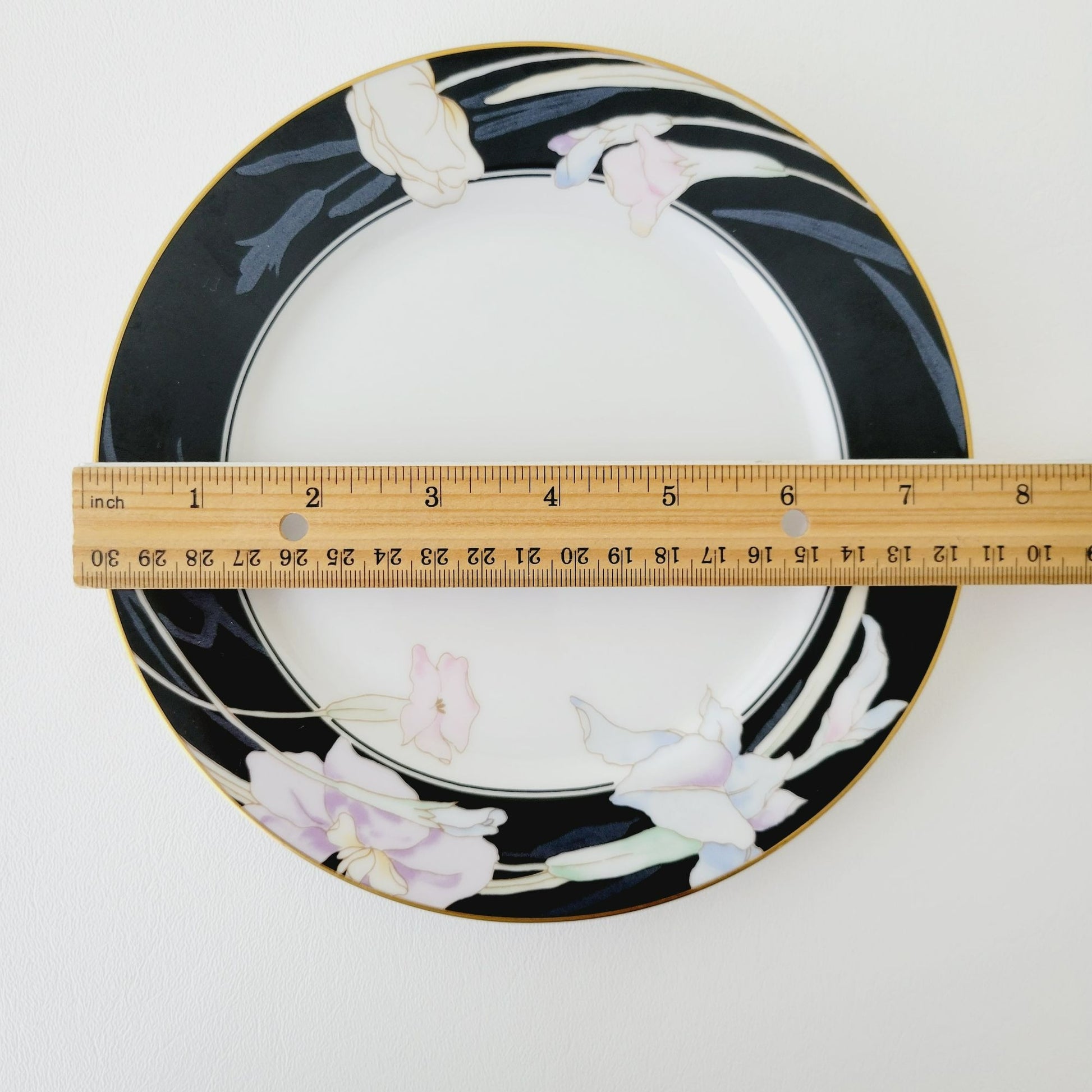 These Mikasa Charisma Black Salad Plates are an authentic piece from the 1980s. It sports a black and white base, accented with a fun pink and blue floral design, offering a retro vibe to your tableware.