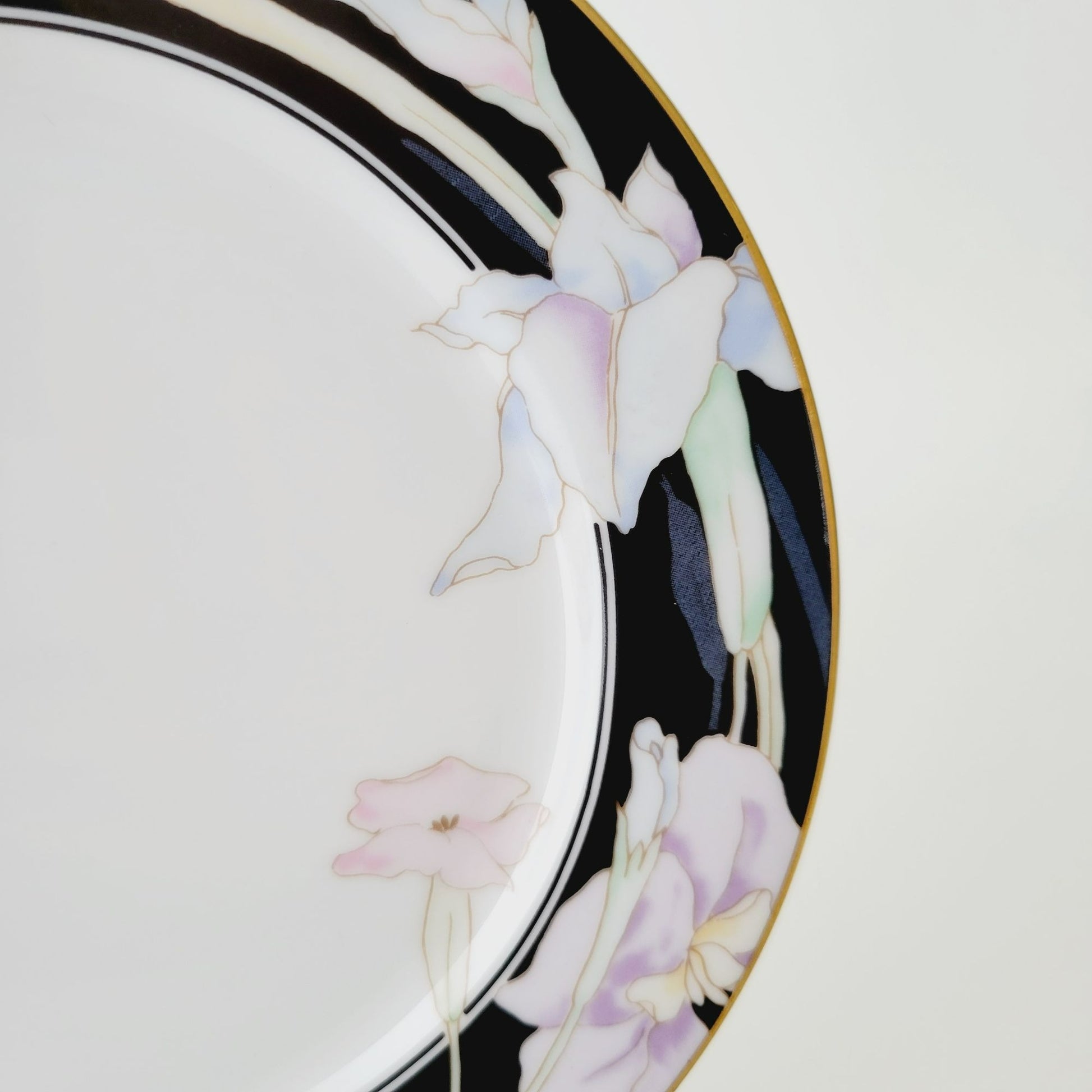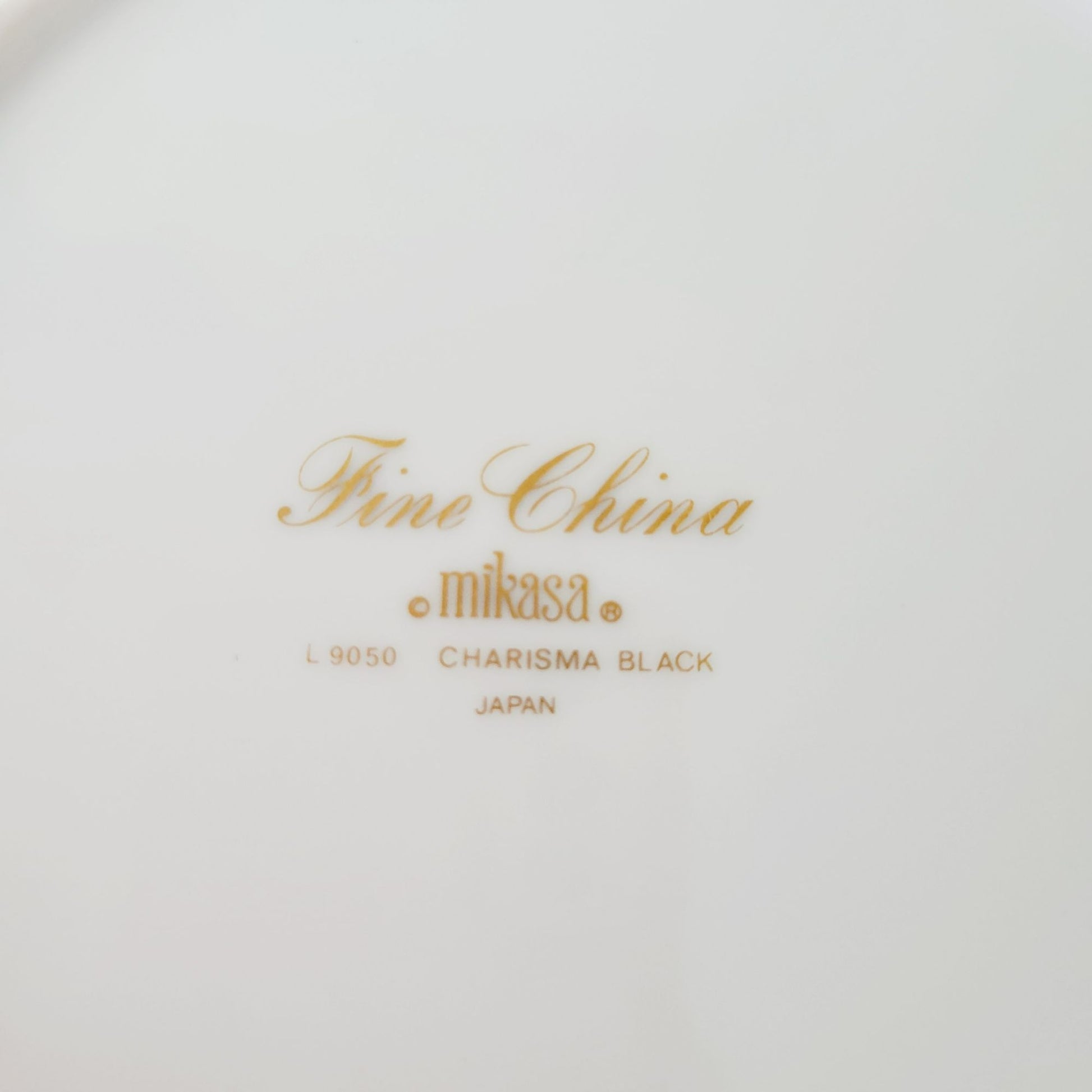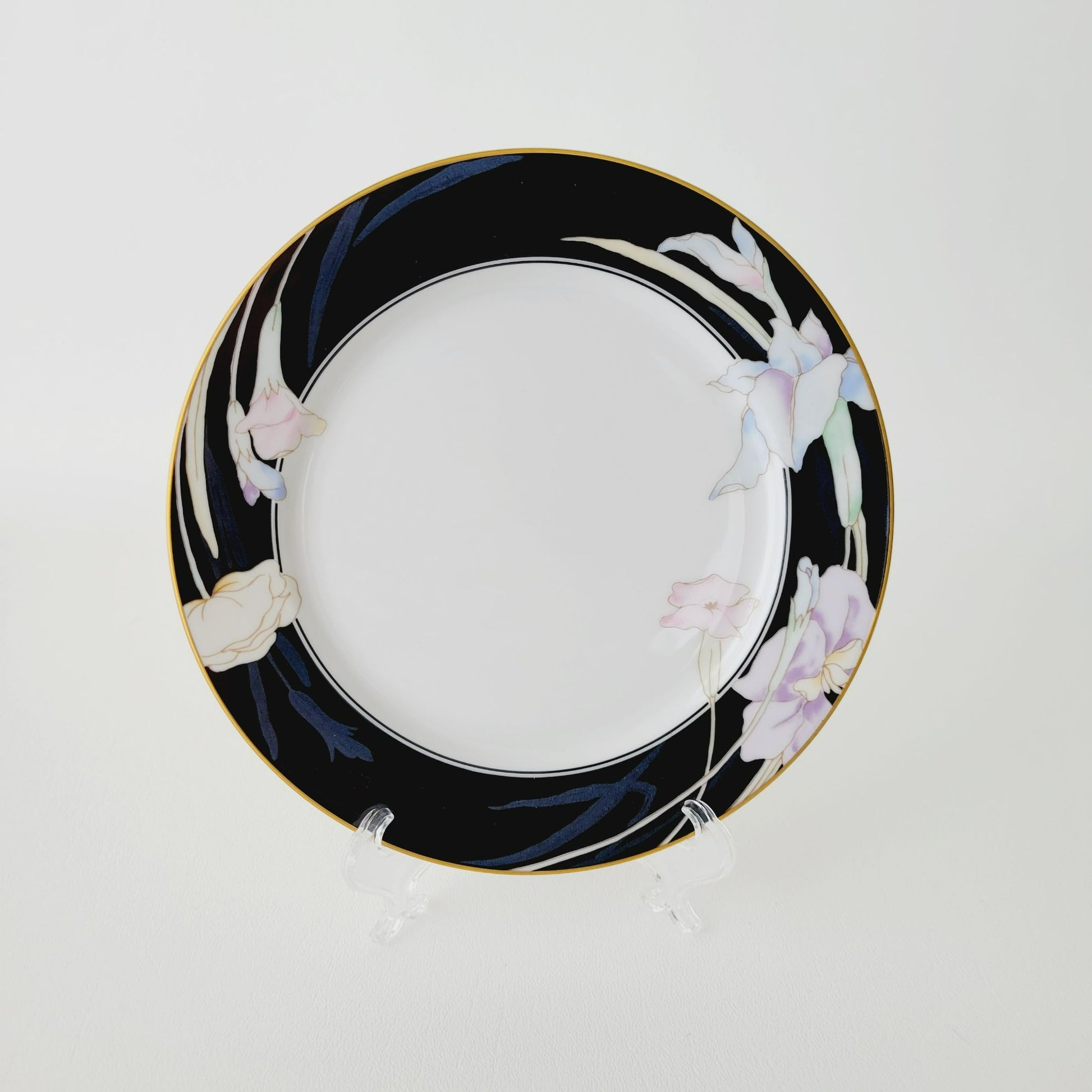 These Mikasa Charisma Black Salad Plates are an authentic piece from the 1980s. It sports a black and white base, accented with a fun pink and blue floral design, offering a retro vibe to your tableware.