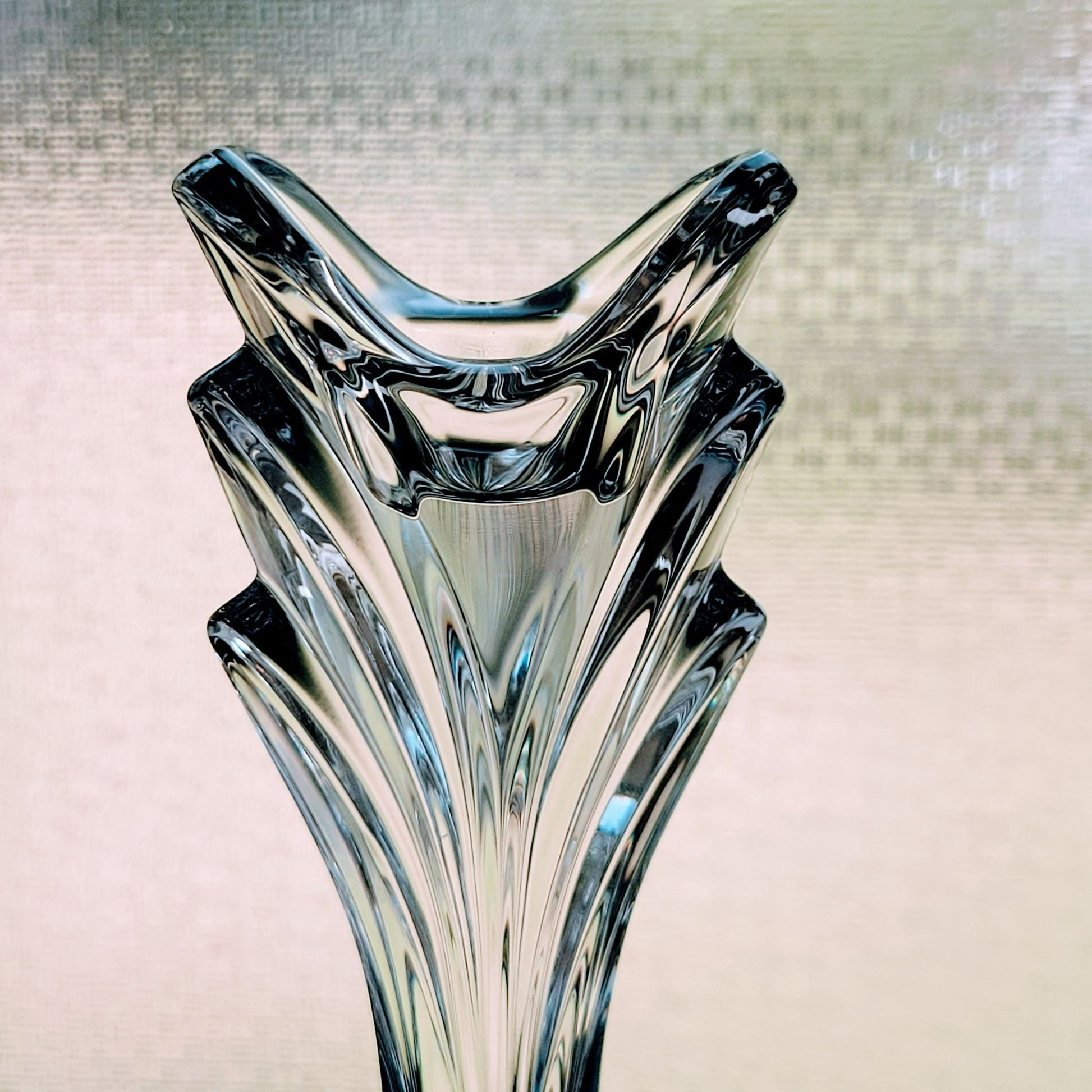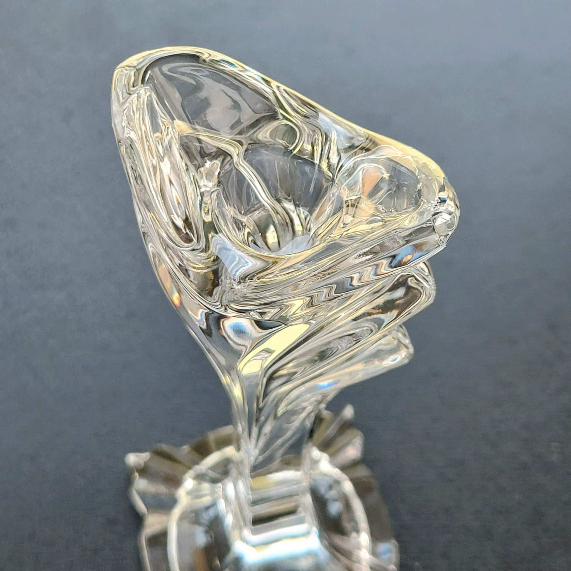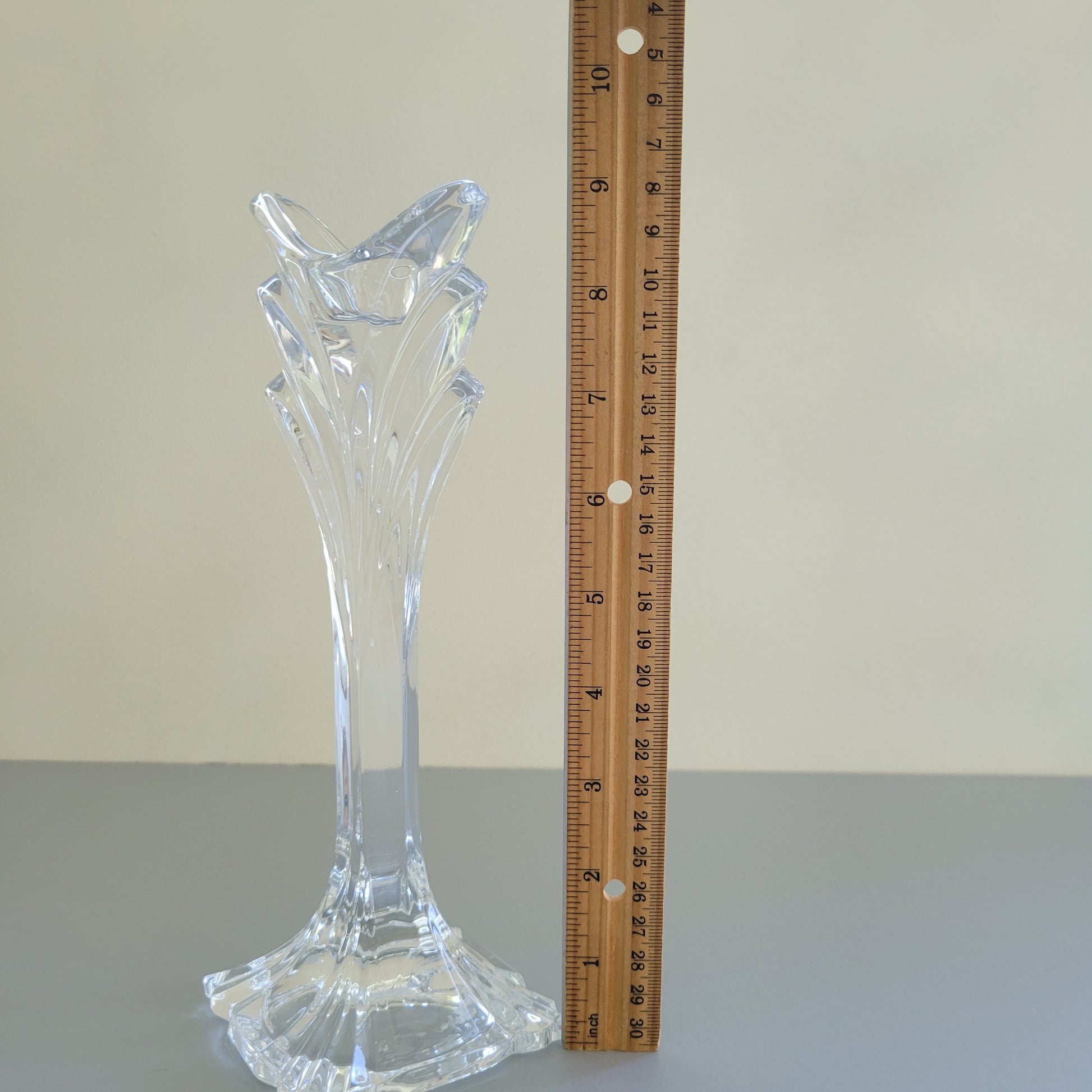 Elevate your decor with this elegant set of two vintage Mikasa Deco crystal candlesticks. Each 9-inch tall, V-shaped holder is crafted in Slovakia, perfect for gifting and special occasions.