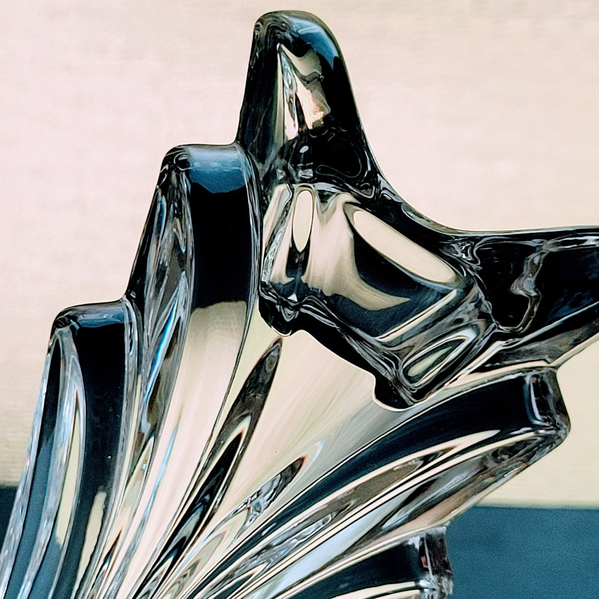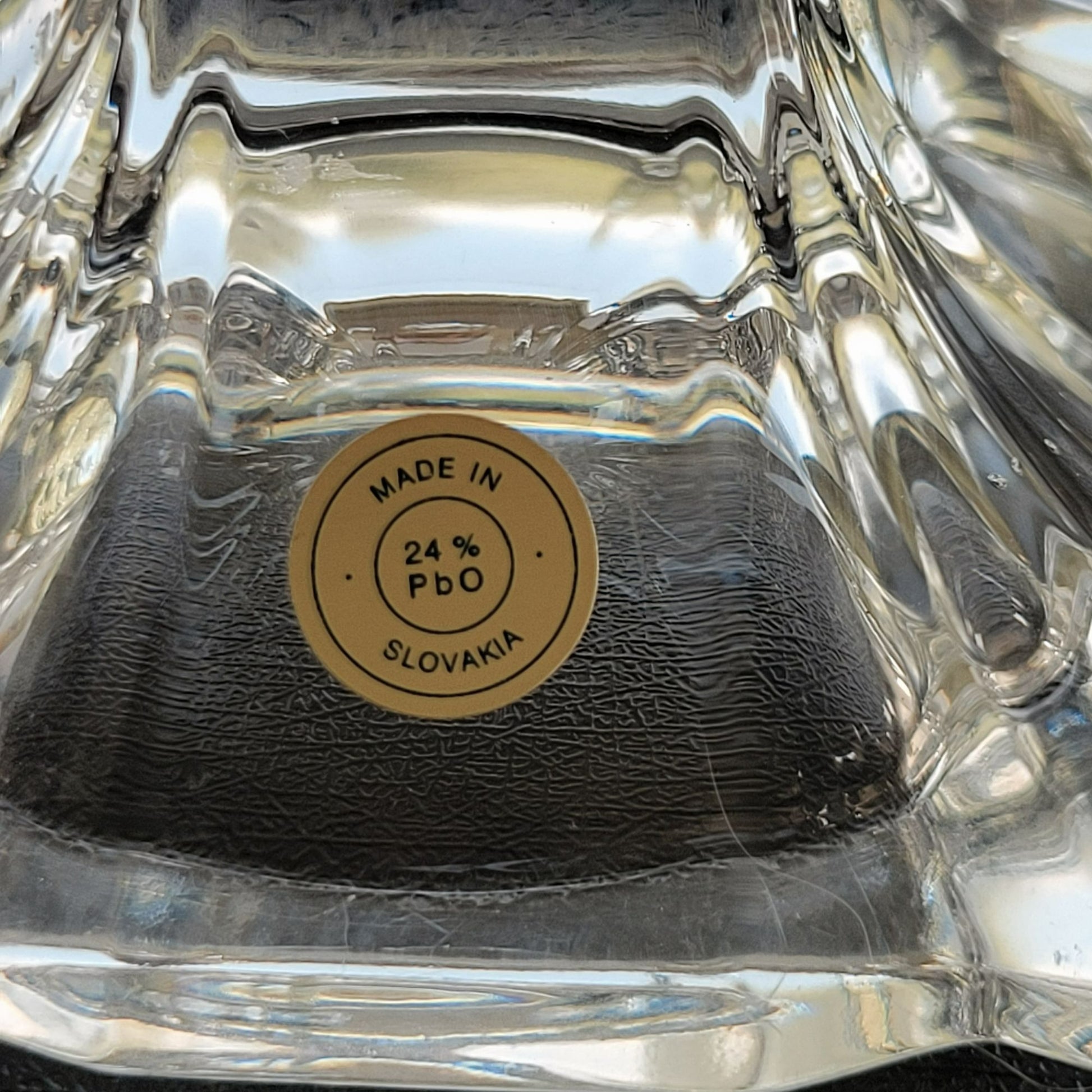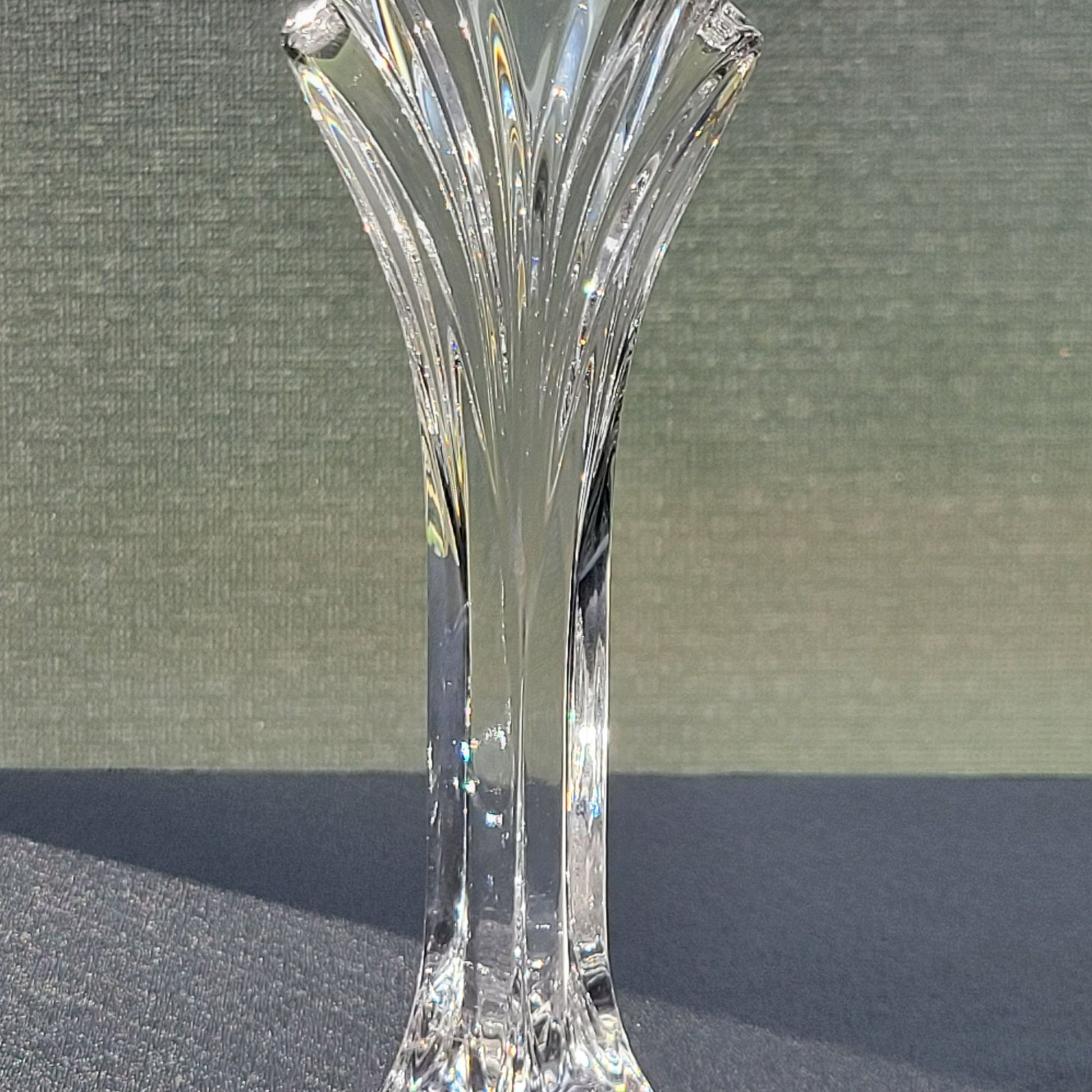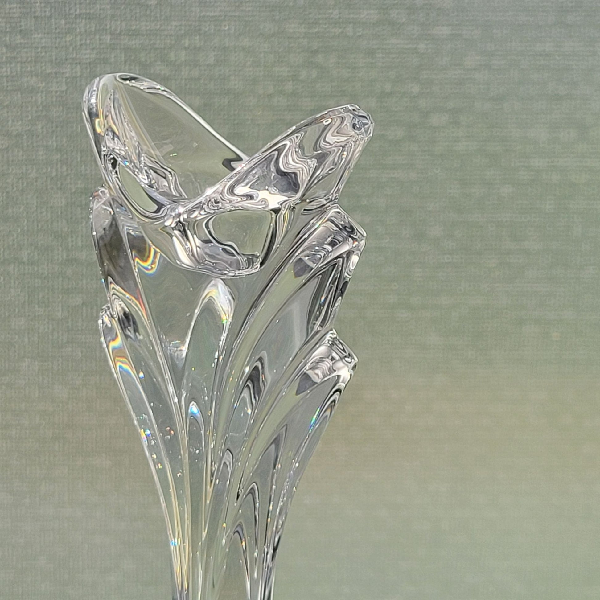 Elevate your decor with this elegant set of two vintage Mikasa Deco crystal candlesticks. Each 9-inch tall, V-shaped holder is crafted in Slovakia, perfect for gifting and special occasions.
