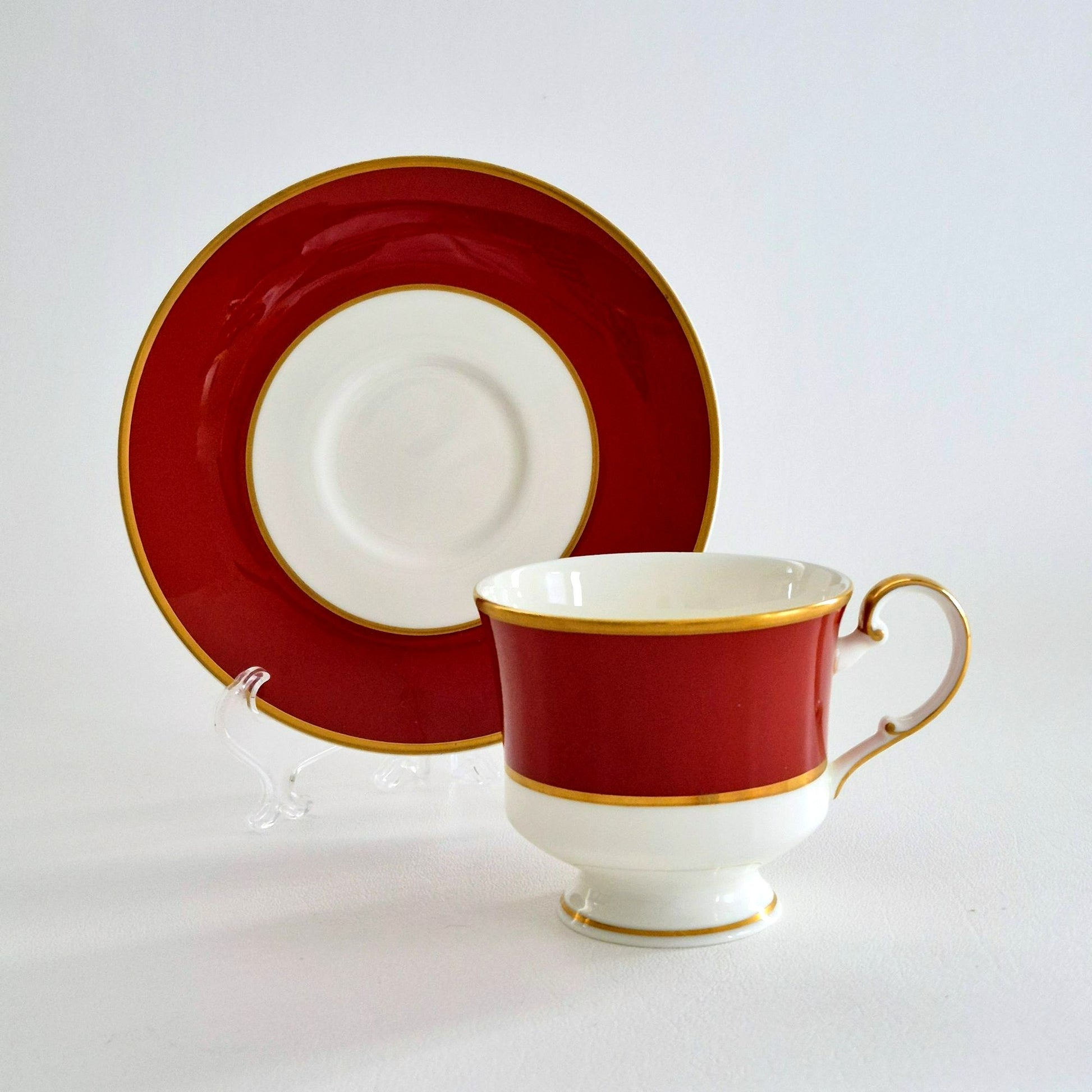 Elegant 1980s Mikasa Egyptian Terra Cotta cup and saucer sets. Features a rust red, white, and gold design. Perfect for collectors or adding a vintage touch to tea time. Made in Japan from quality bone china.