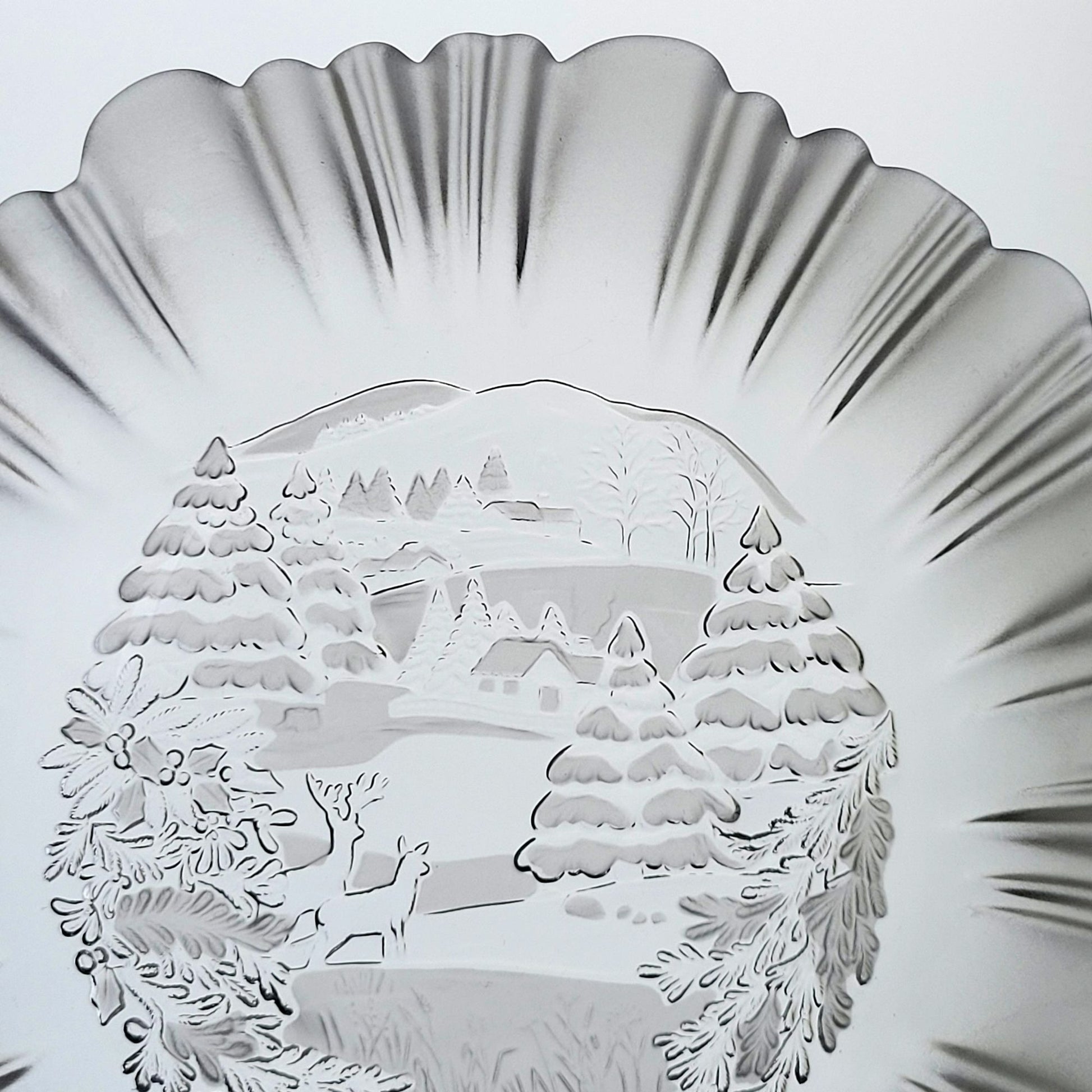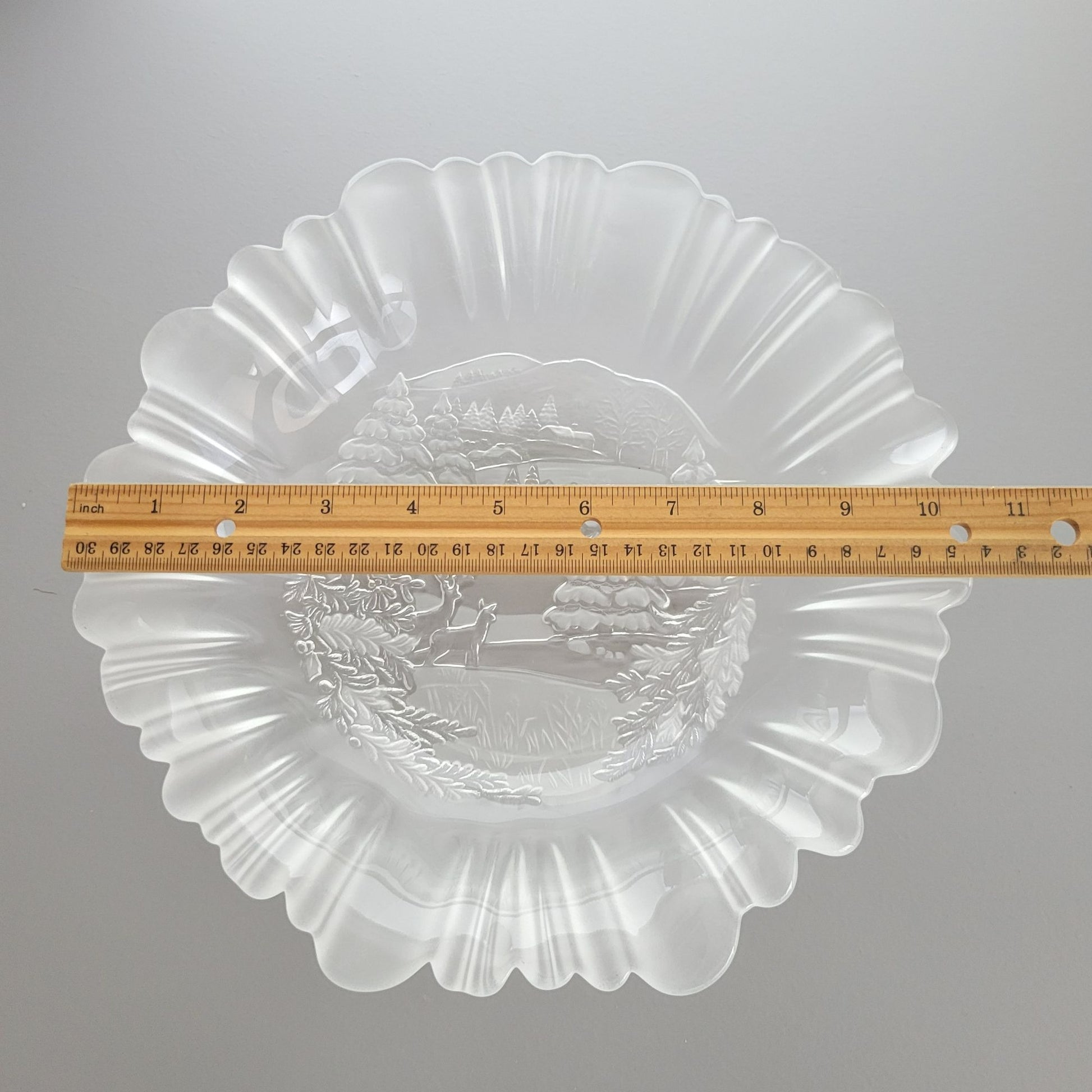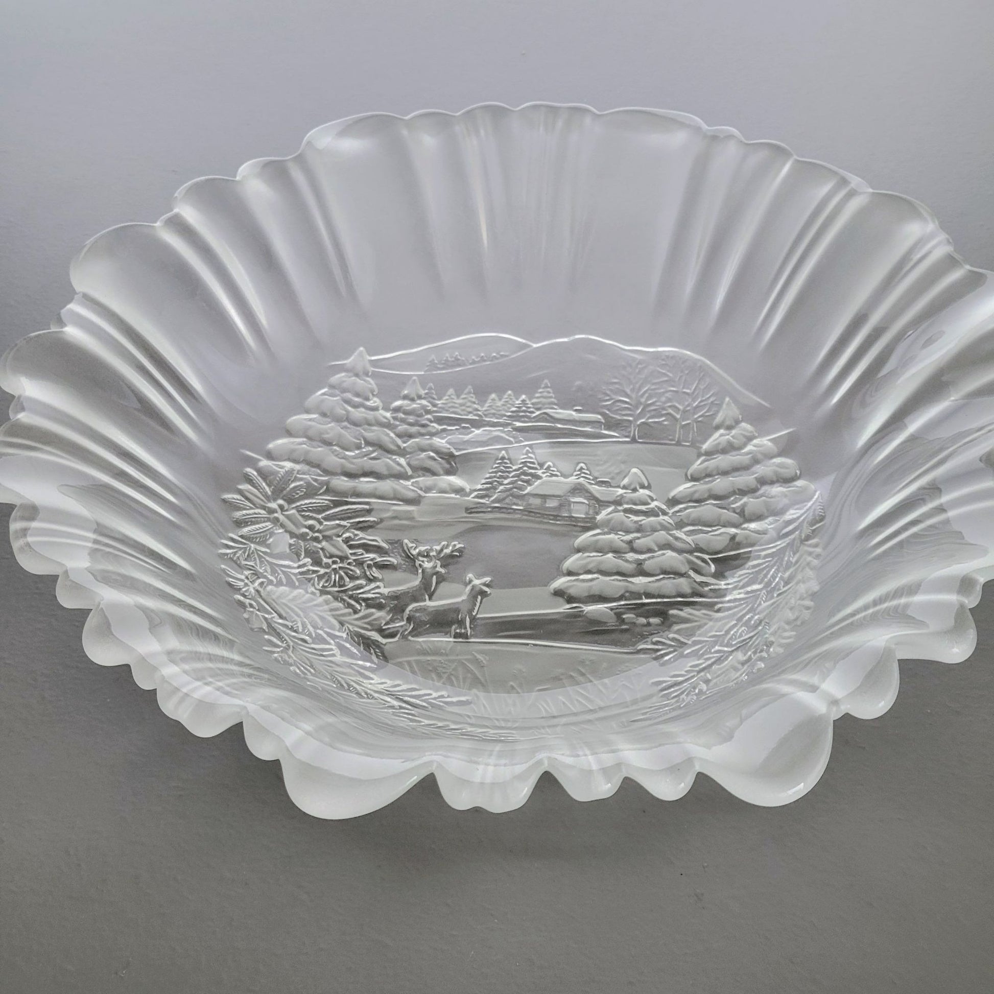 Enhance your winter tabletop décor with this exquisite Mikasa Winter Dreams Frosted serving bowl. Featuring a charming snow, deer, and cabin scene, this discontinued piece is crafted with precision in Germany, perfect for seasonal gatherings and collectors alike.