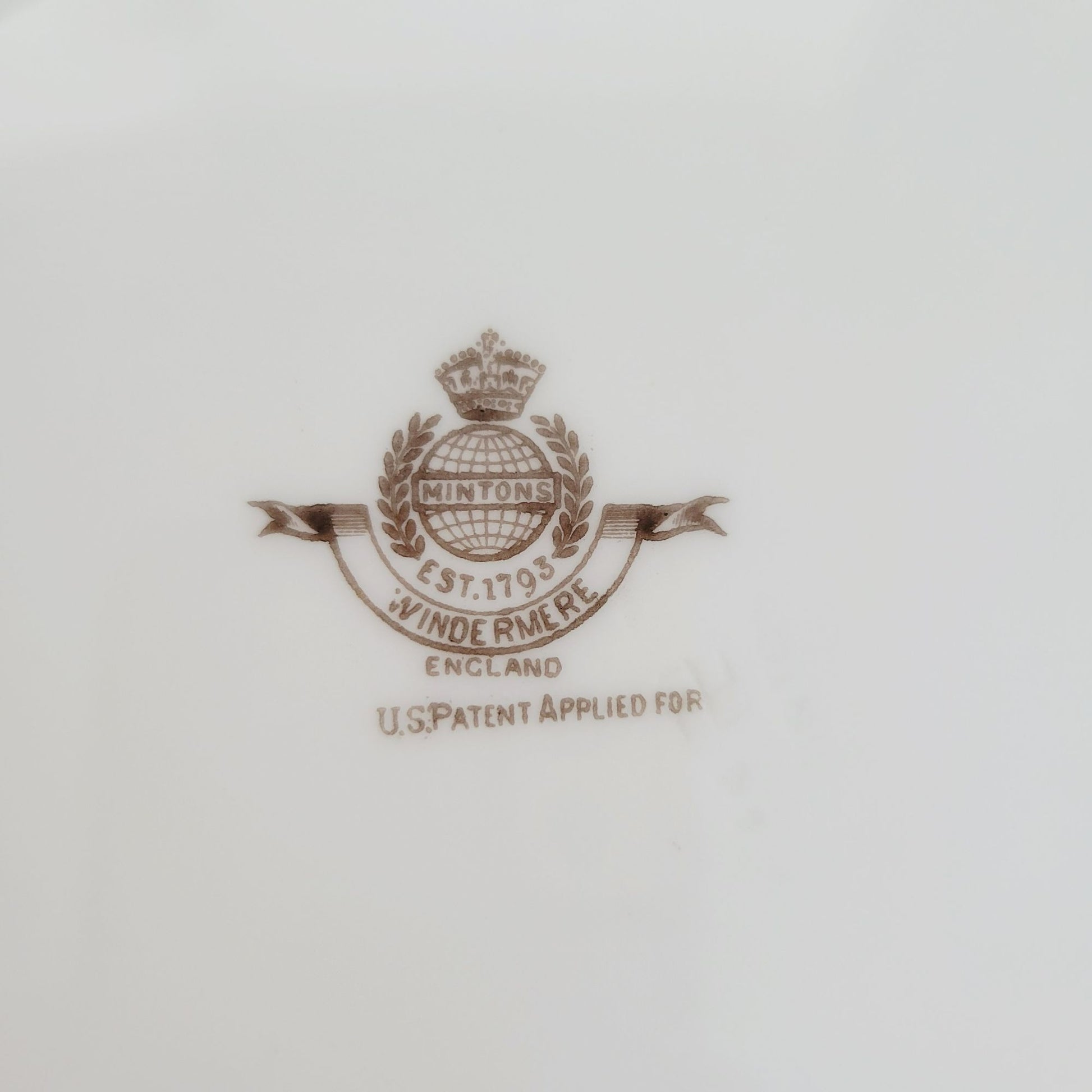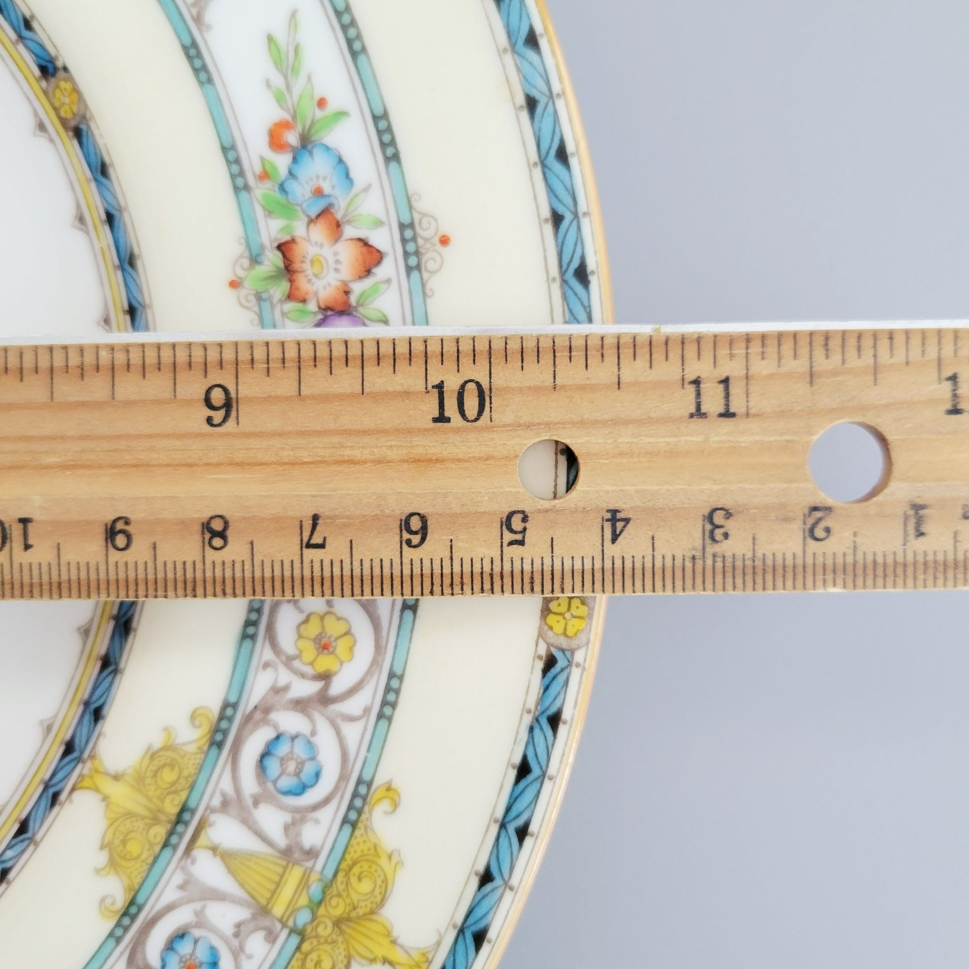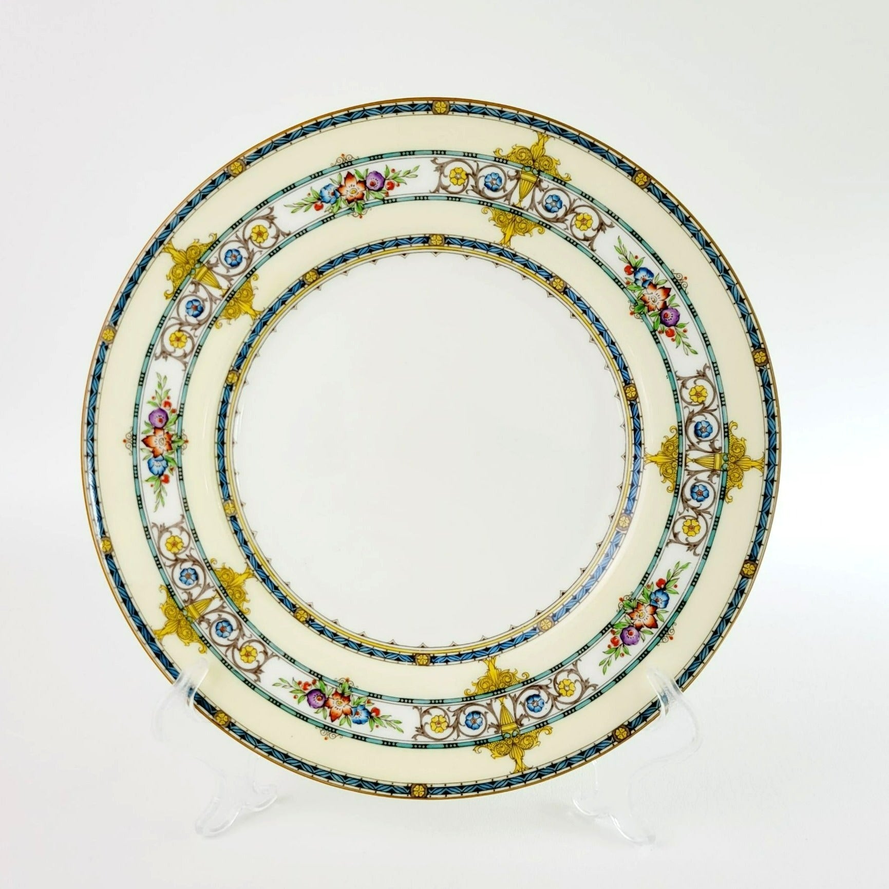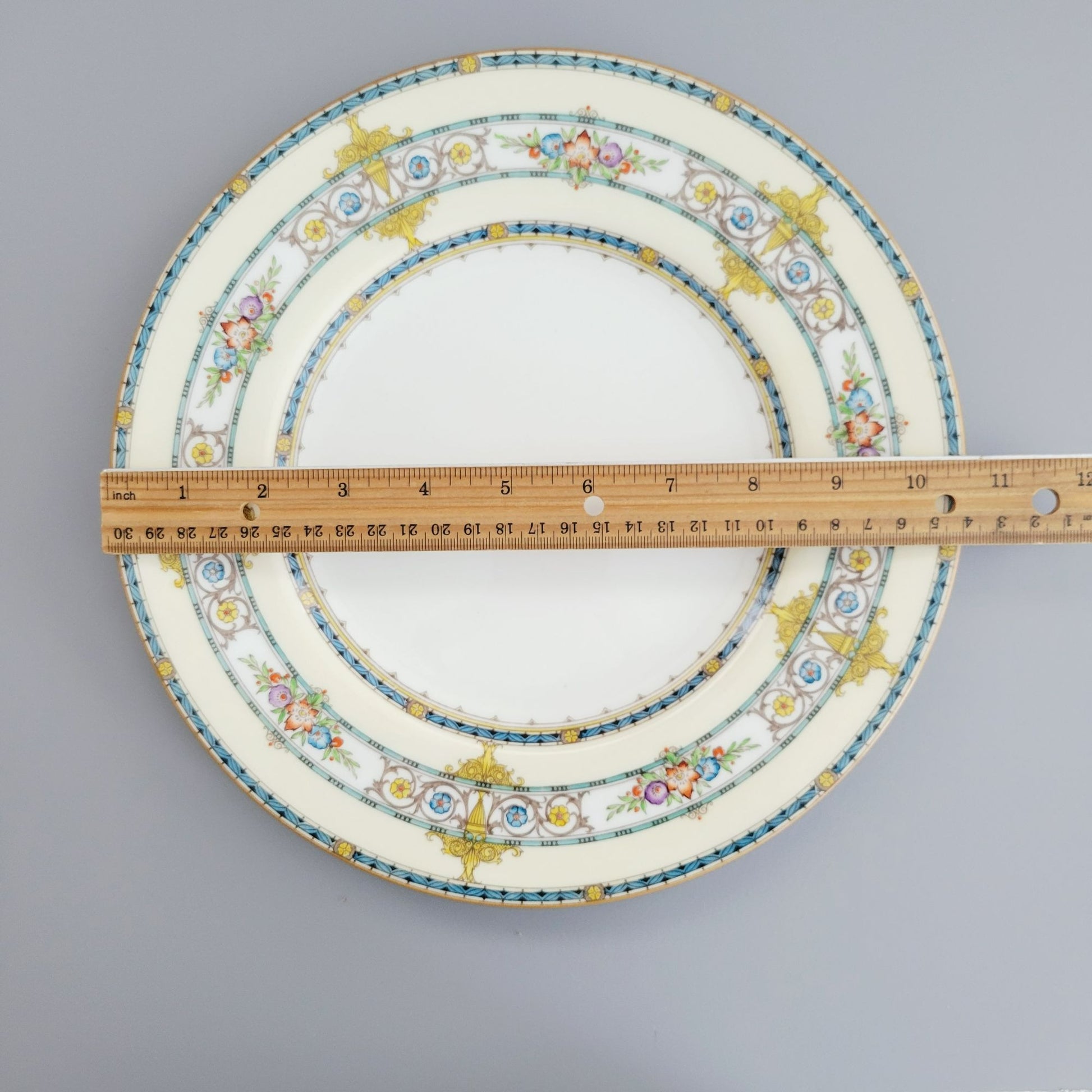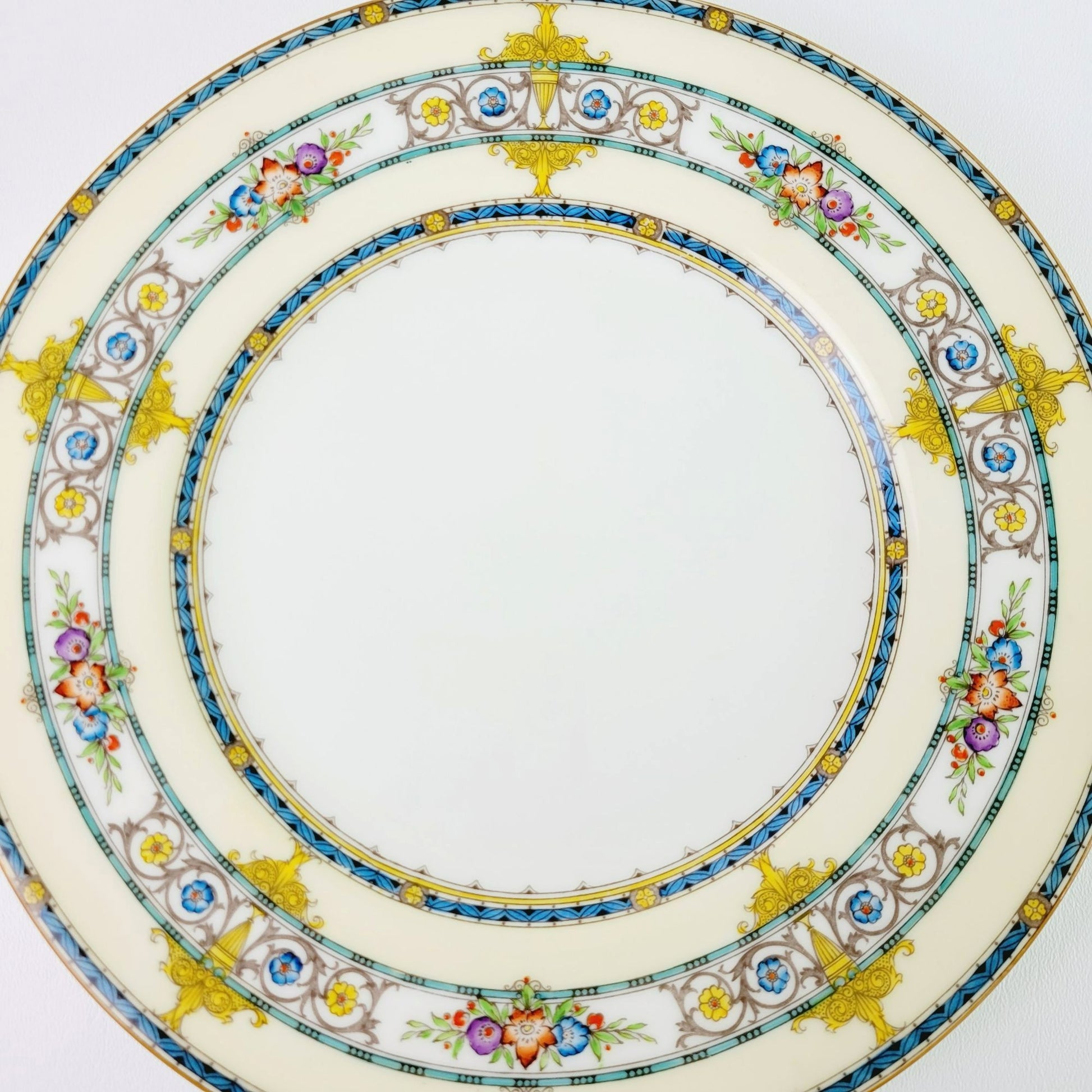 A beautiful Minton Windermere Dinner Plate, showcasing an exquisite aqua band, yellow urns & scrolls, and multicolored flowers. Vintage c.1923-64 from England, this neoclassical dinnerware is a timeless piece for any collection.