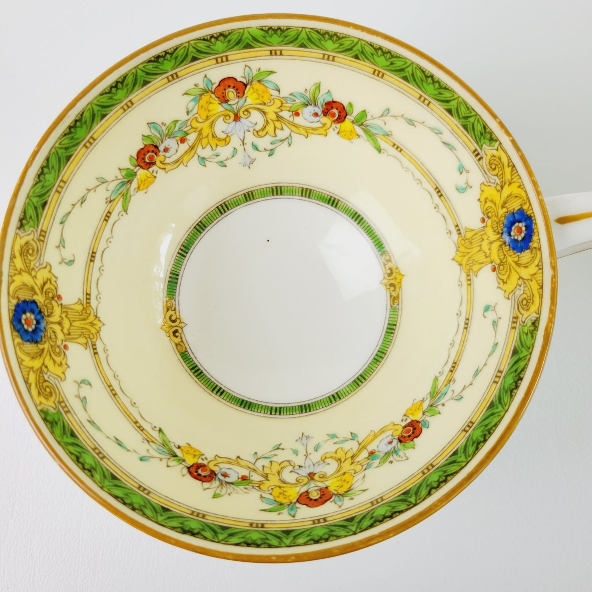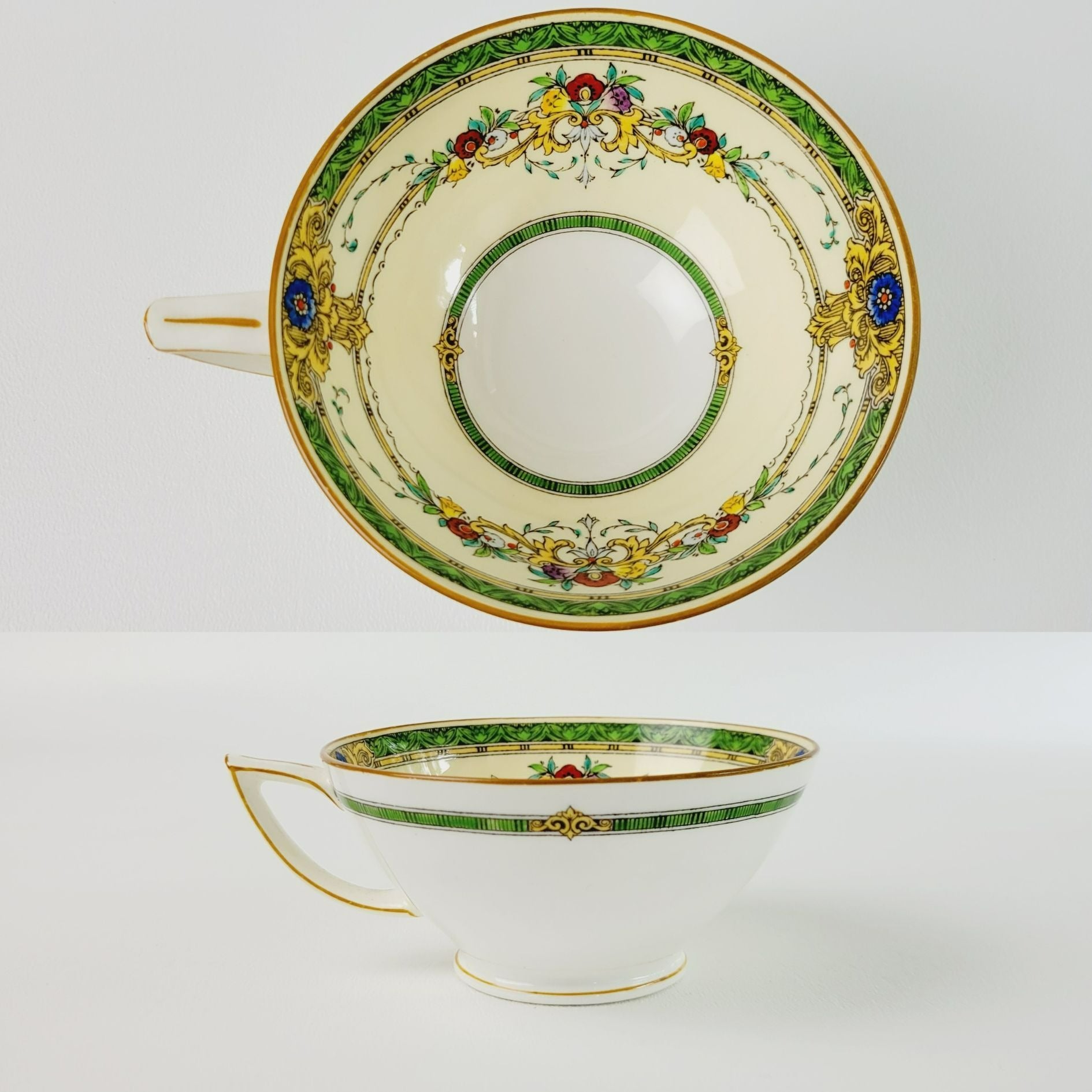 This Minton Windsor Teacup Set of 4 boasts a charming vintage design from 1923-50 England. The creamy porcelain set is adorned with green bands, yellow scrolls, and multicolored flowers, adding a touch of neoclassical elegance to your dinnerware collection.