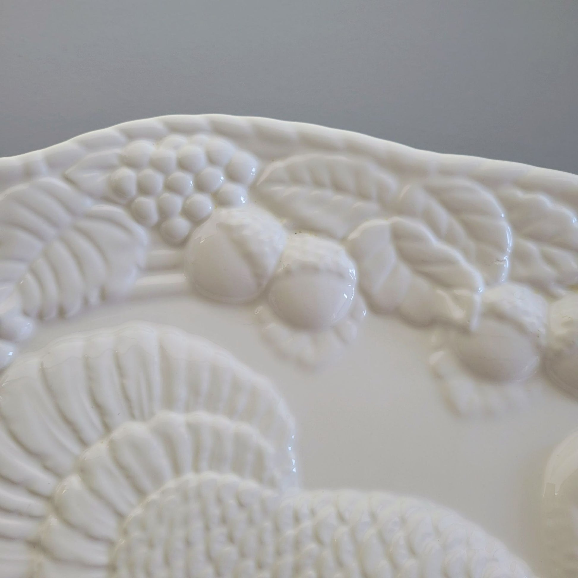 This Montgomery Ward ceramic platter showcases an embossed turkey and harvest motif. Its elegant white glaze adds vintage charm to any holiday table.