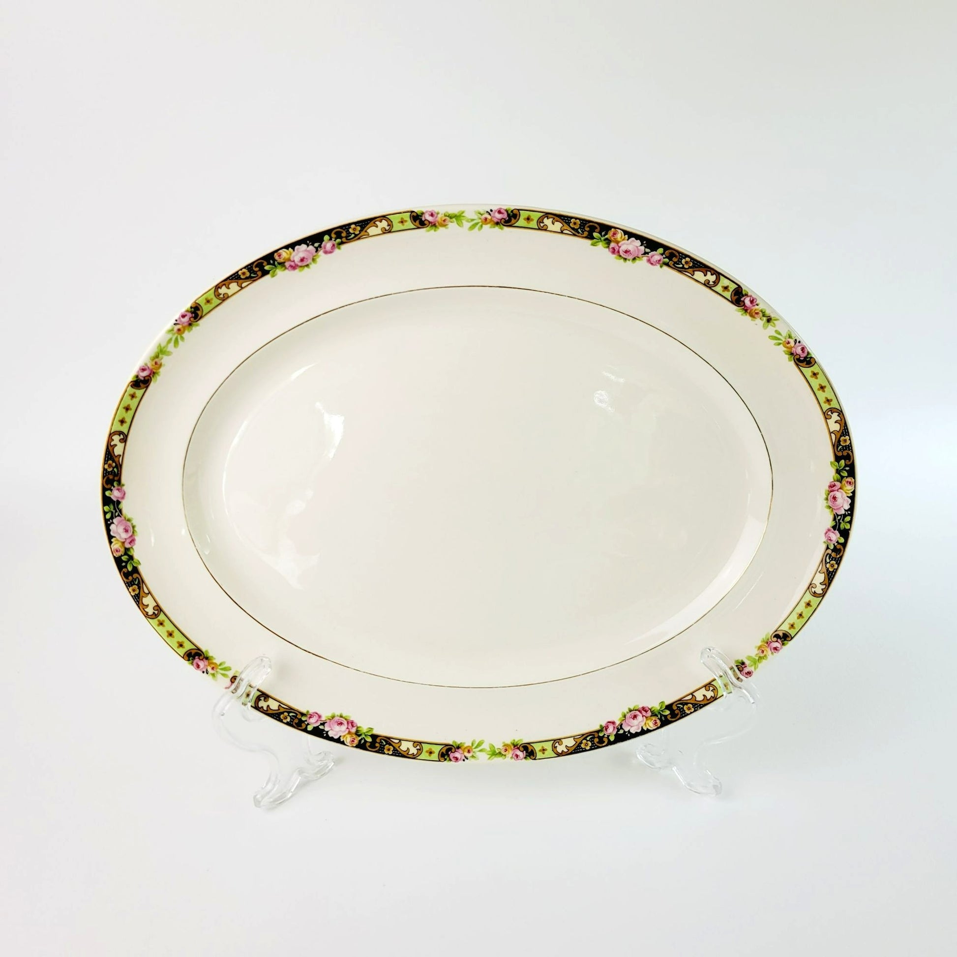 Vintage Mount Clemens Pottery MTC2 oval serving platter, handcrafted in the USA. Features a charming design of pink roses, yellow band, and tan scrolls on a cream background.