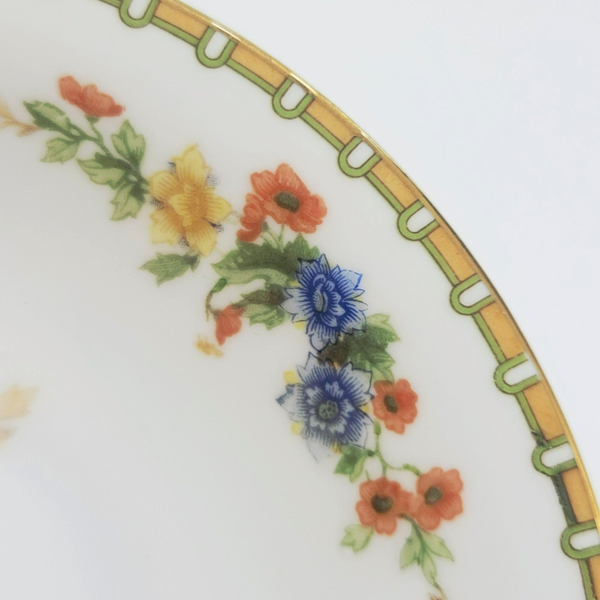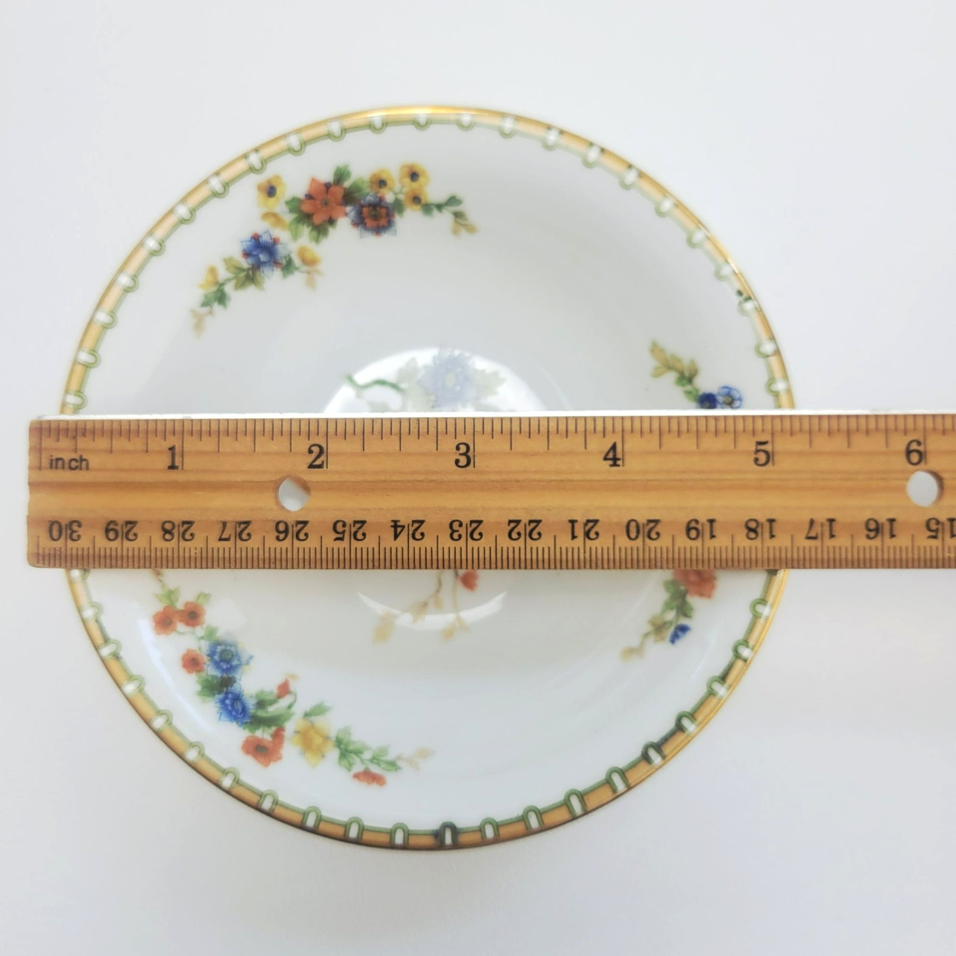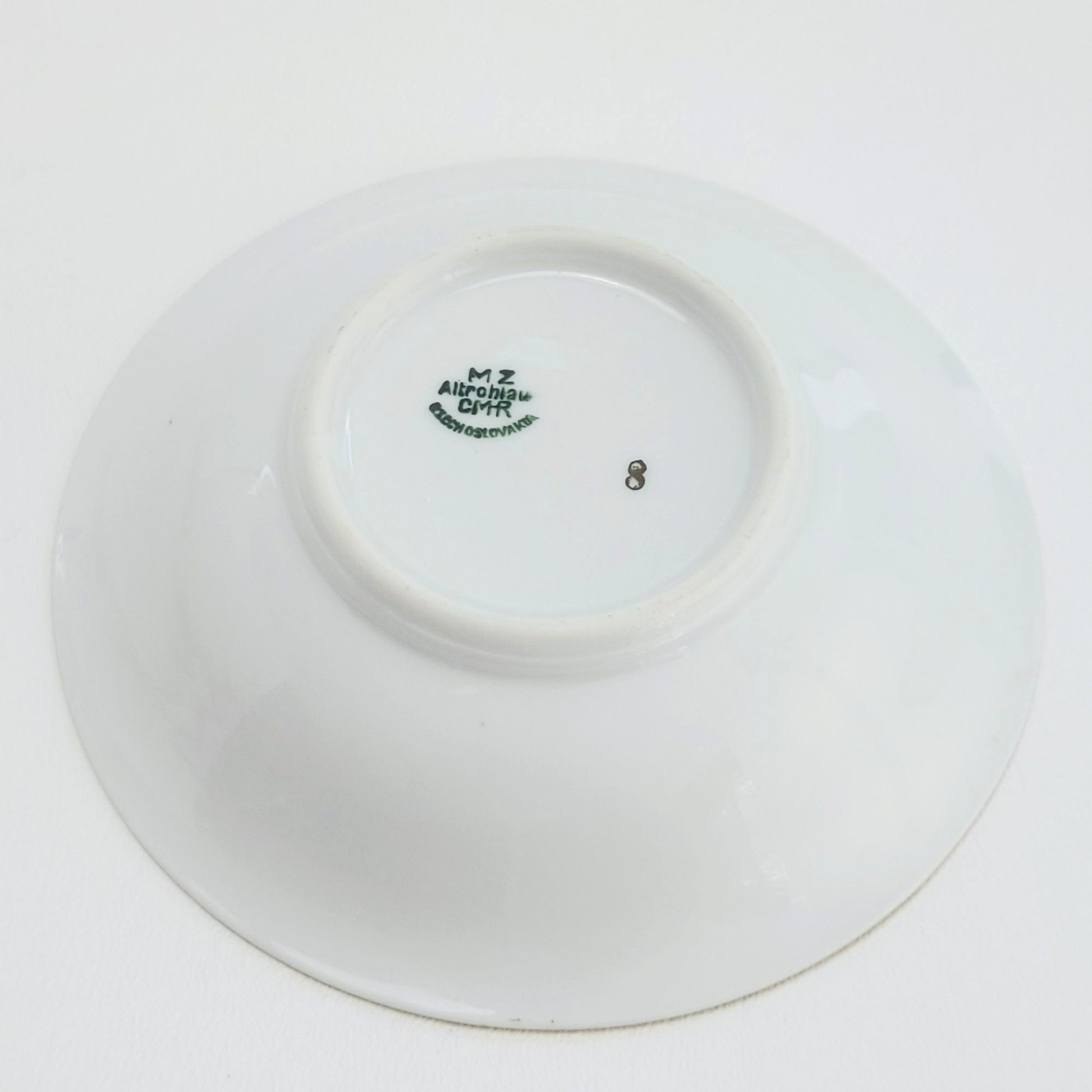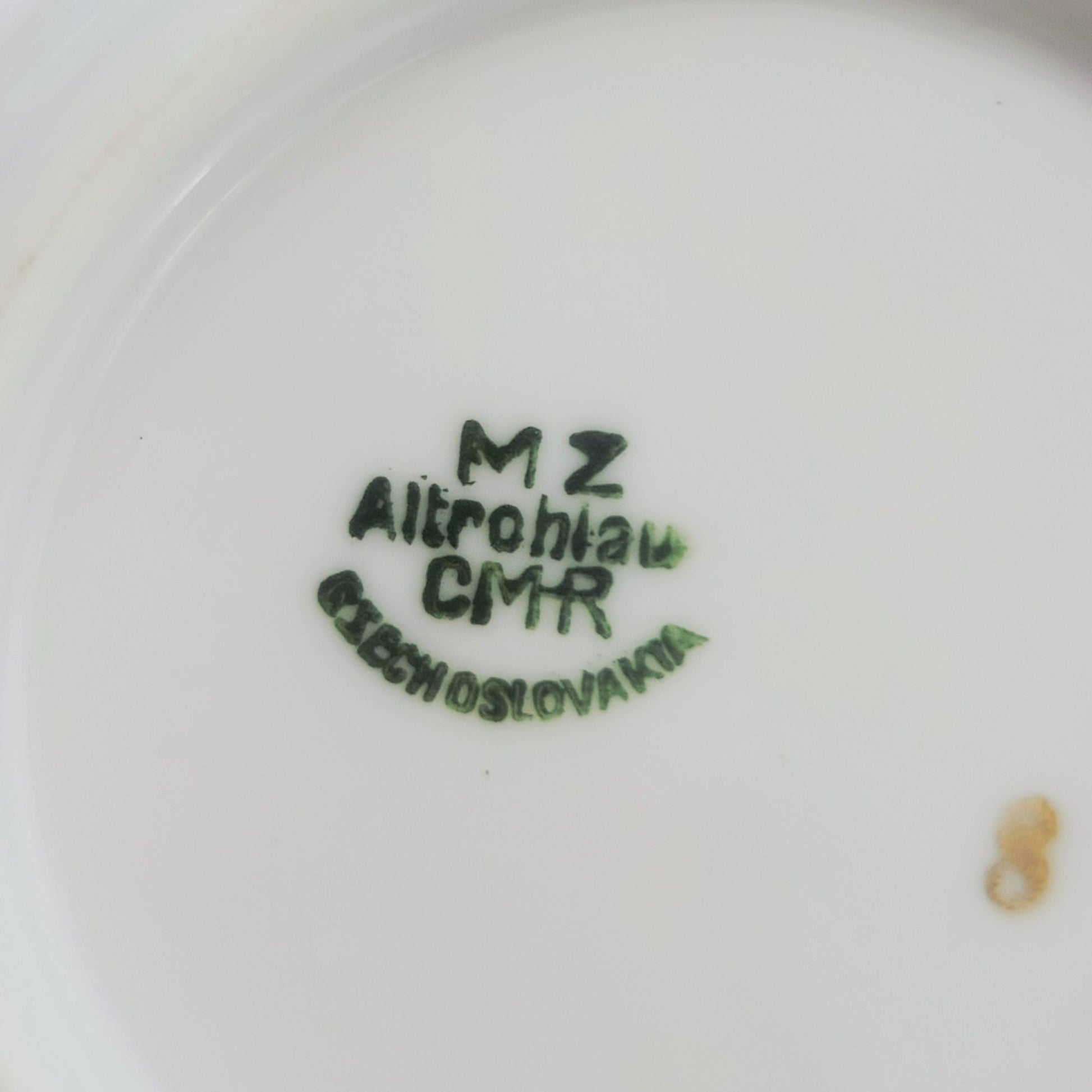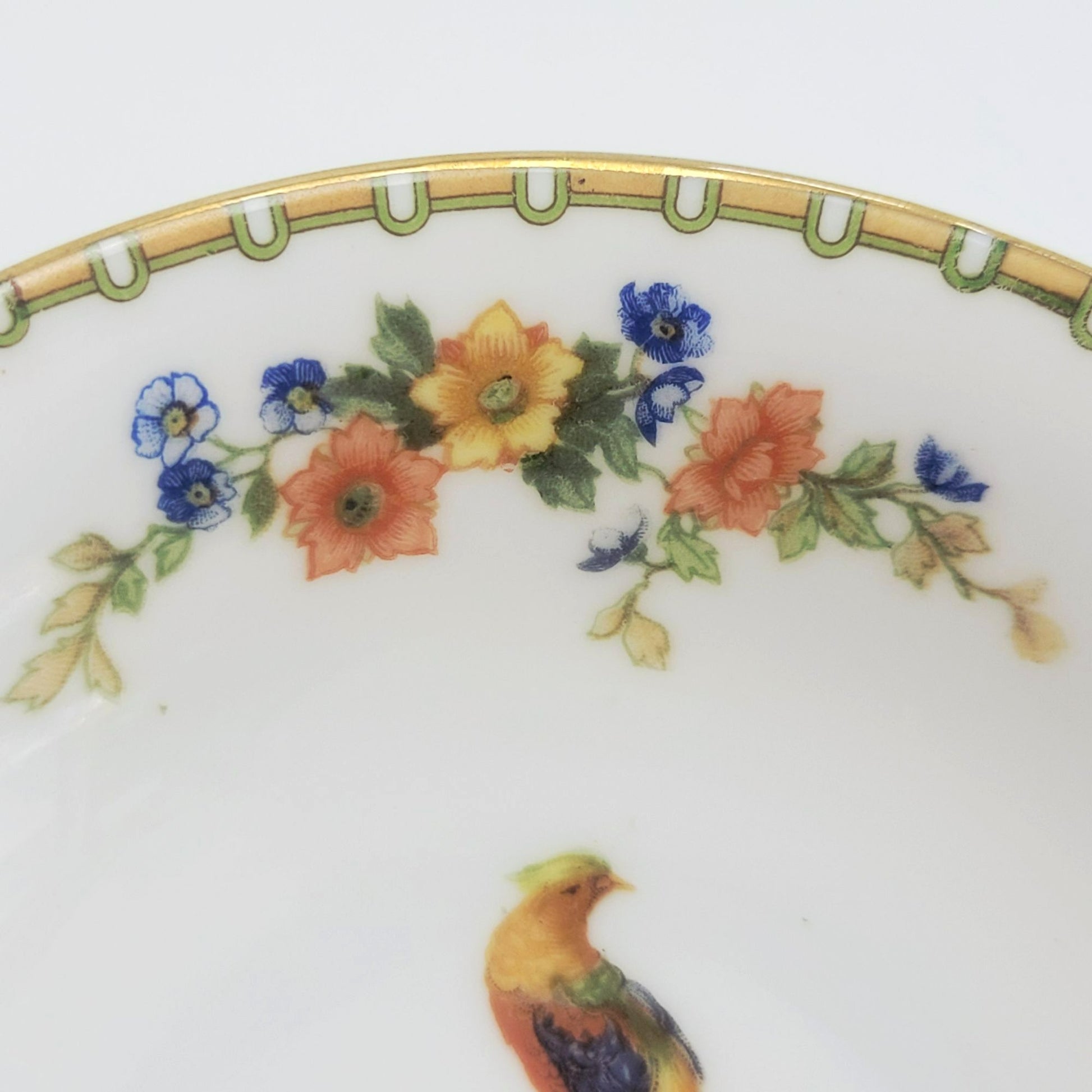 This vintage c.1910s Golden Pheasant Berry Bowl by MZ Altrohlau CM-R is an exquisite piece of Czechoslovakian Porcelain dinnerware. It boasts a delightful orange, blue and green floral and bird design.