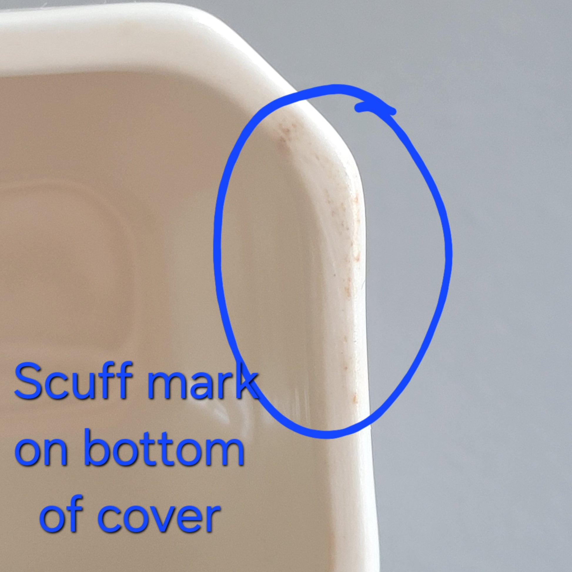 Butter dish is in good condition with no cracks, chips or crazing. There is some brown scuff marks on the bottom of the lid (see photo).