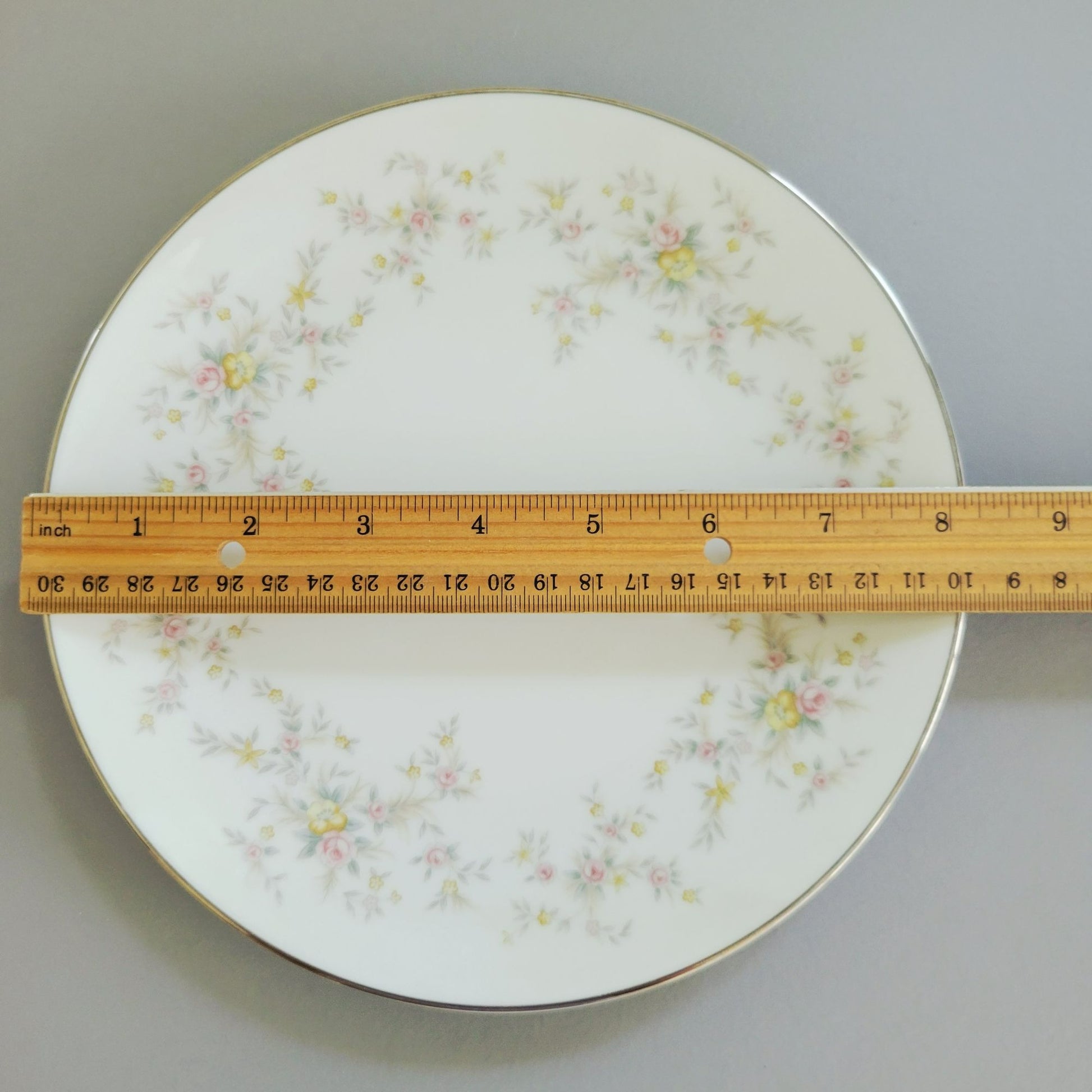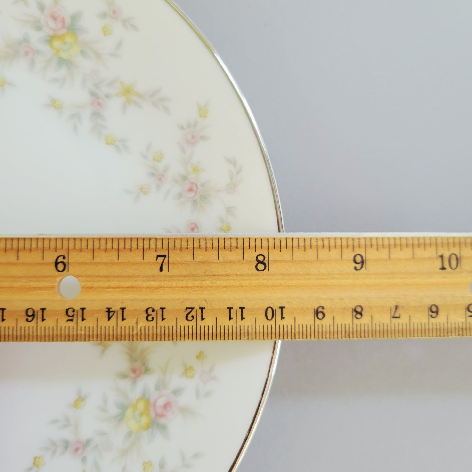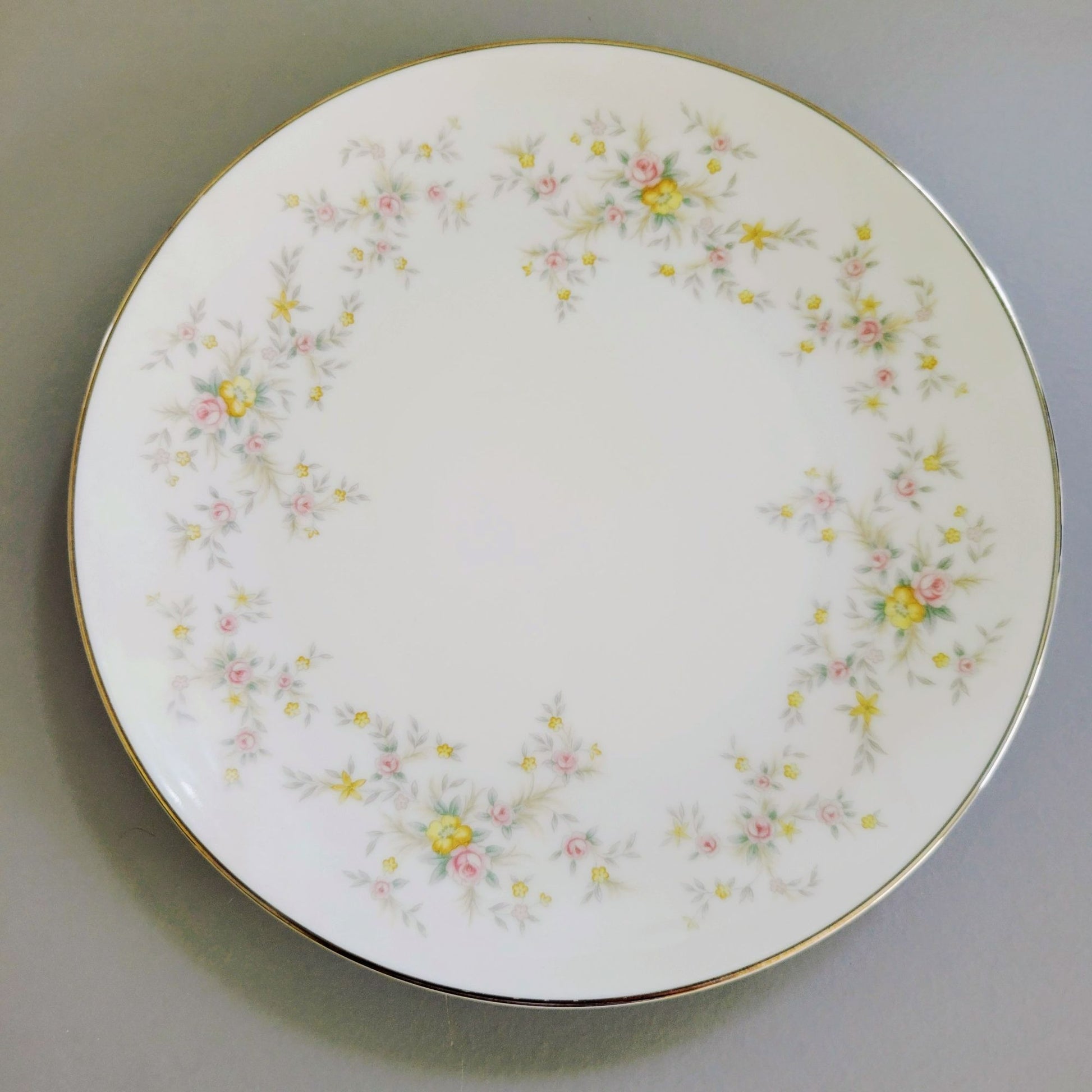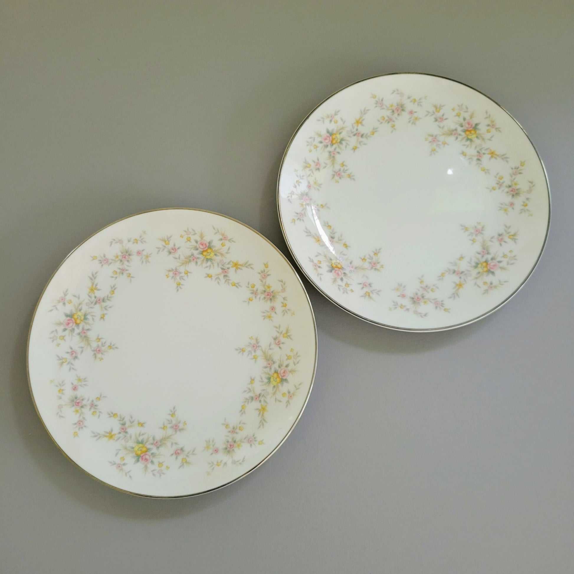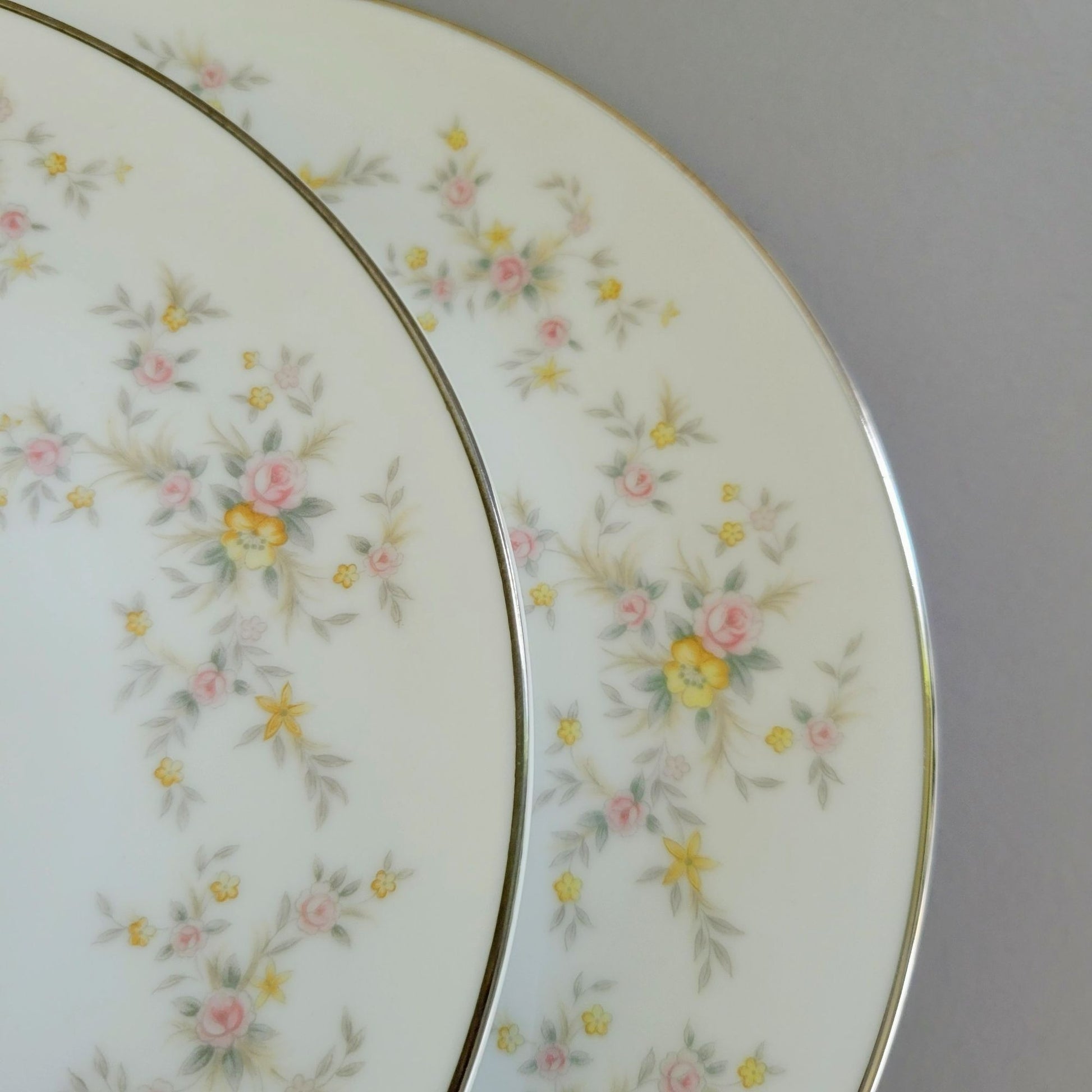 Elevate your table setting with this set of two vintage Noritake Arlene salad plates. Featuring a charming design of pink roses, yellow wildflowers, and gray leaves with silver trim.