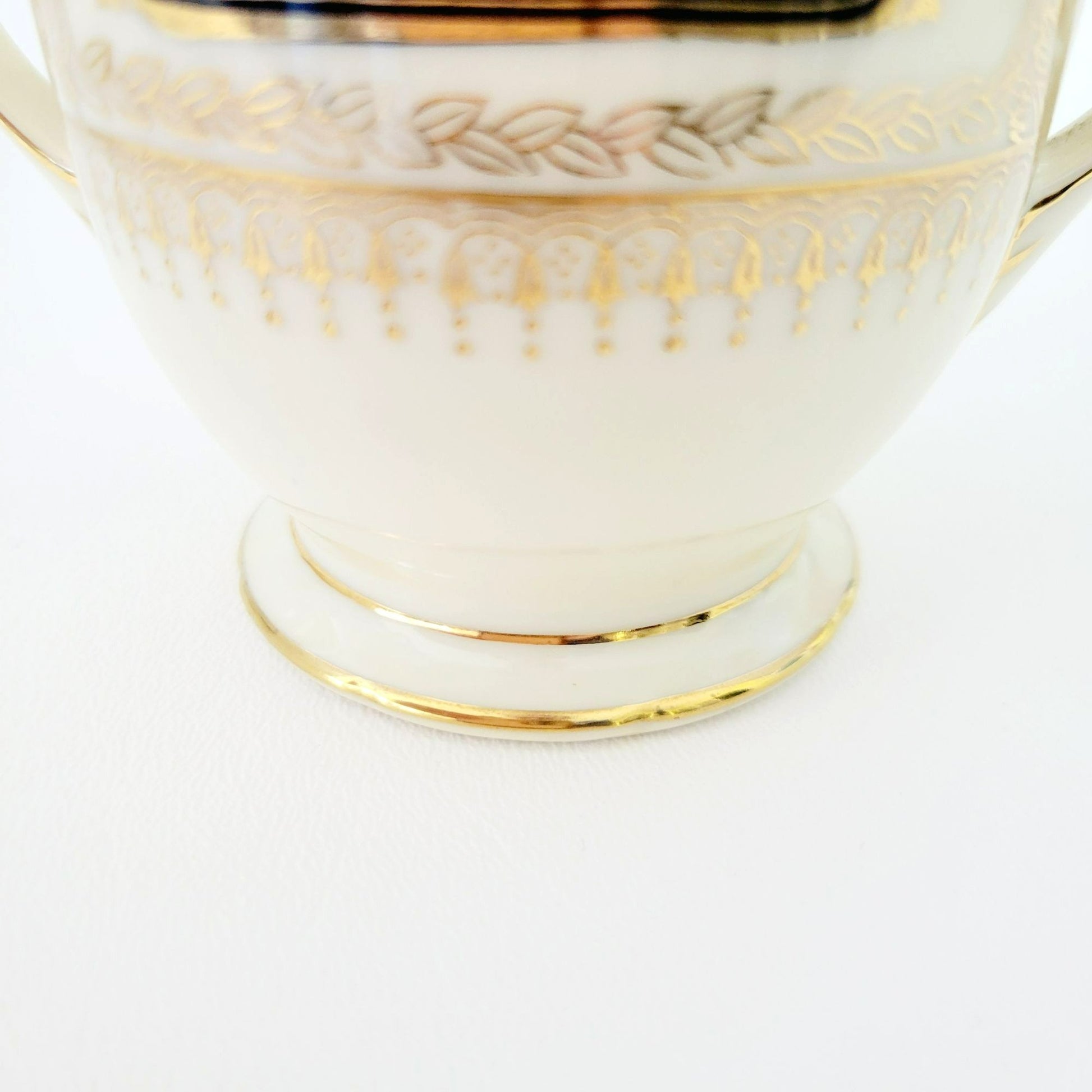 A vintage Noritake Art Nouveau Creamer & Sugar Bowl set from the c1940s. Hand-painted gold and black laurel floral pattern over a cream base. Features scalloped edges, exemplifying Japanese craftsmanship.