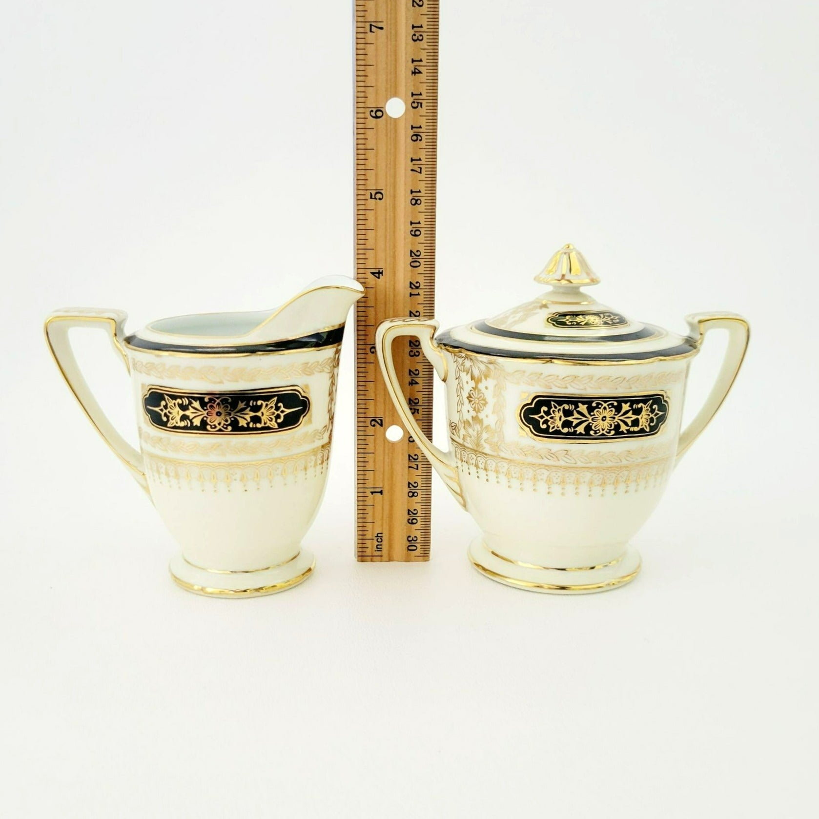 Noritake Art Nouveau Creamer & Sugar Bowl, Vintage c1940s, Cream Base Hand Painted Black and Gold Laurel Floral Pattern