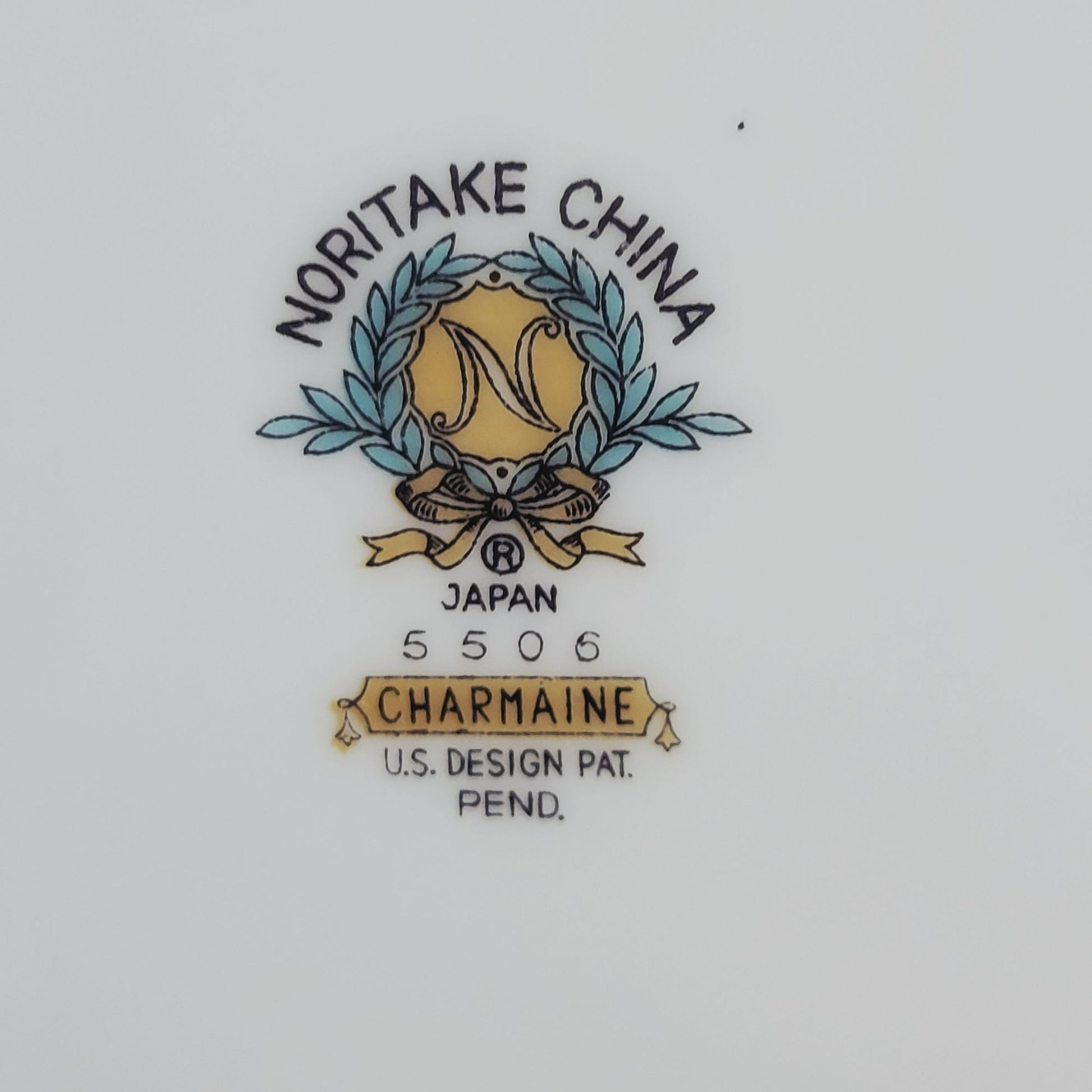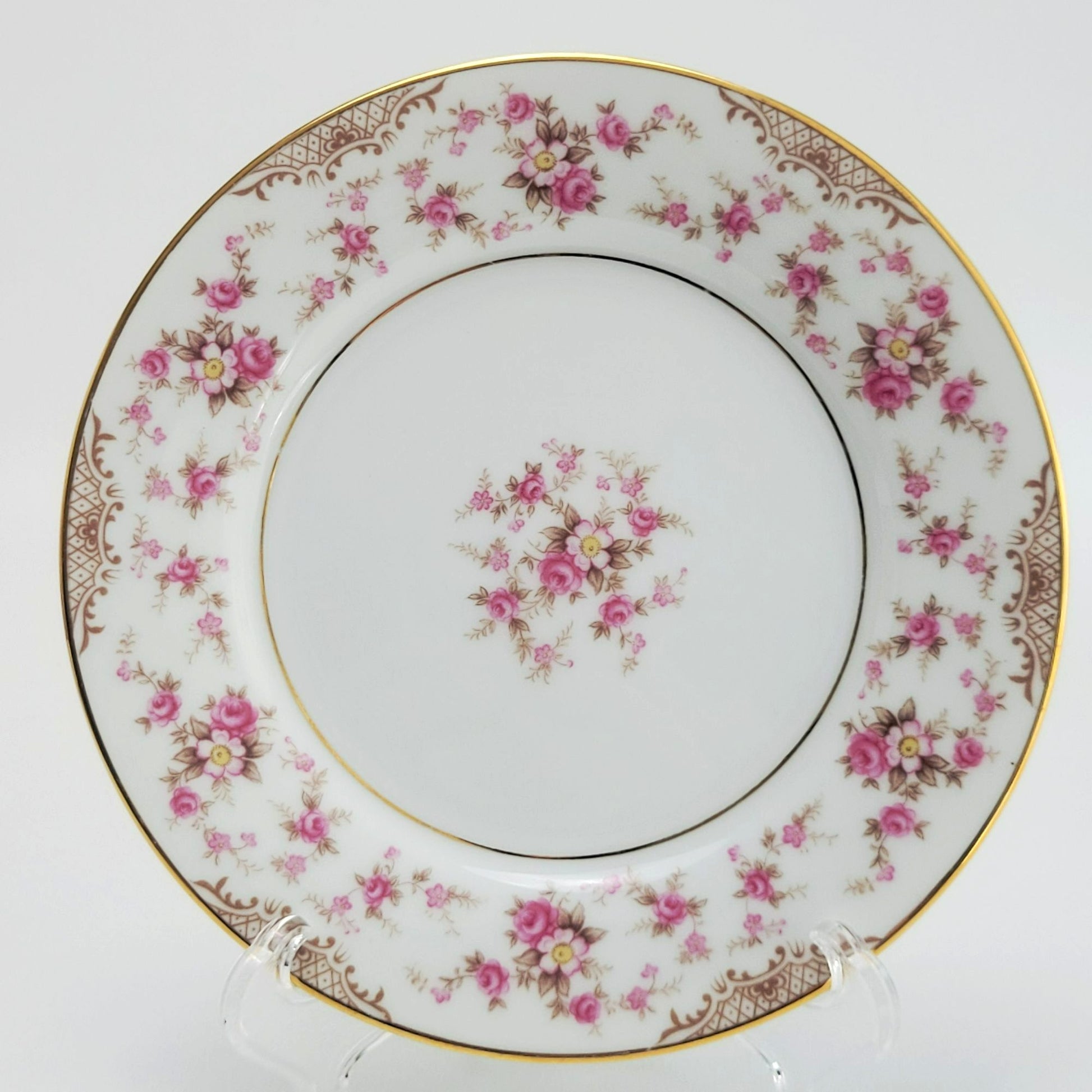 This Noritake Charmaine Bread Plate set of 2, produced between 1954-62 in Japan, exudes vintage elegance with its pink and brown floral pattern and gold trim. Perfect as a replacement china or for any elegant dinnerware collection.