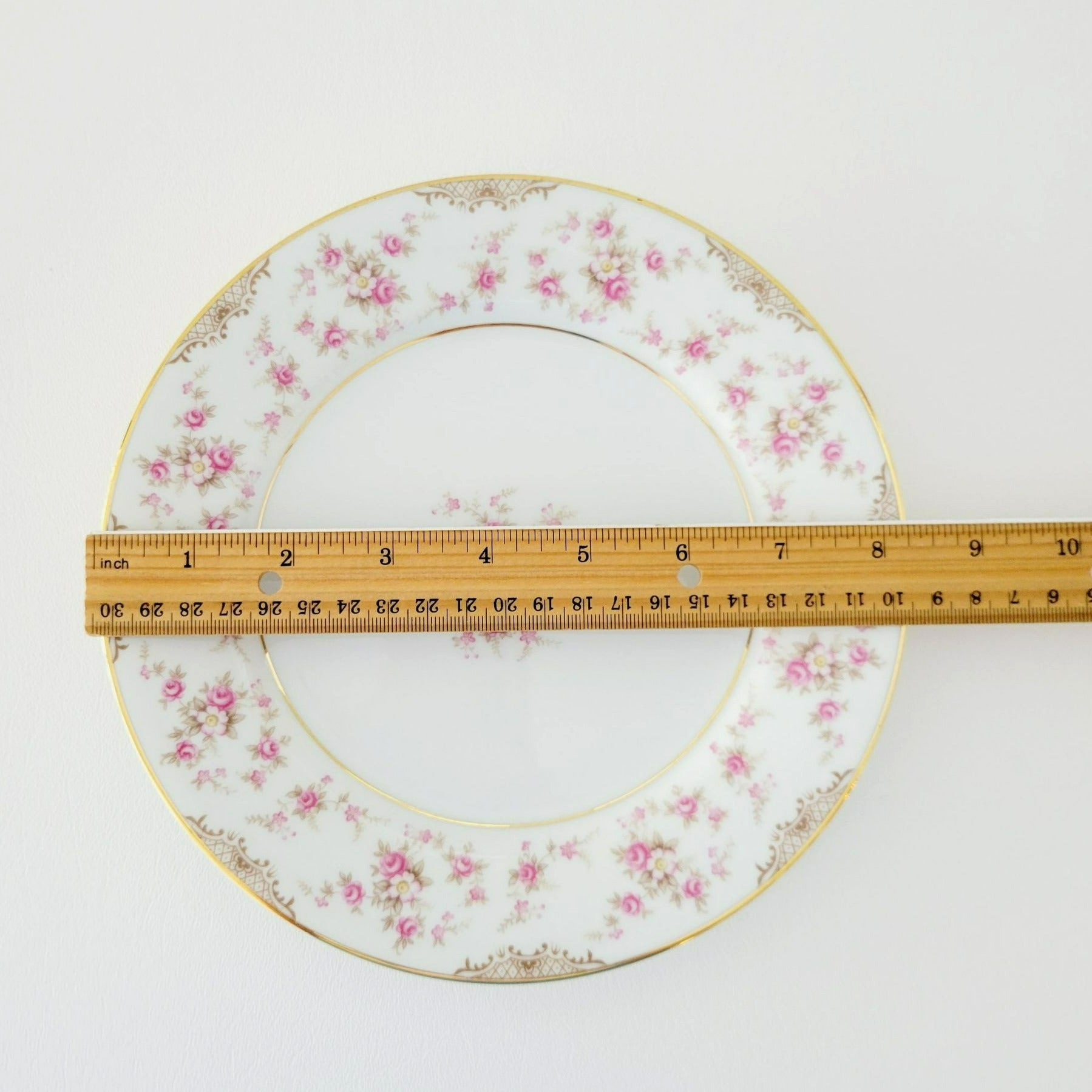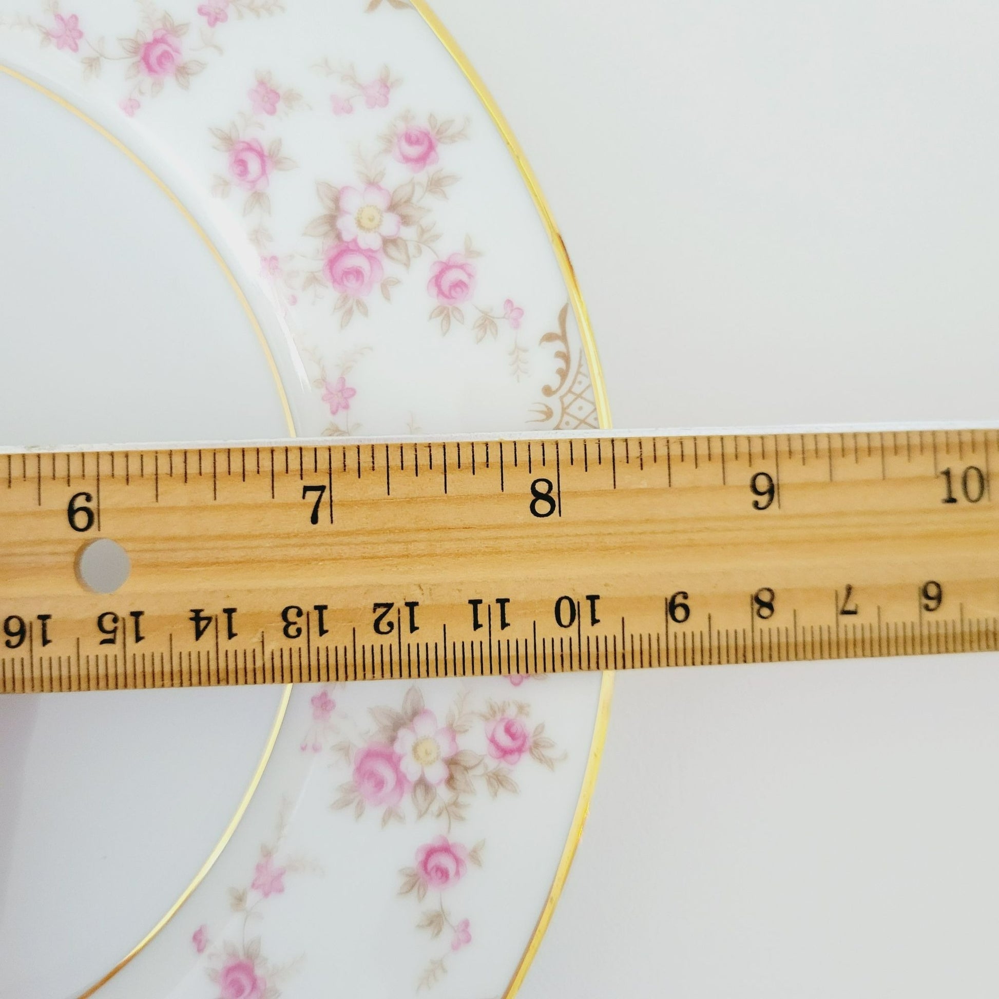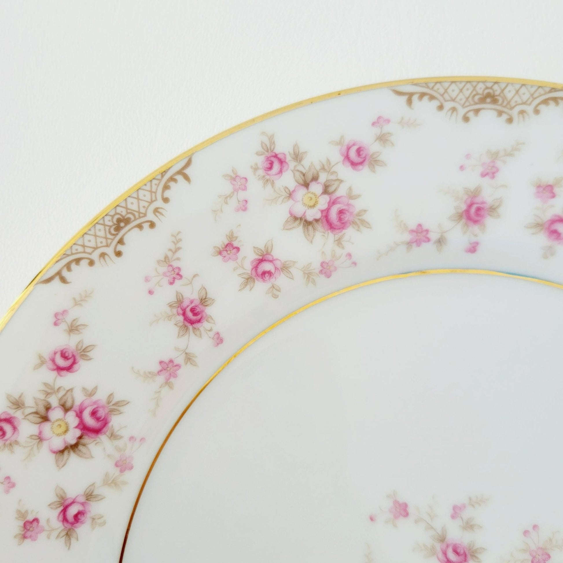 This Noritake Charmaine Salad Plate set of 2, produced between 1954-62 in Japan, exudes vintage elegance with its pink and brown floral pattern and gold trim. Perfect as a replacement china or for any elegant dinnerware collection.