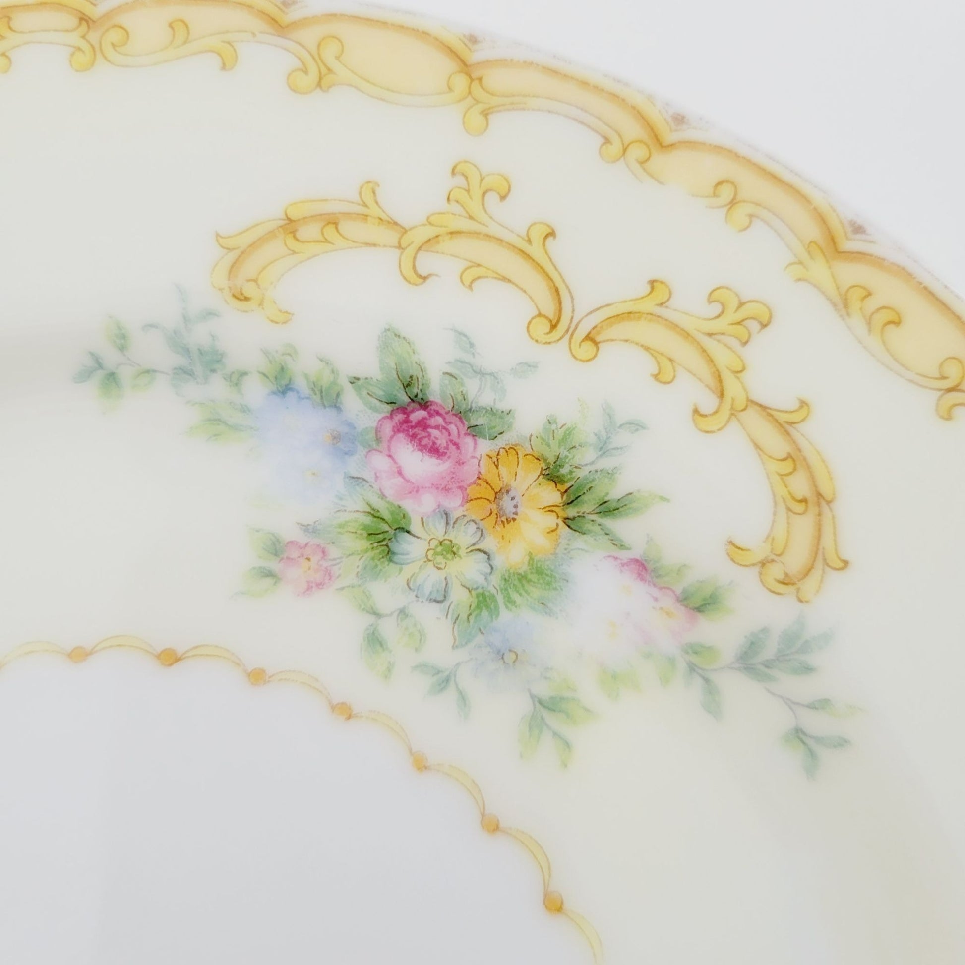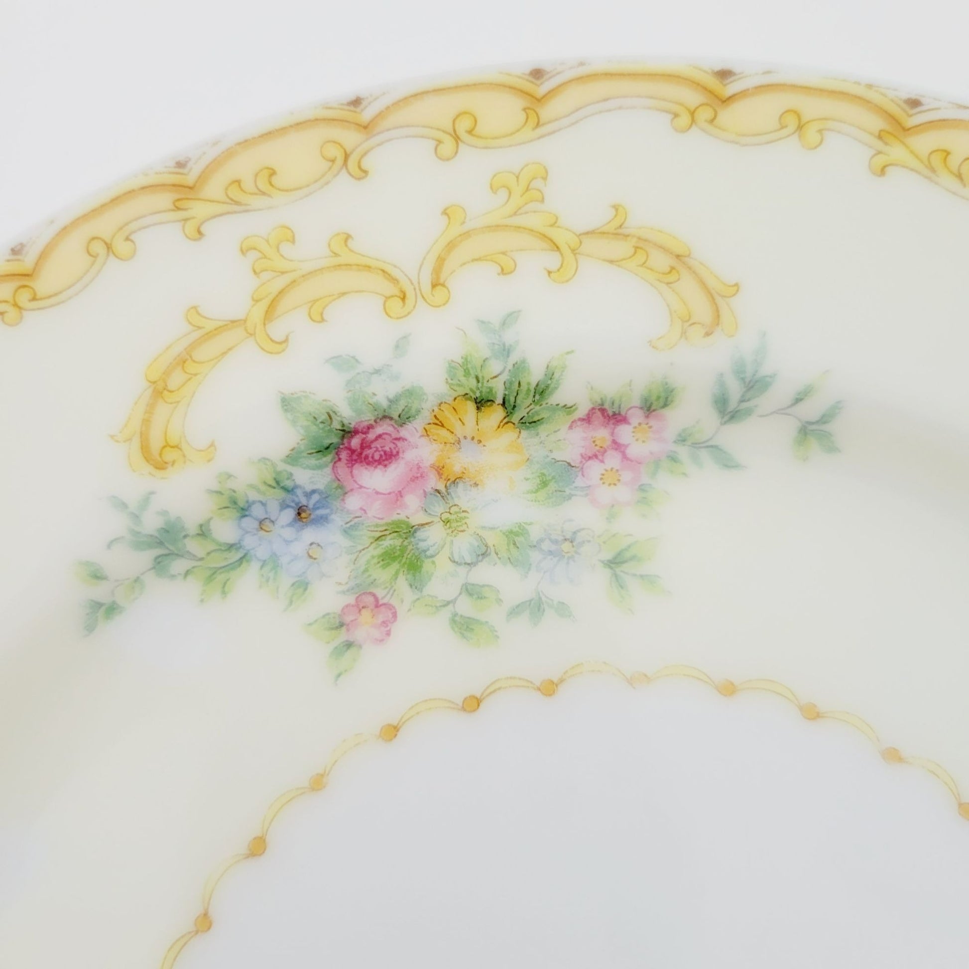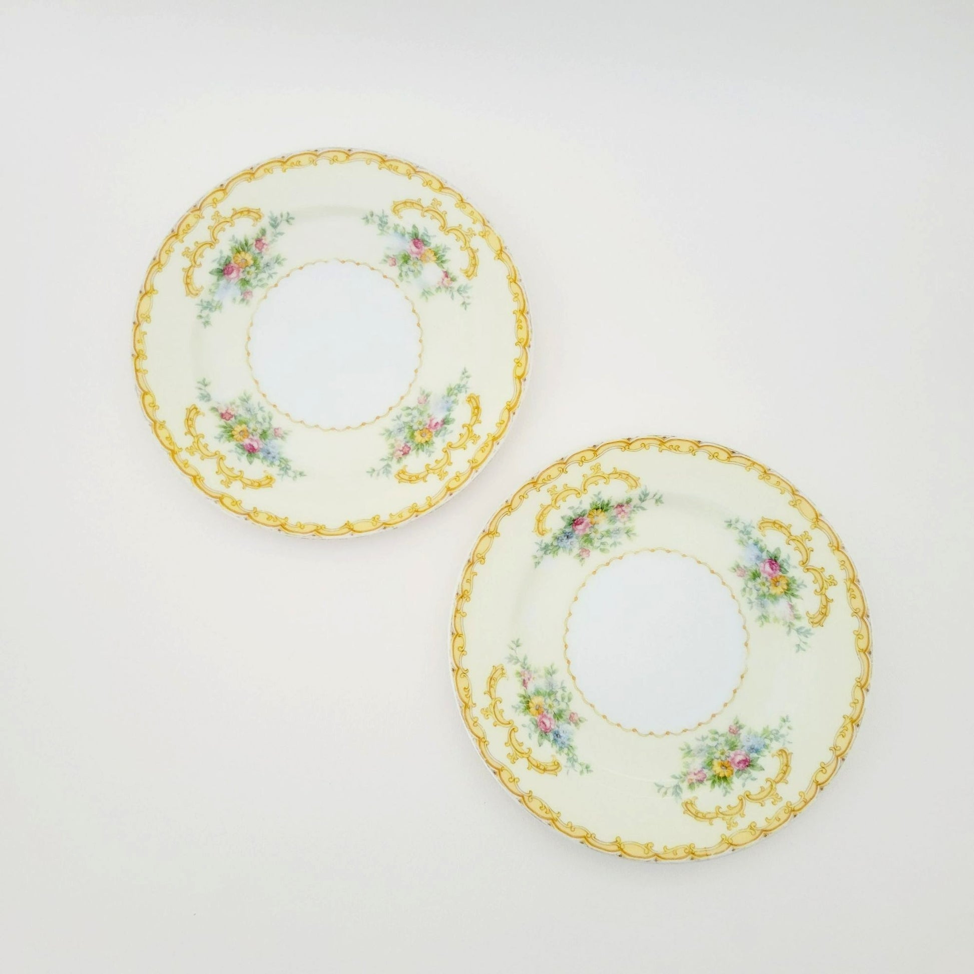 Noritake Charon Salad Plates (2) from 1933-40 Japan are a timeless addition to your dining set. The cream base with yellow scrolls and multicolor floral designs on bone china adds a vintage touch to your table settings.