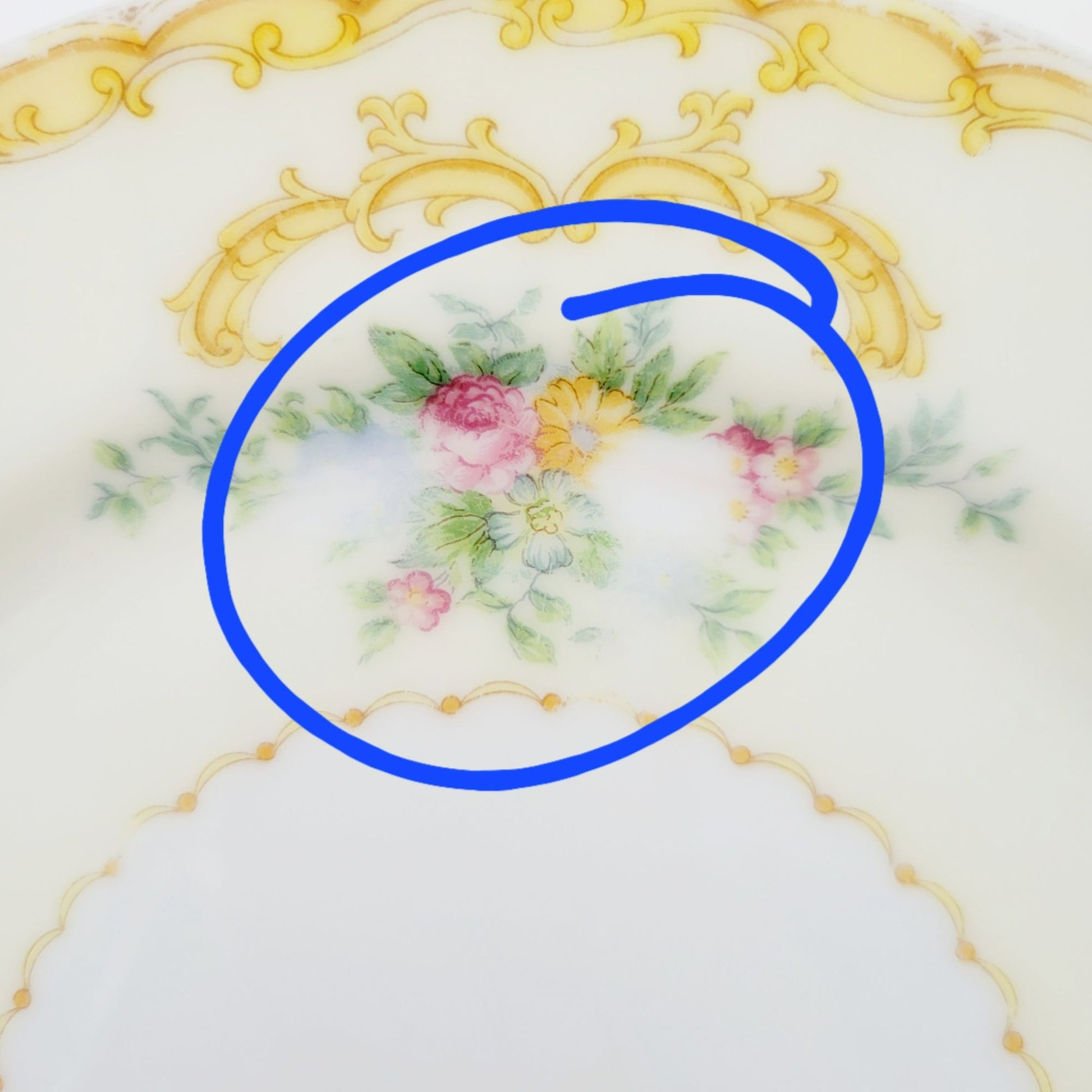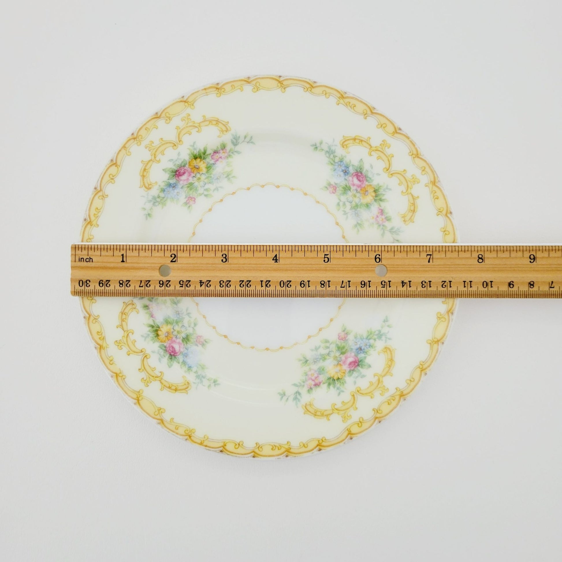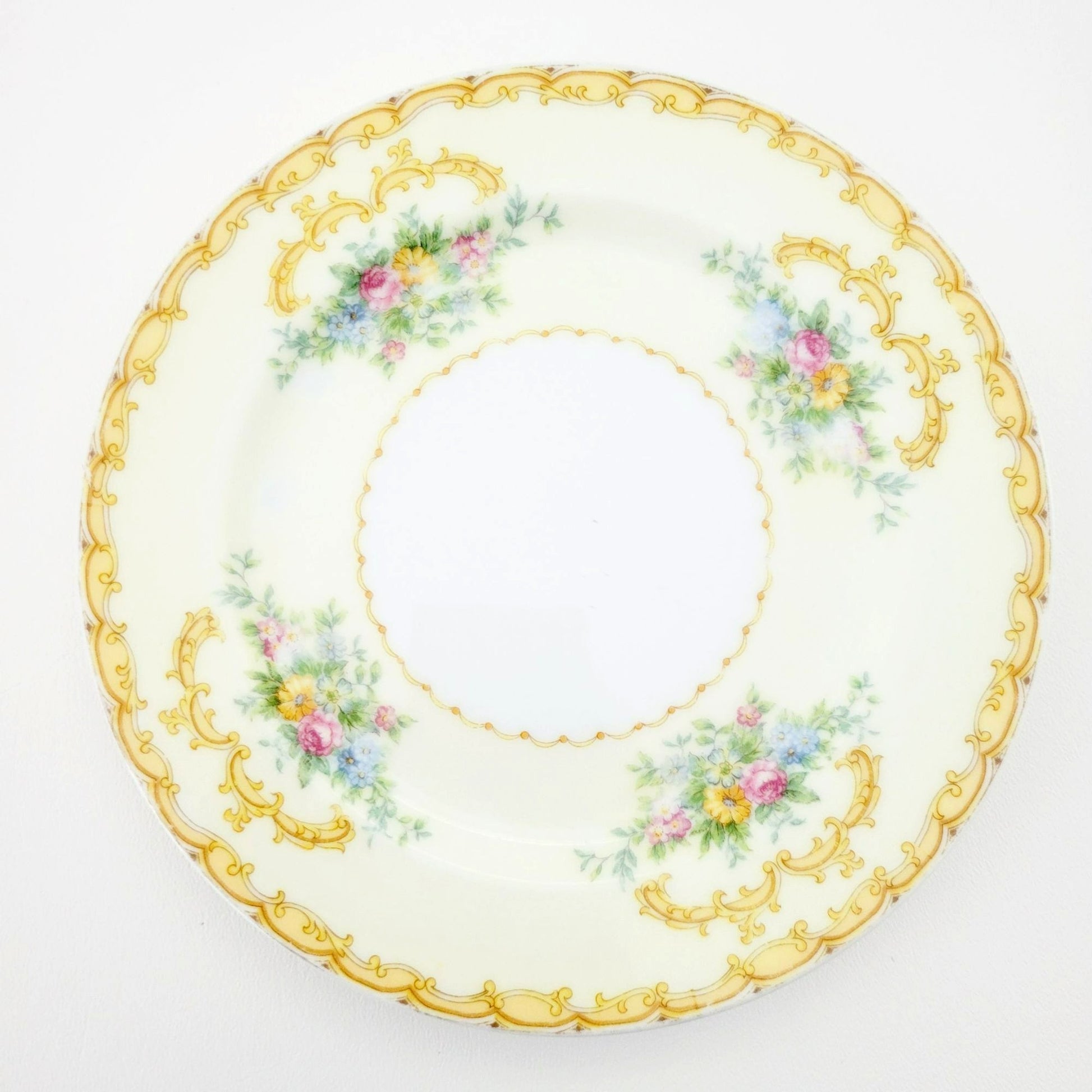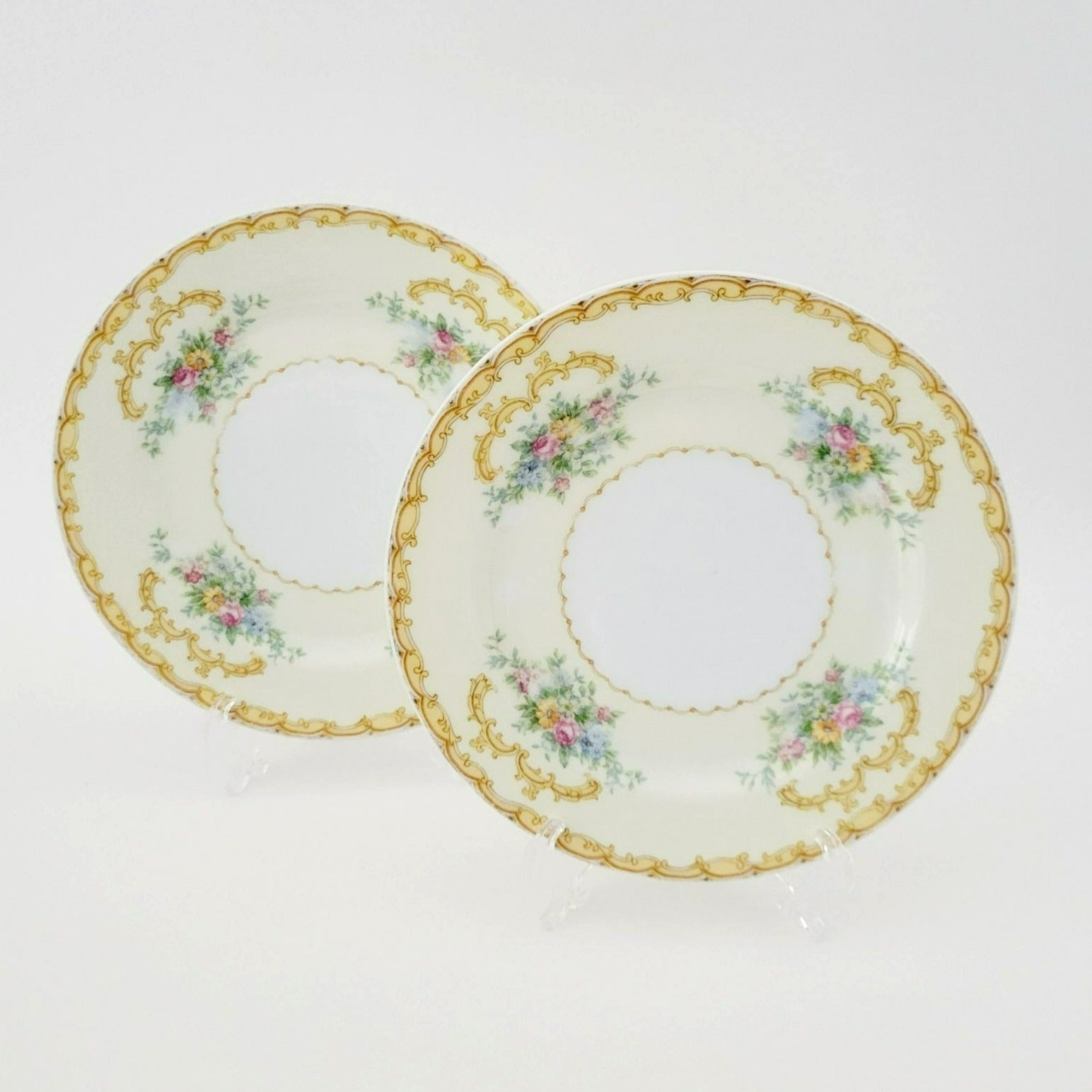 Noritake Charon Salad Plates (2) from 1933-40 Japan are a timeless addition to your dining set. The cream base with yellow scrolls and multicolor floral designs on bone china adds a vintage touch to your table settings.