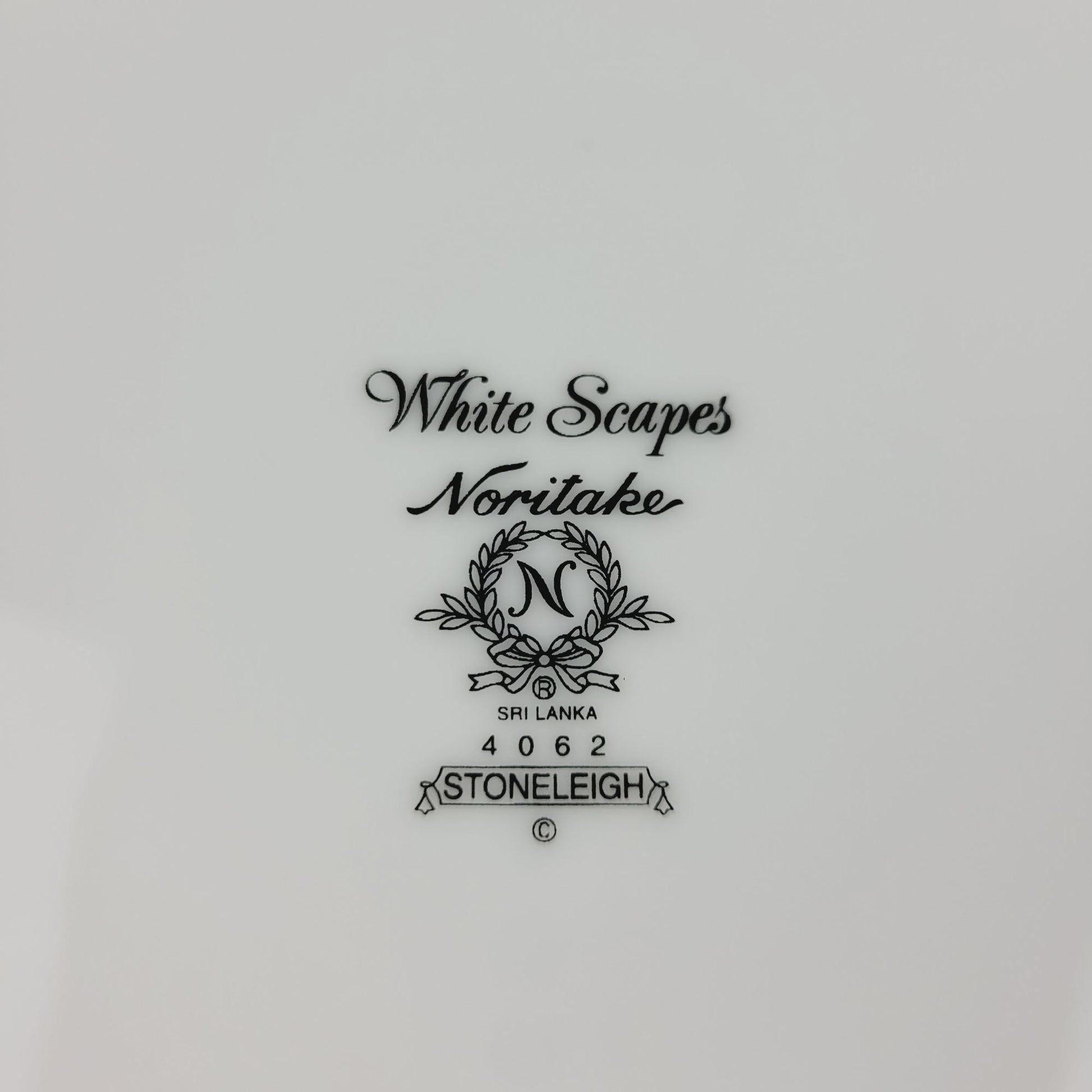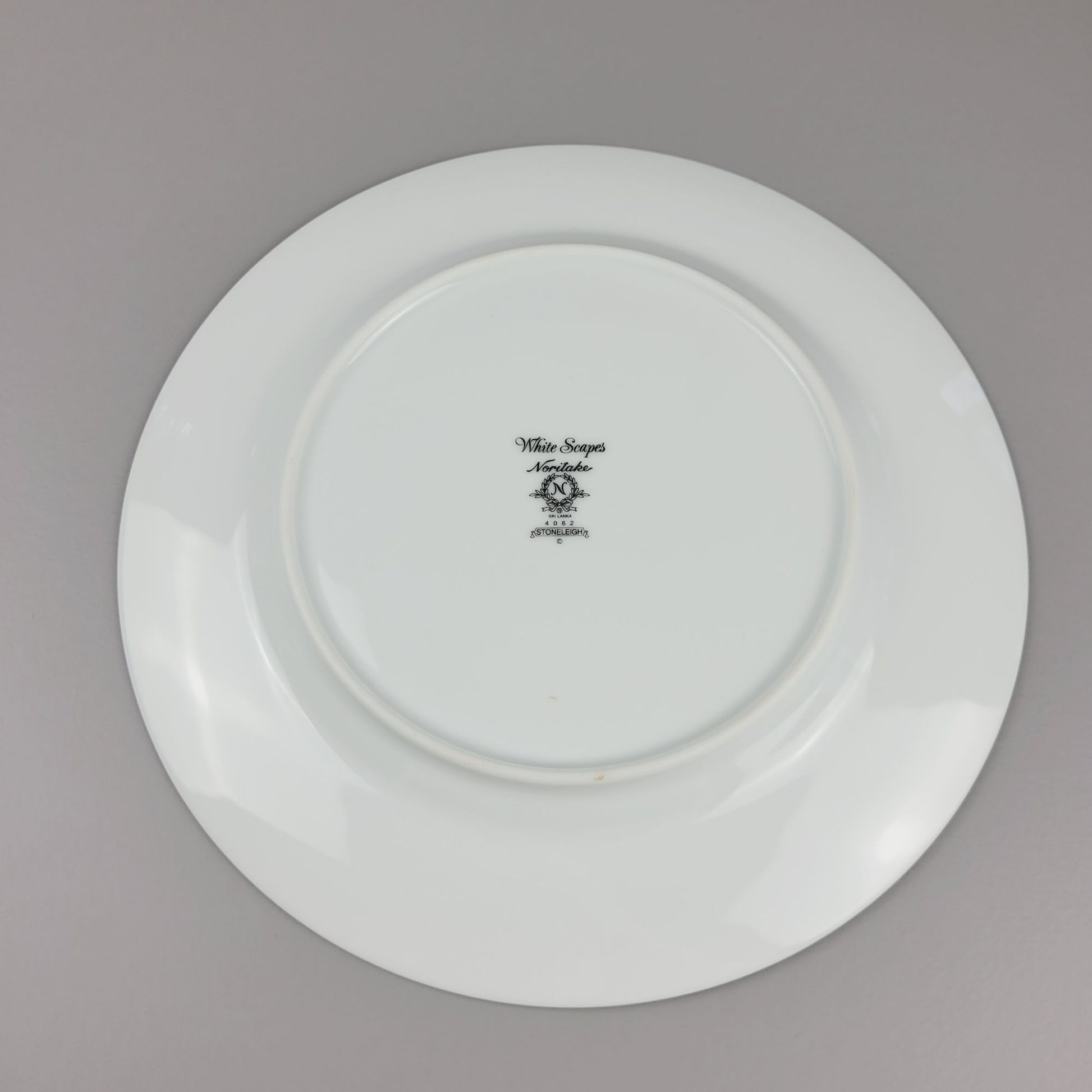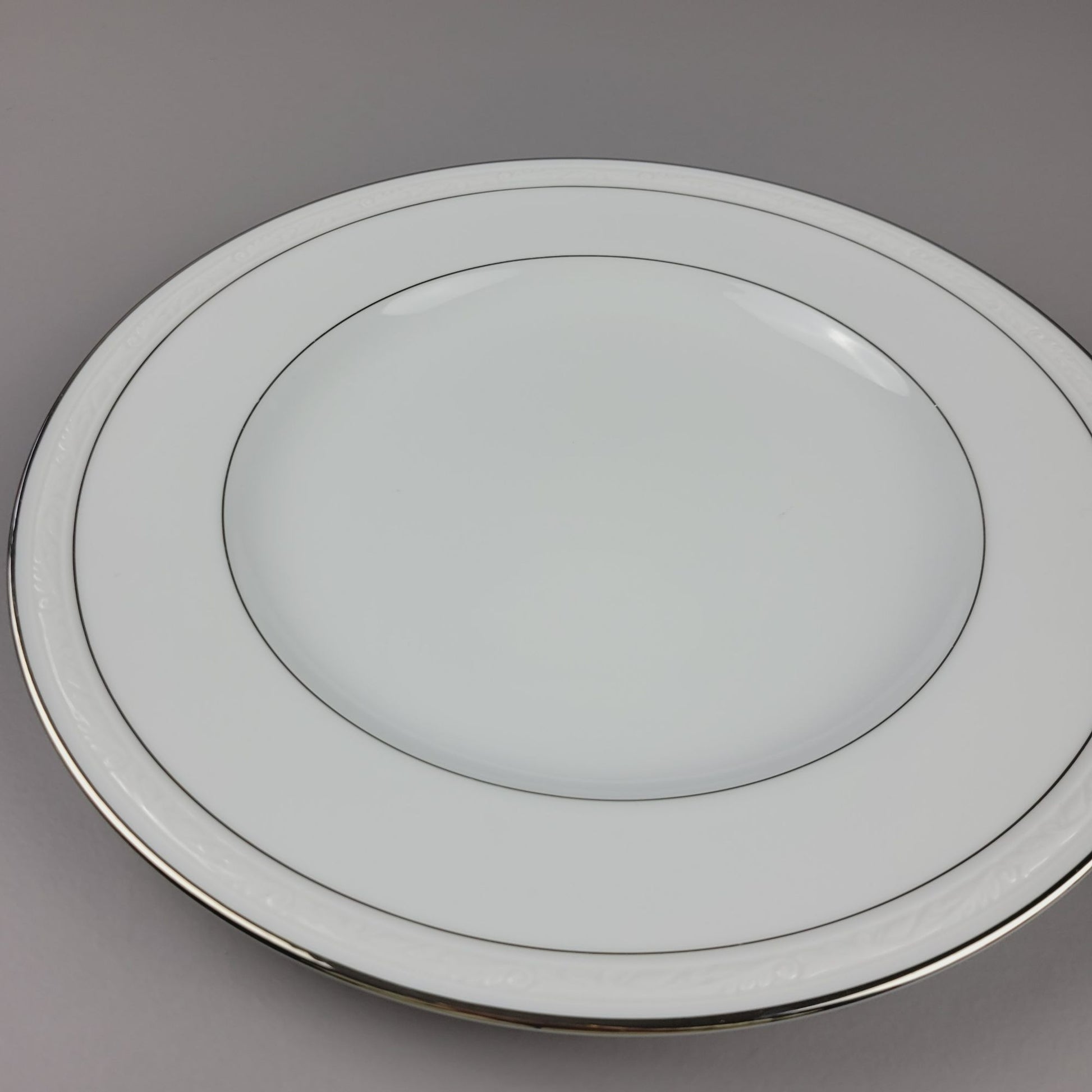 This Noritake dinner plate embodies a timeless elegance with its classic white porcelain, delicate embossing, and refined platinum trim. Its vintage charm makes it a distinguished addition to any dining collection, reflecting the artistry and craftsmanship synonymous with Noritake's heritage.